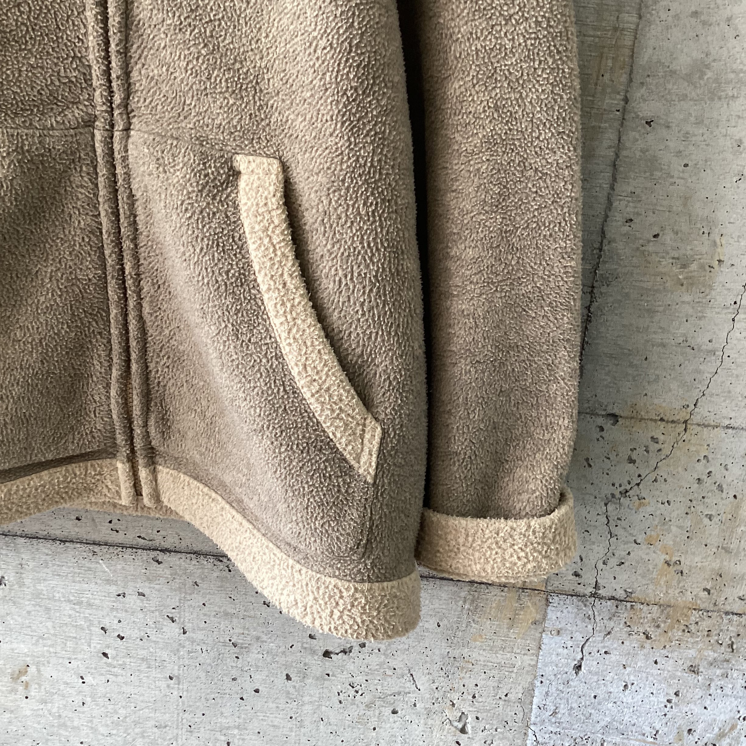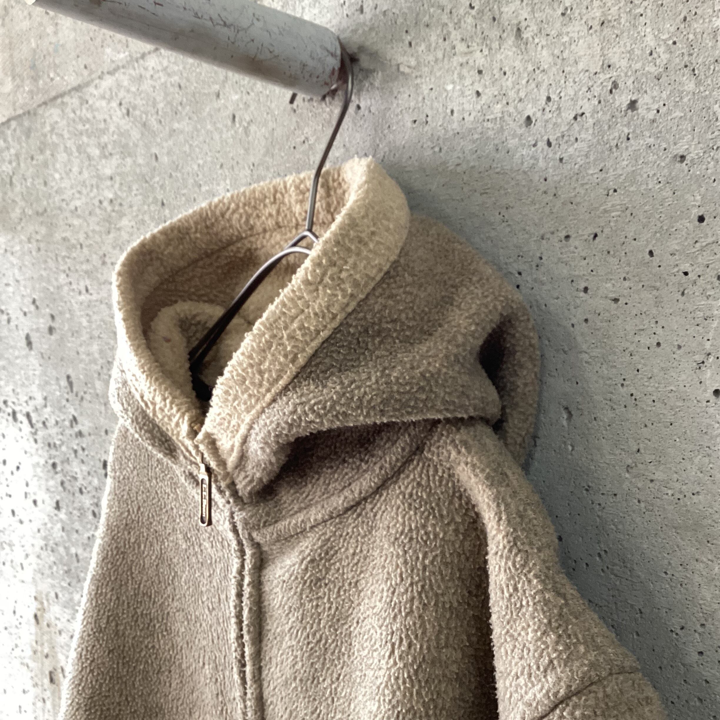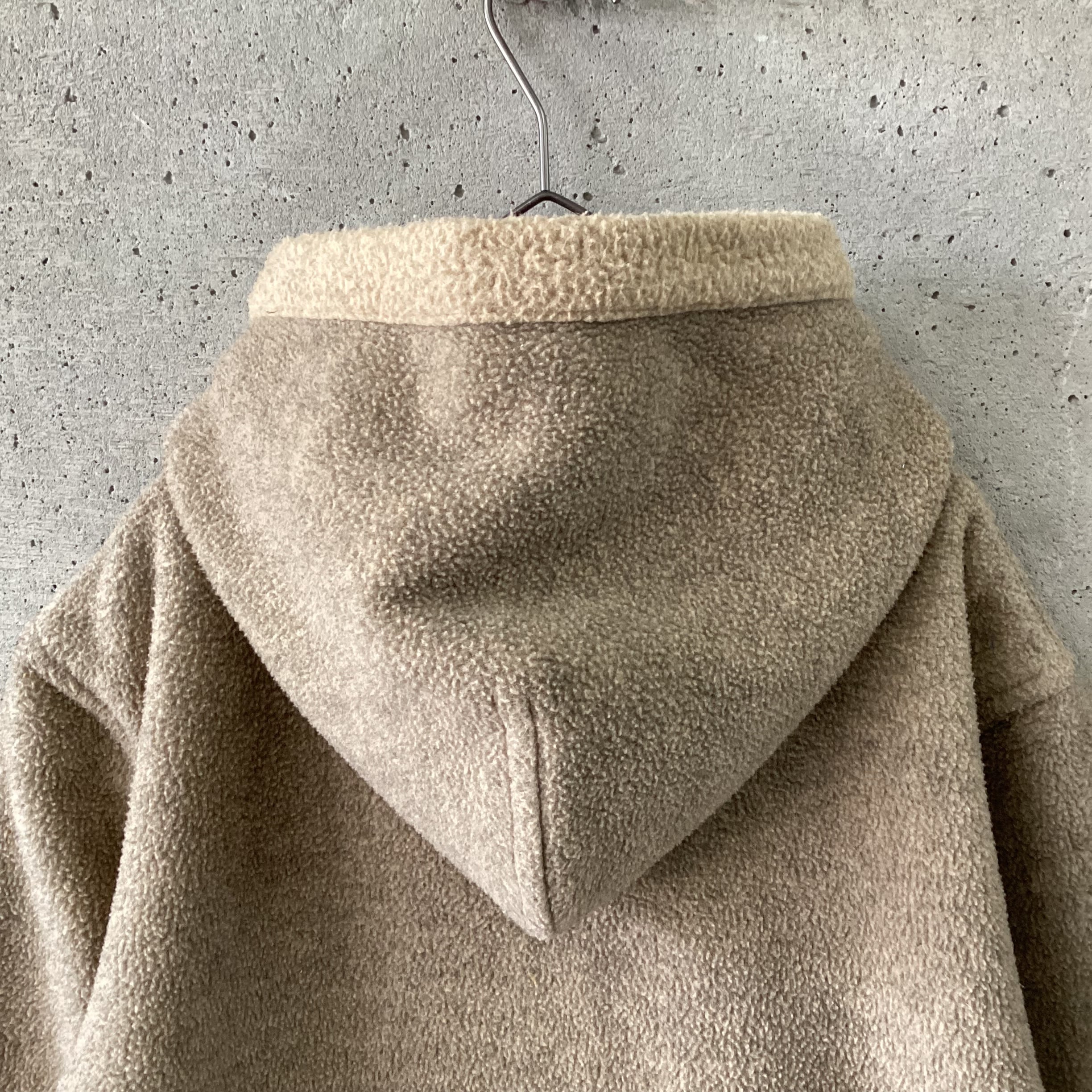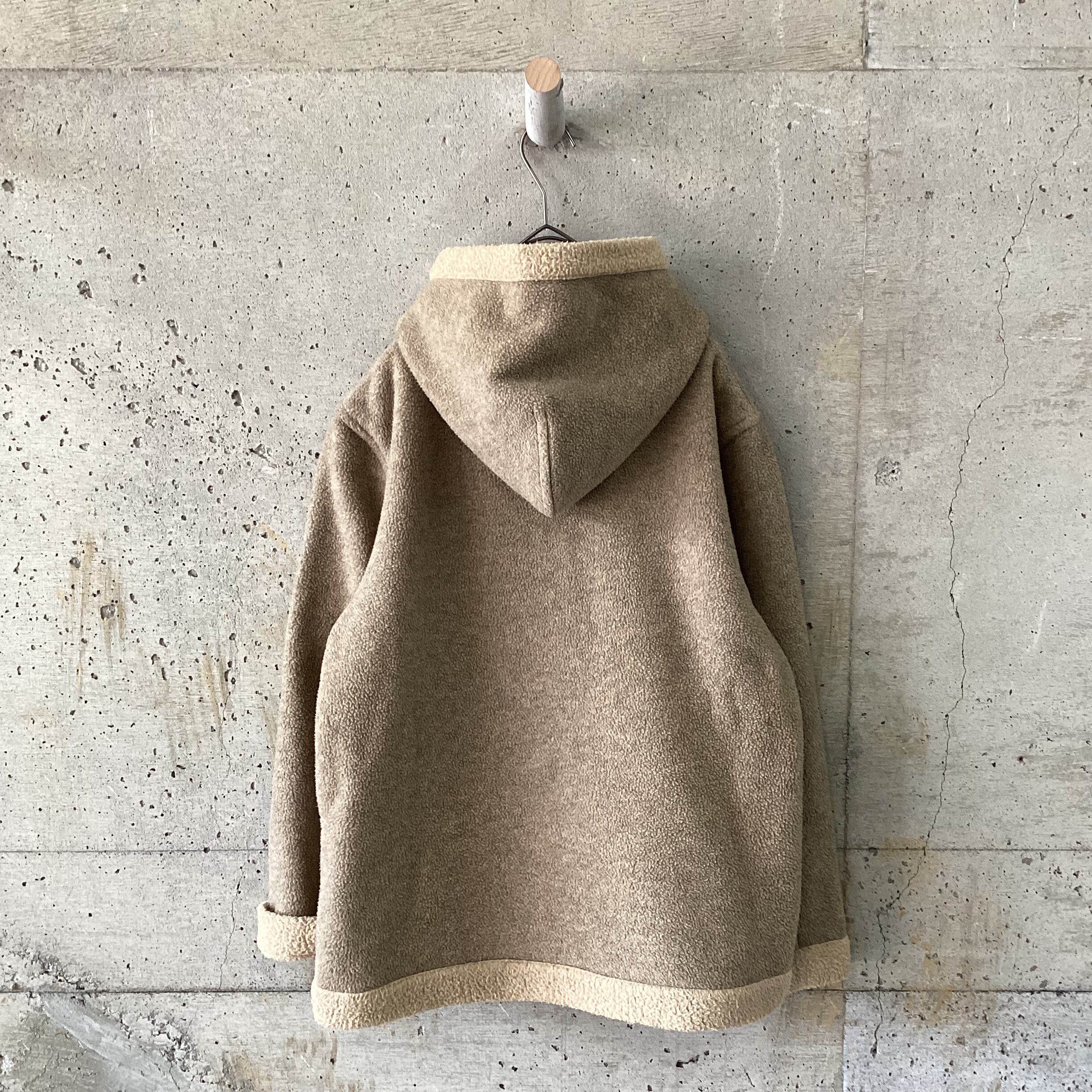 フードやポケット、袖口の縁にはベージュの切り替えが施され、控えめなアクセントになっています。