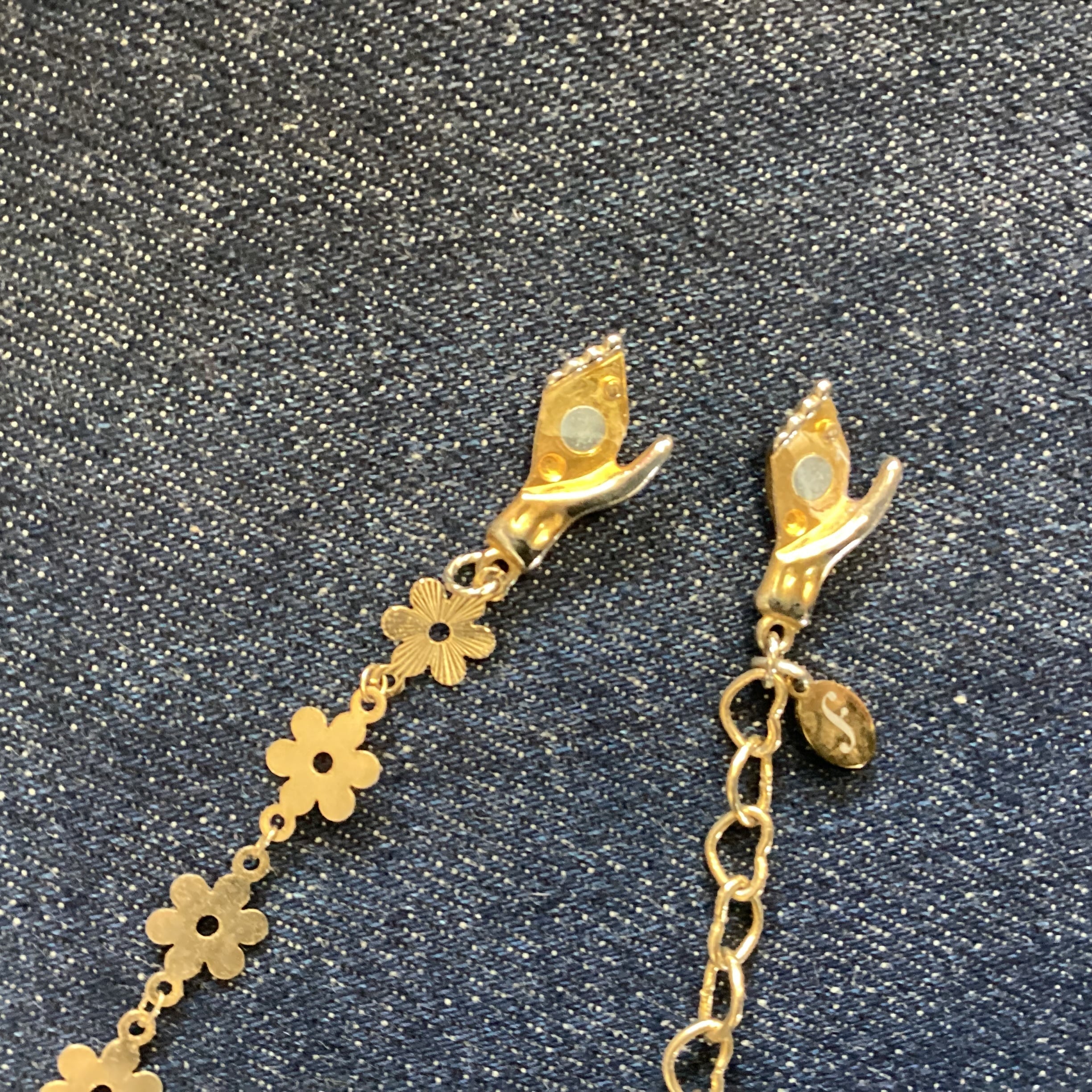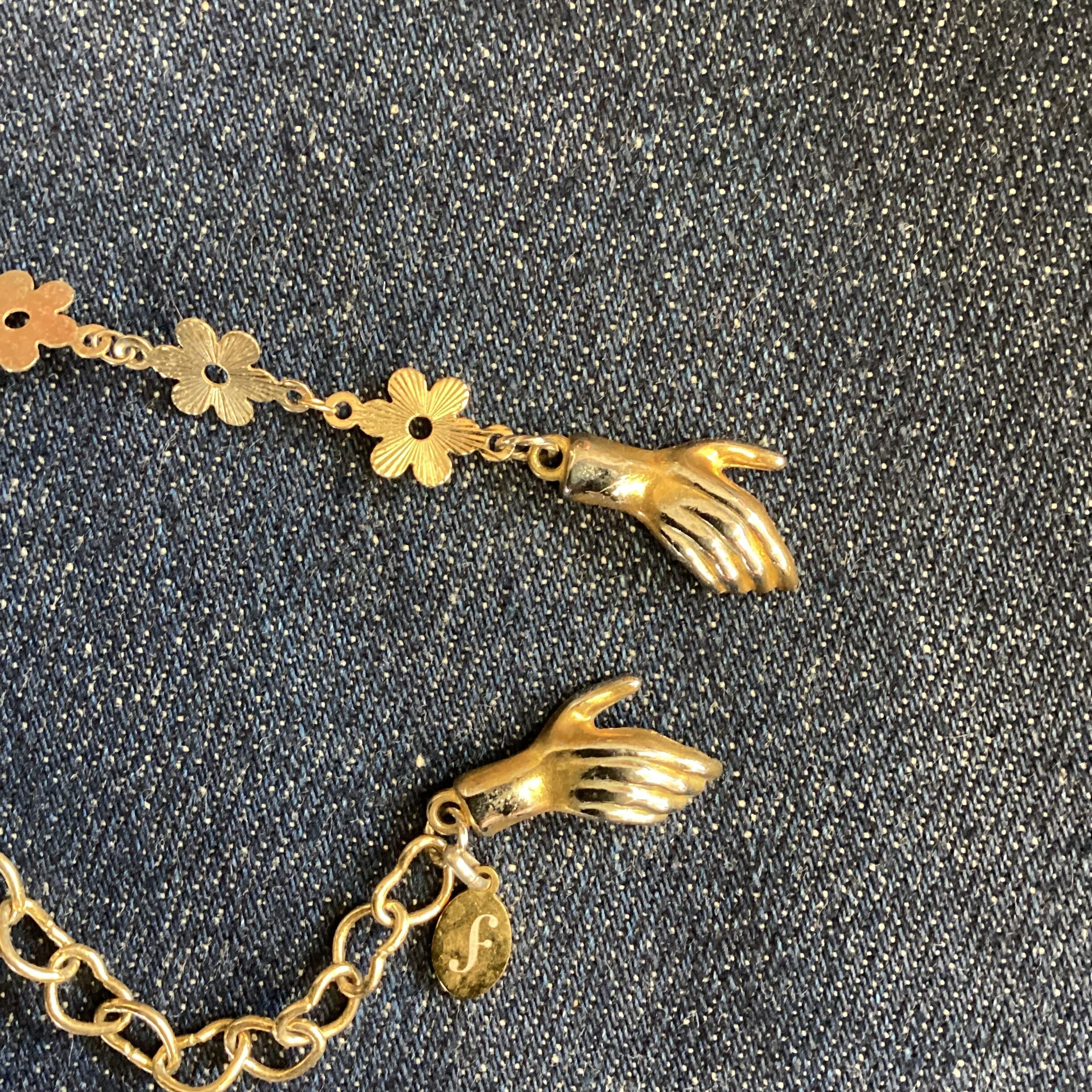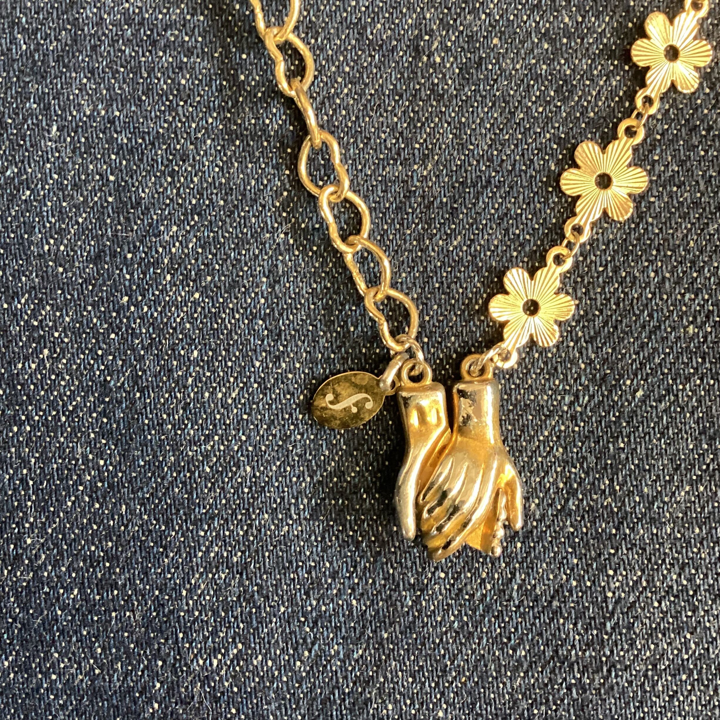 このネックレスはお花とハートのチェーンがとても可愛らしく、握手しているヘッドが特徴的です。