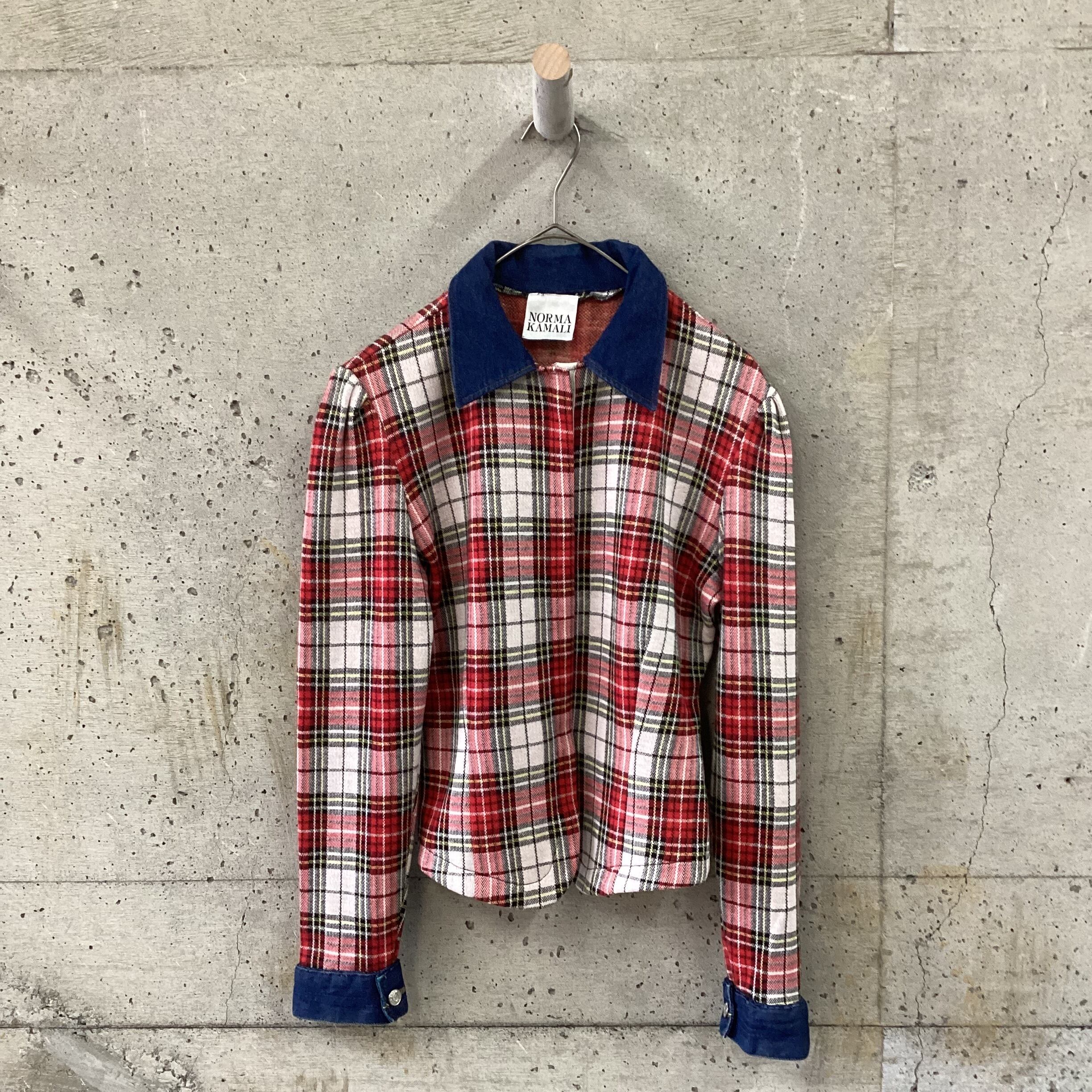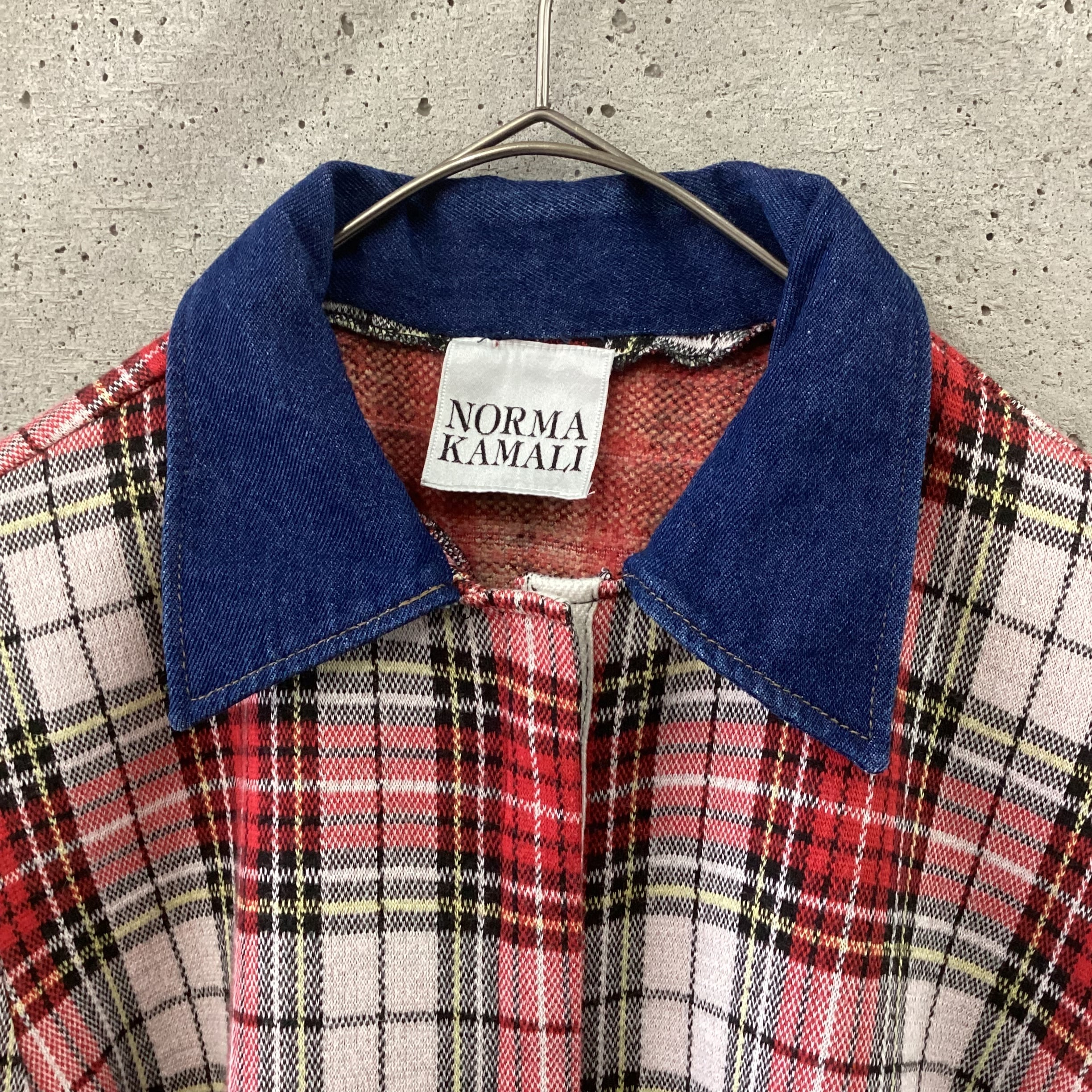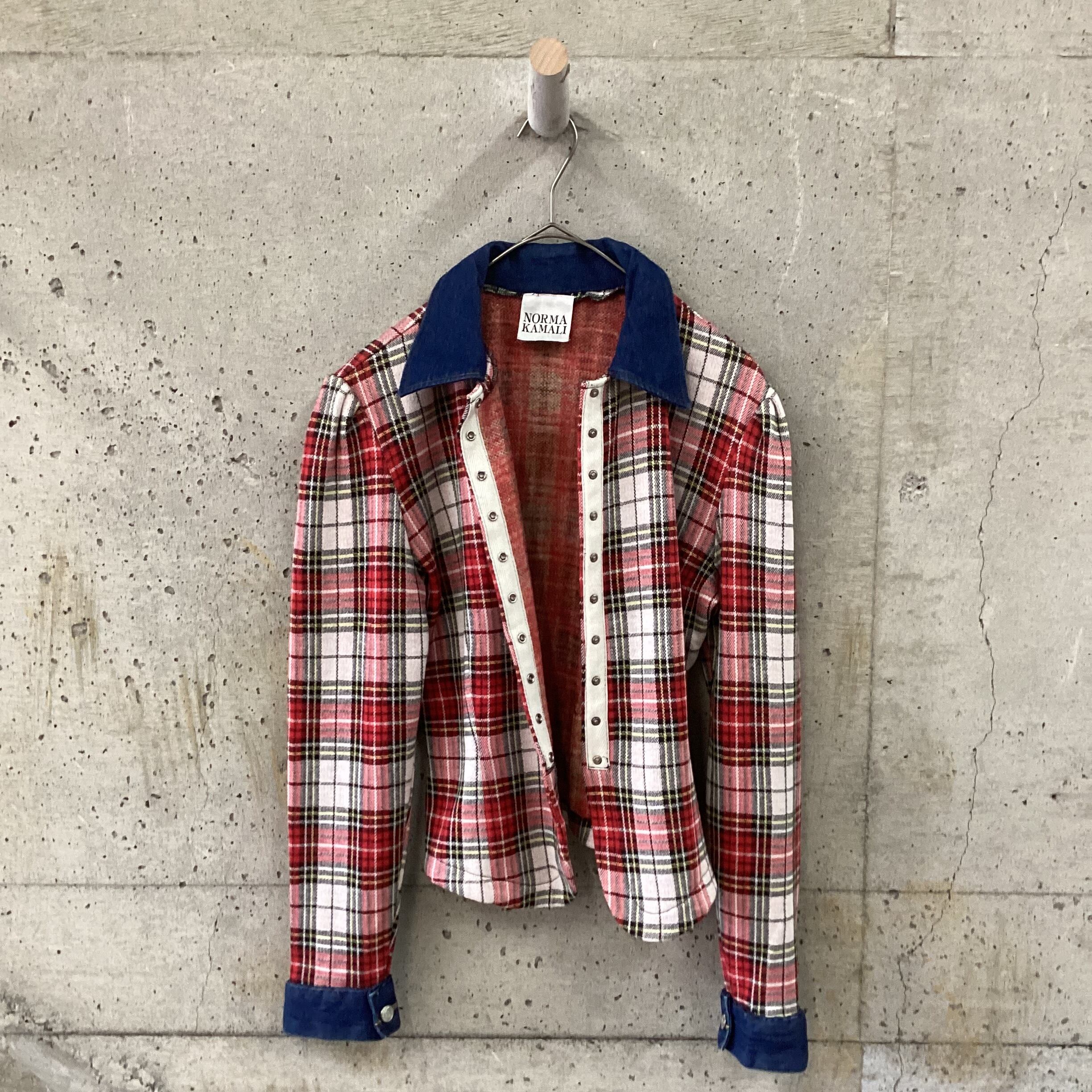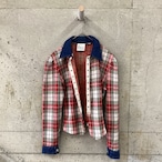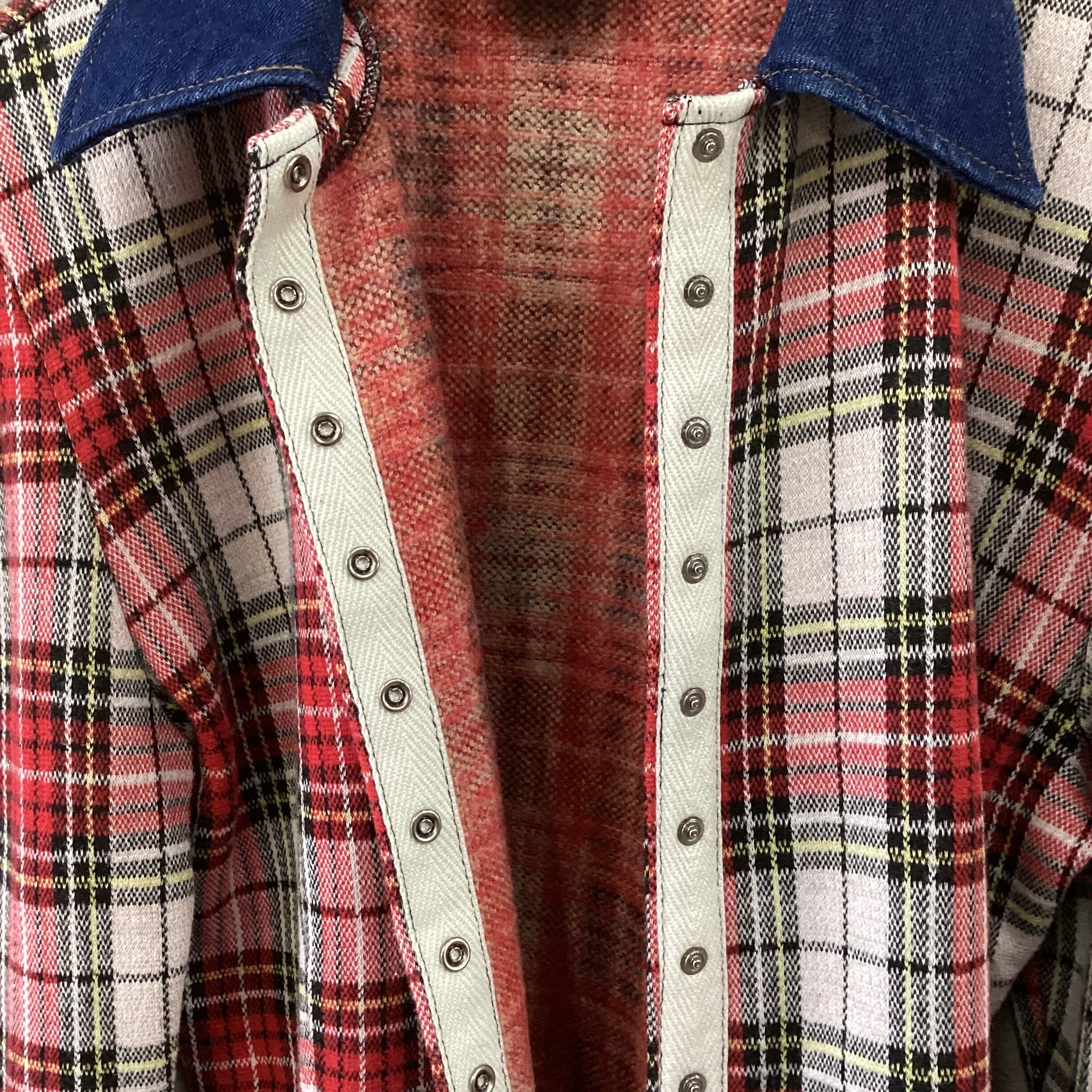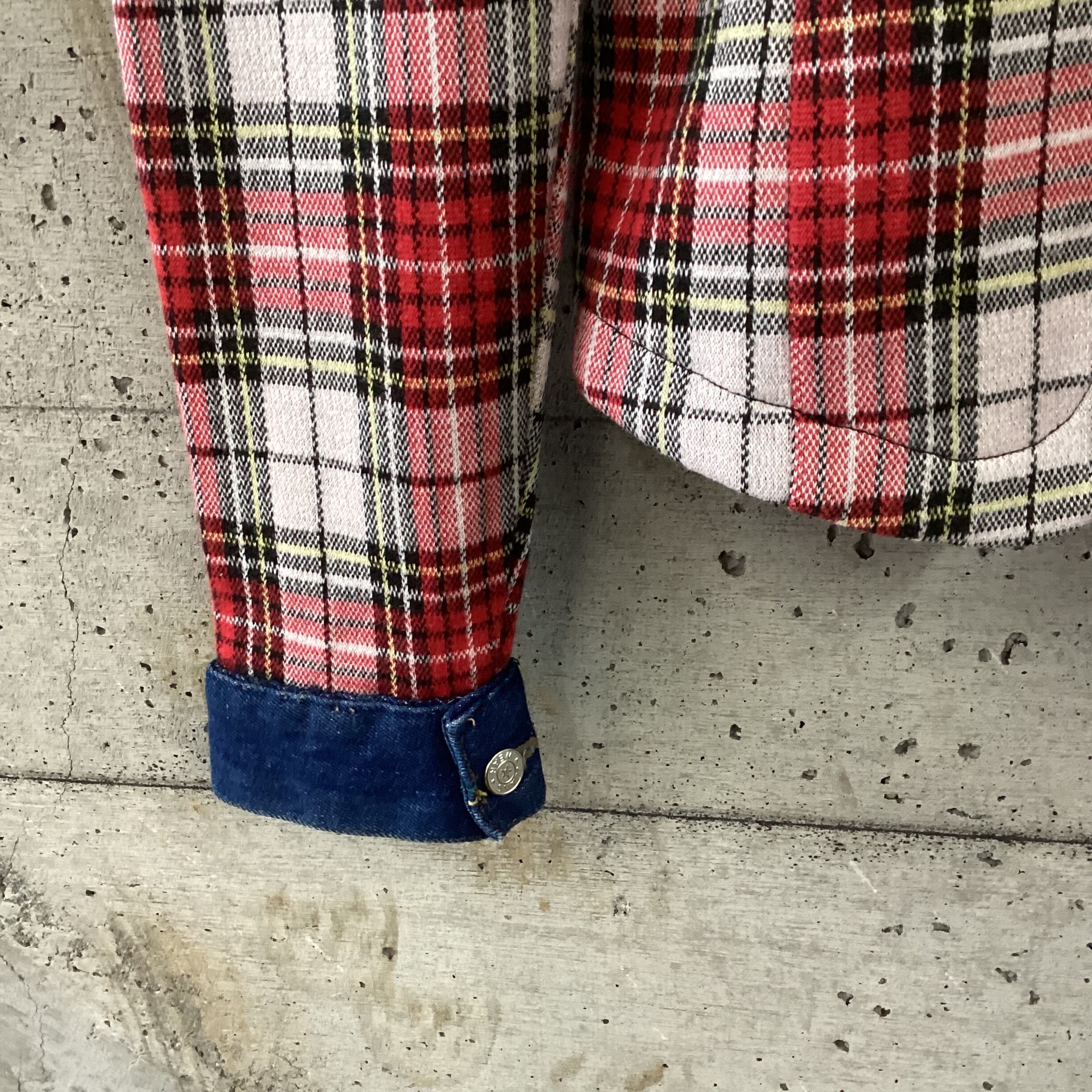 襟とカフスの濃紺デニム生地の切り替えがとても可愛く、カジュアルな雰囲気を醸します。