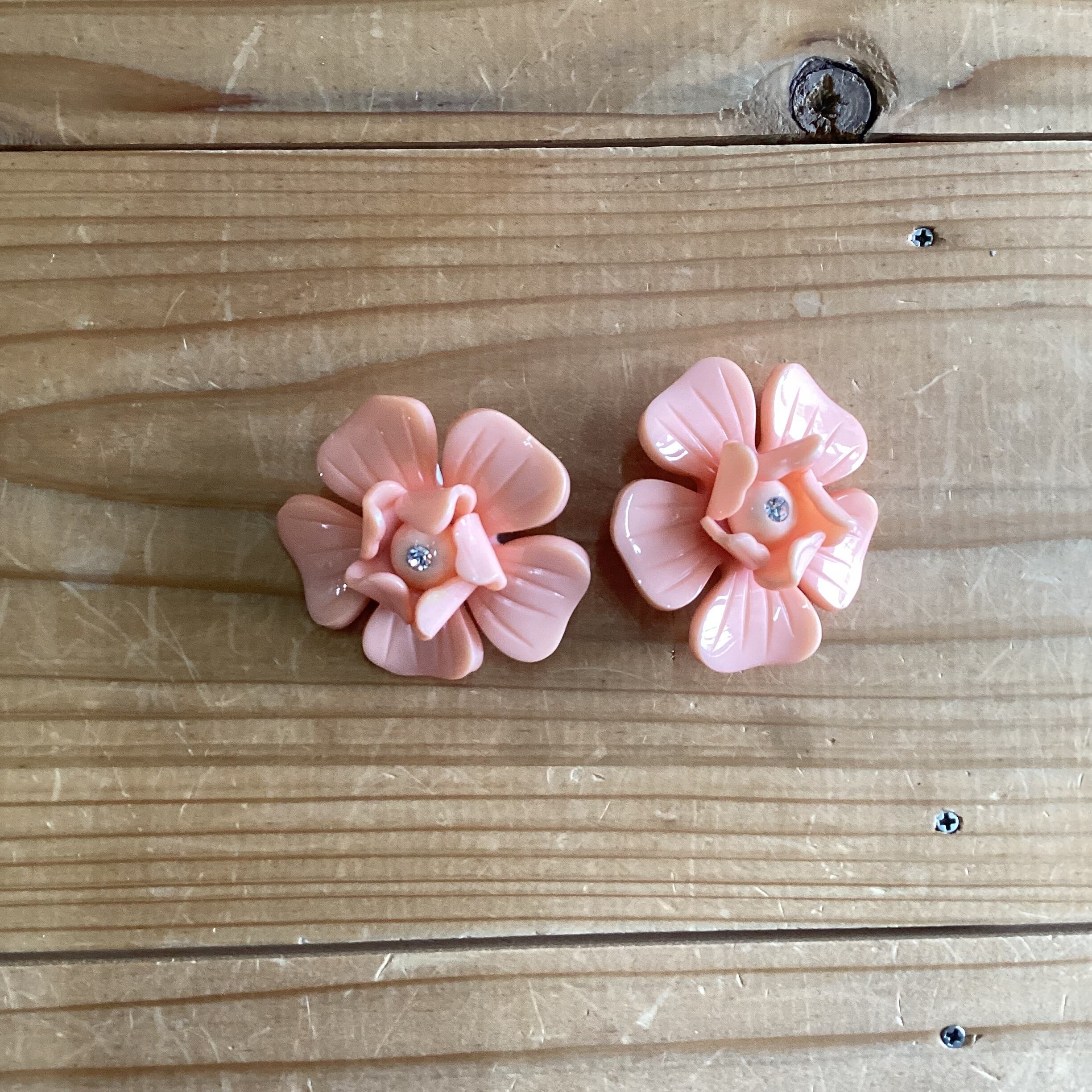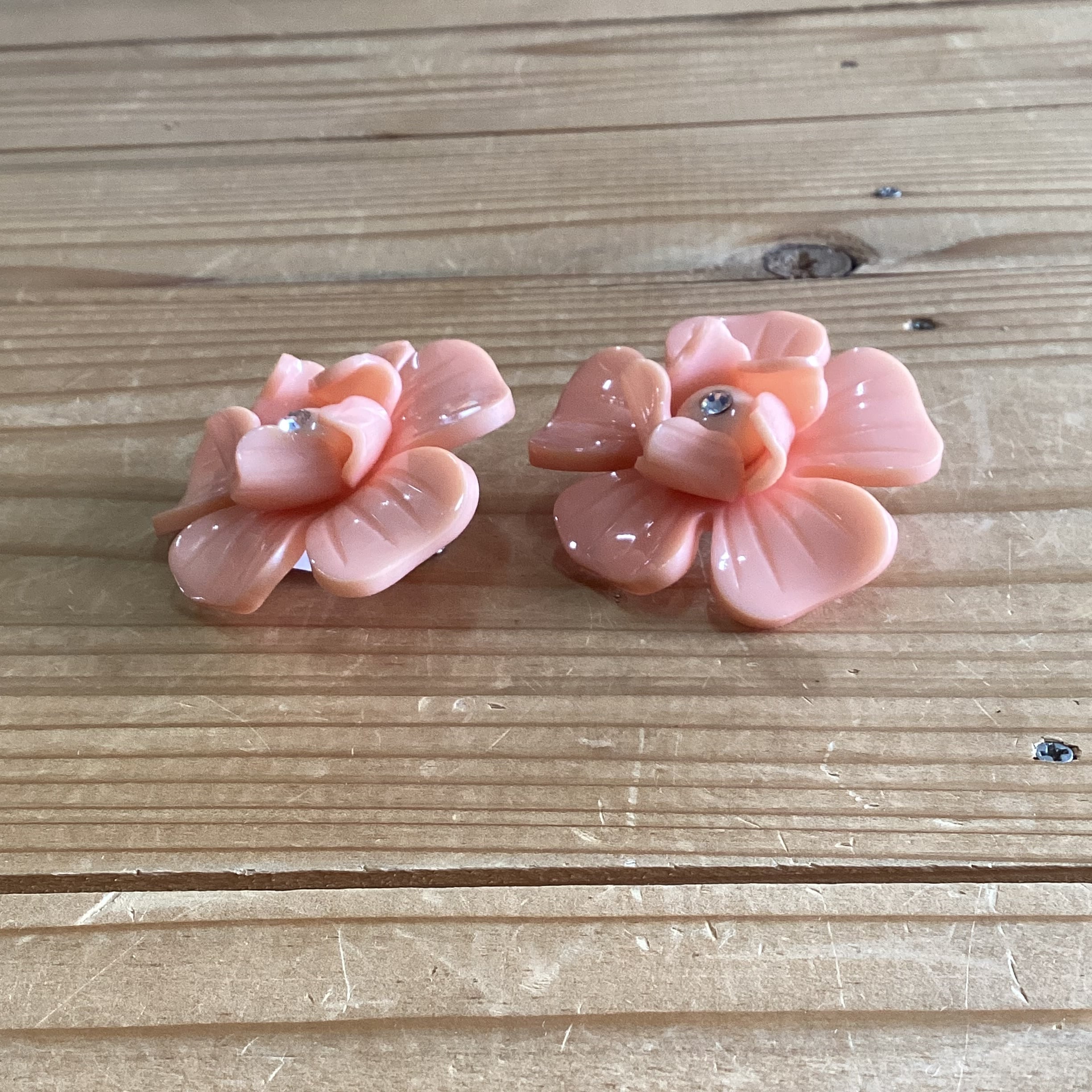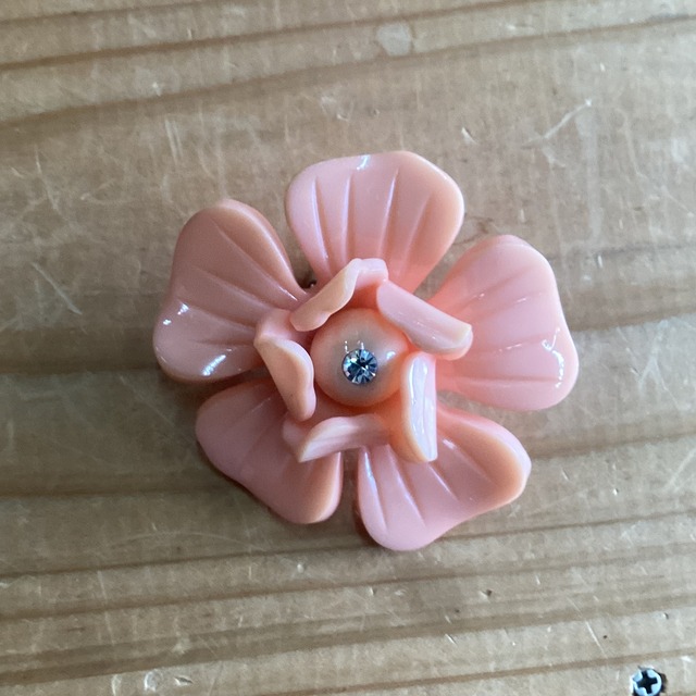 コーラルピンクの花びらの中心には大ぶりなストーンが埋め込まれていて、キラキラと輝きます。