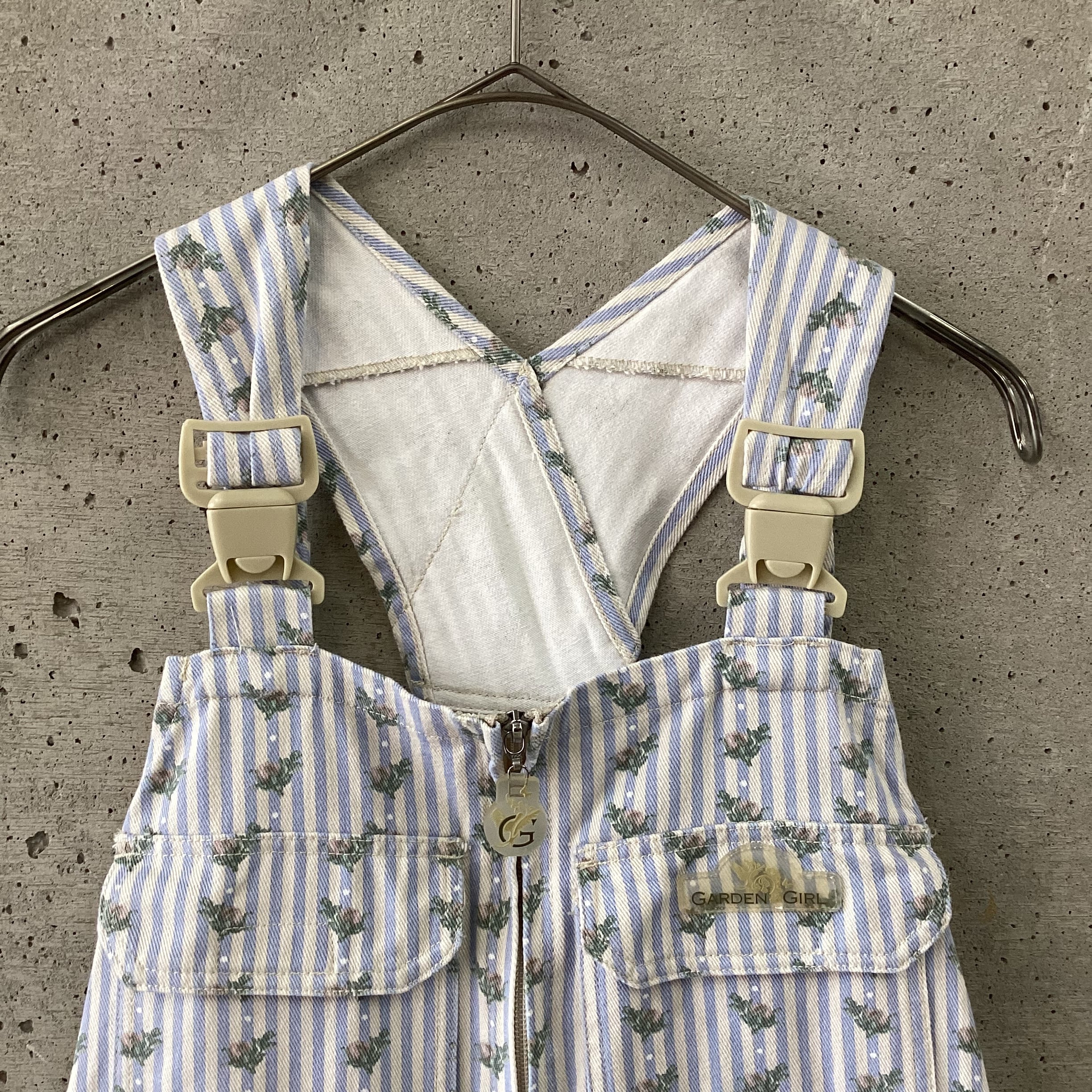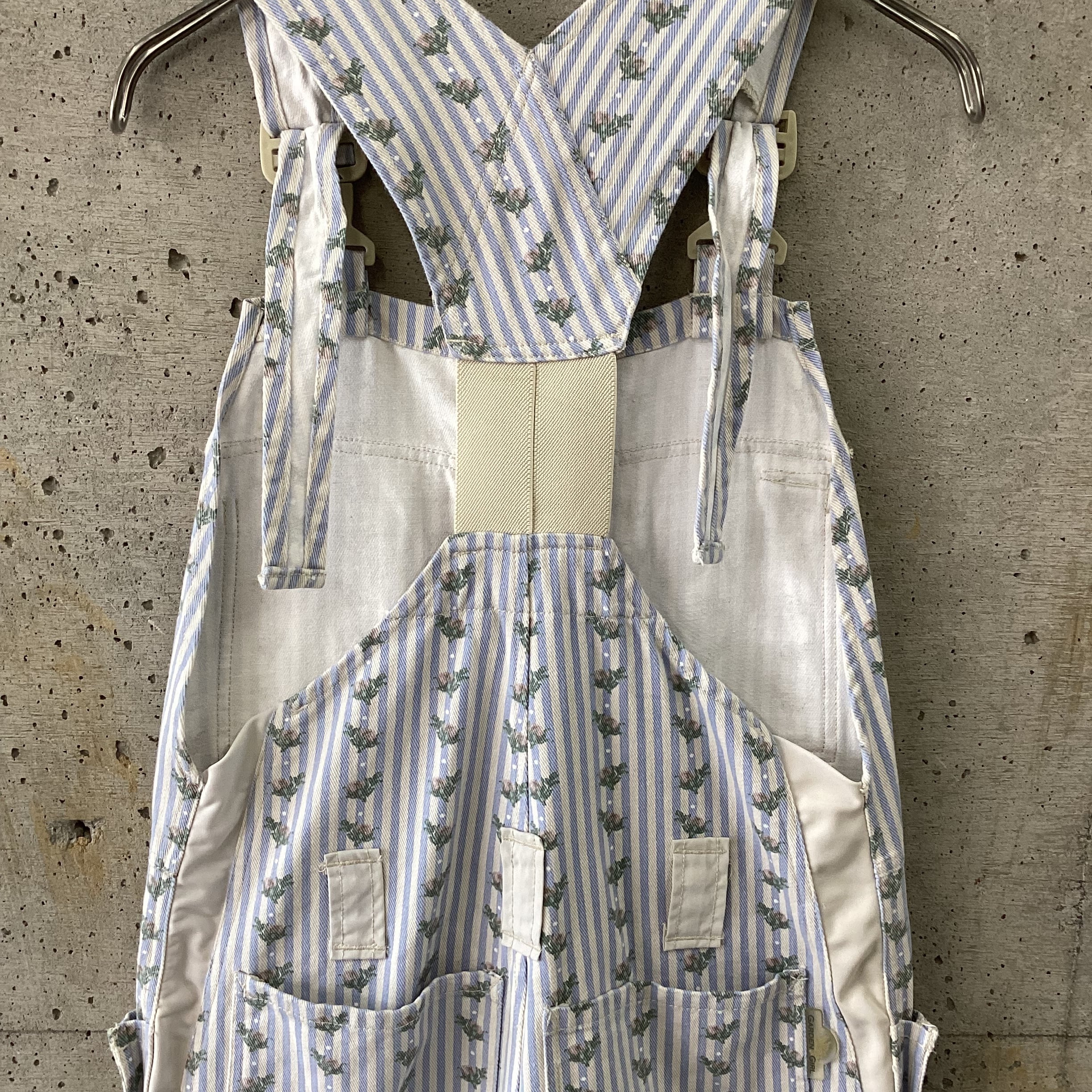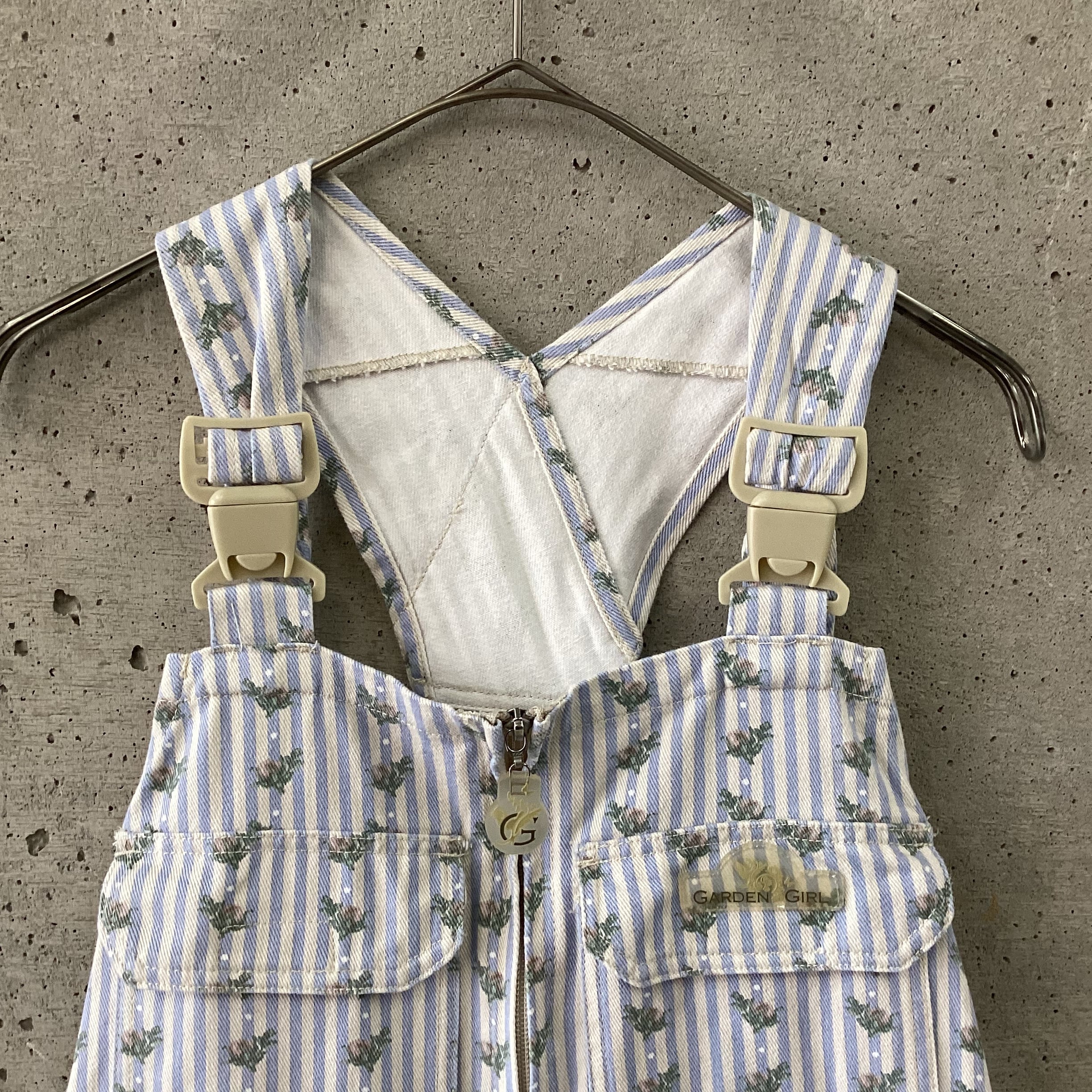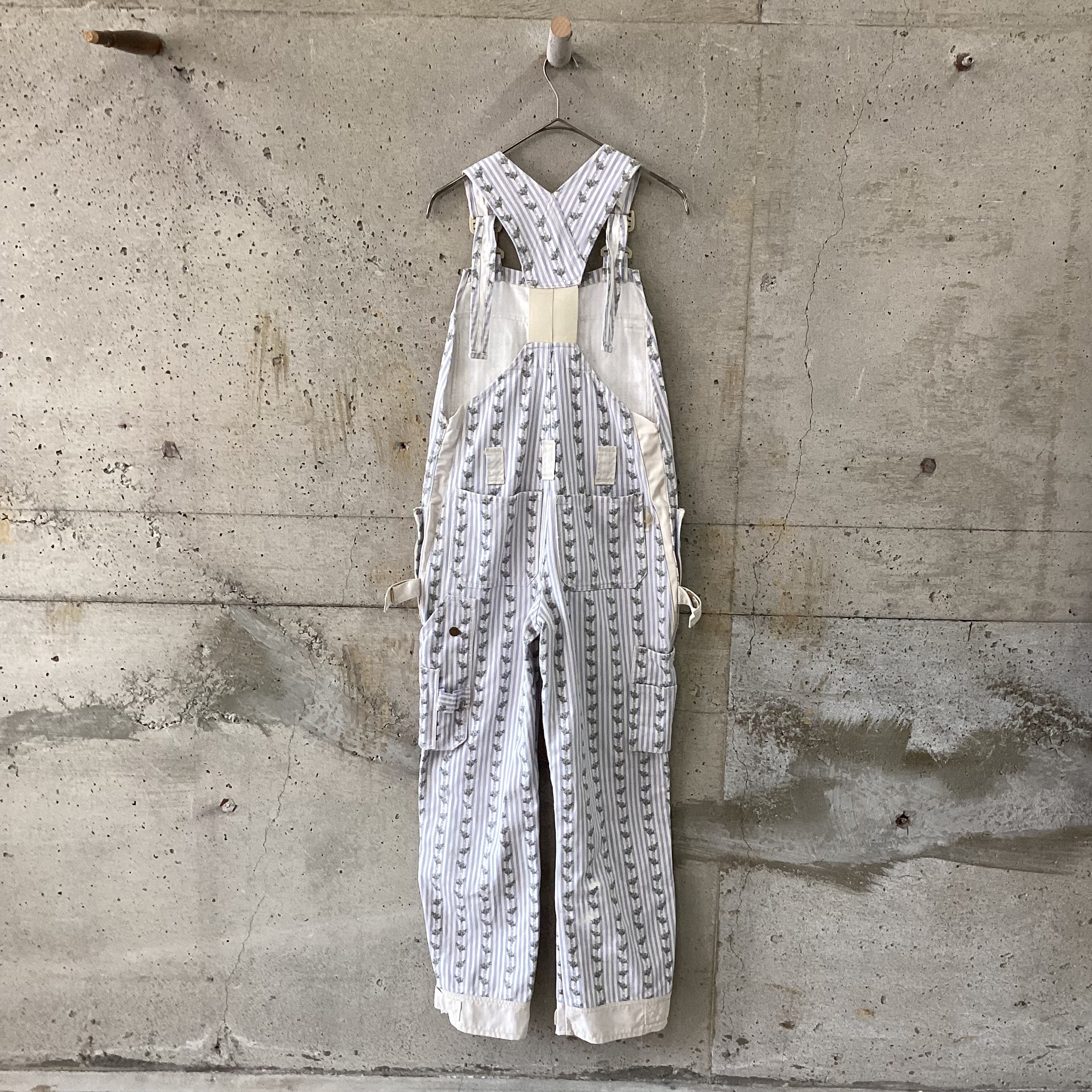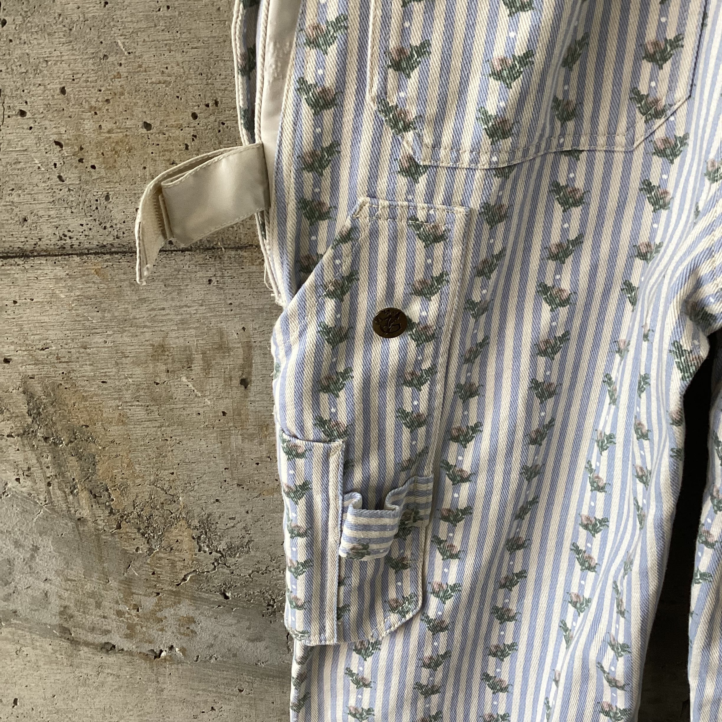 水色のストライプに花柄のプリントがされているオーバーオールです。