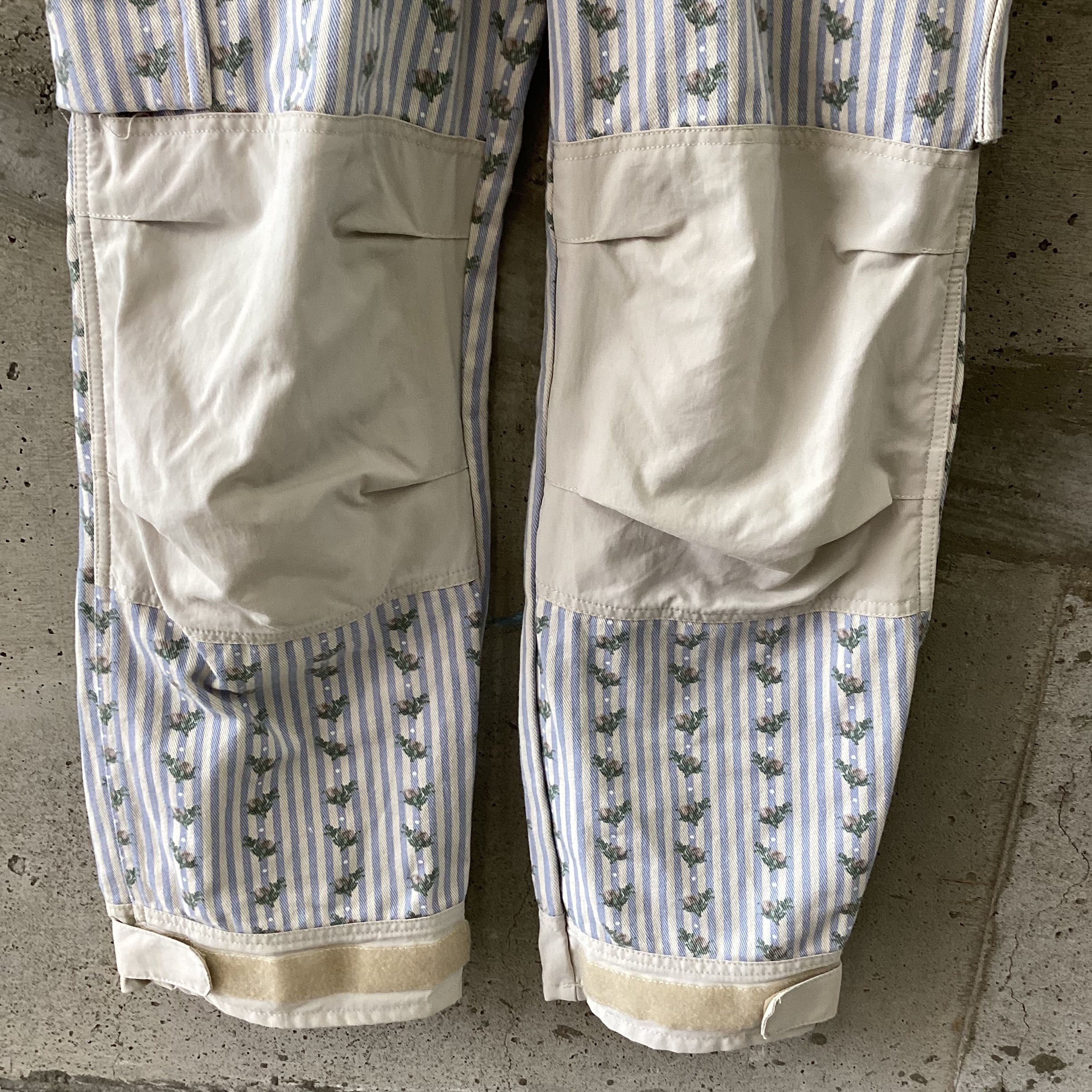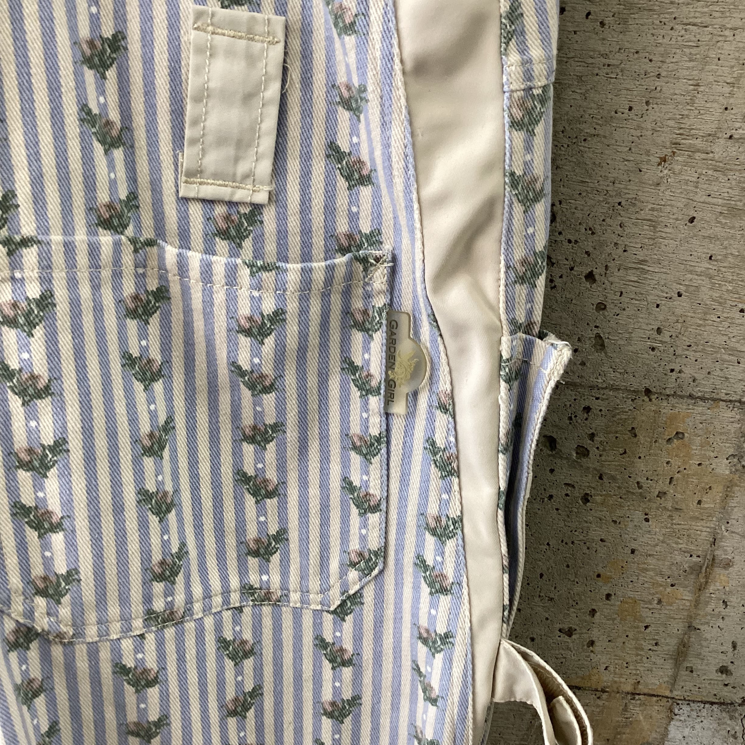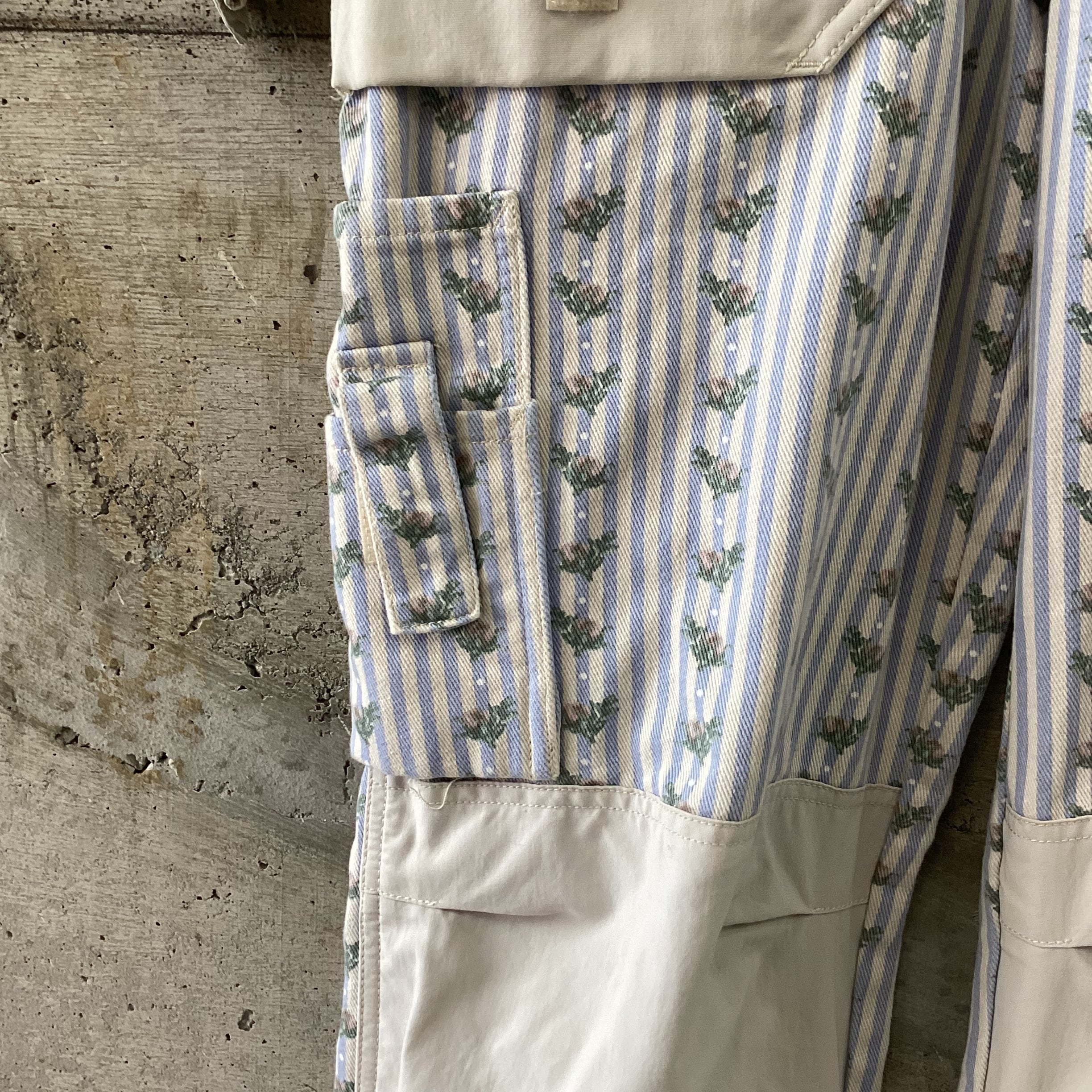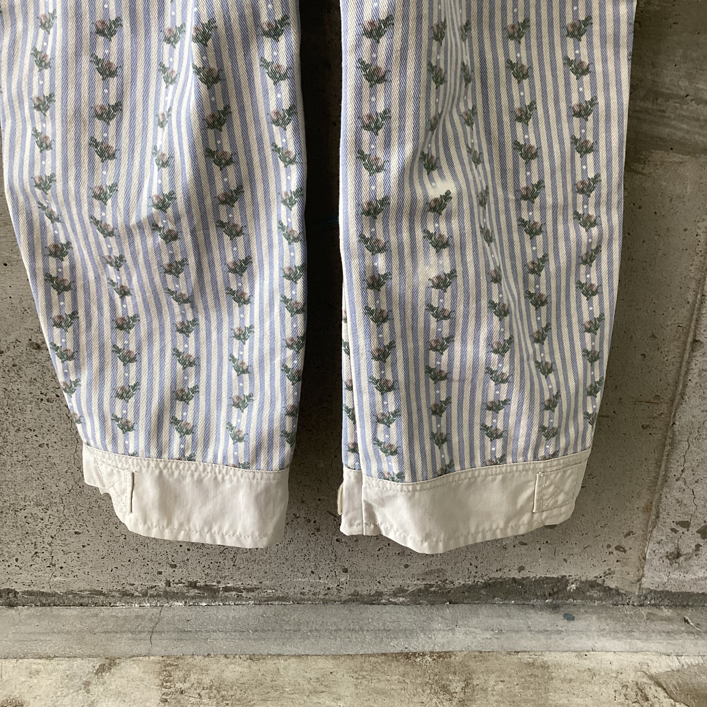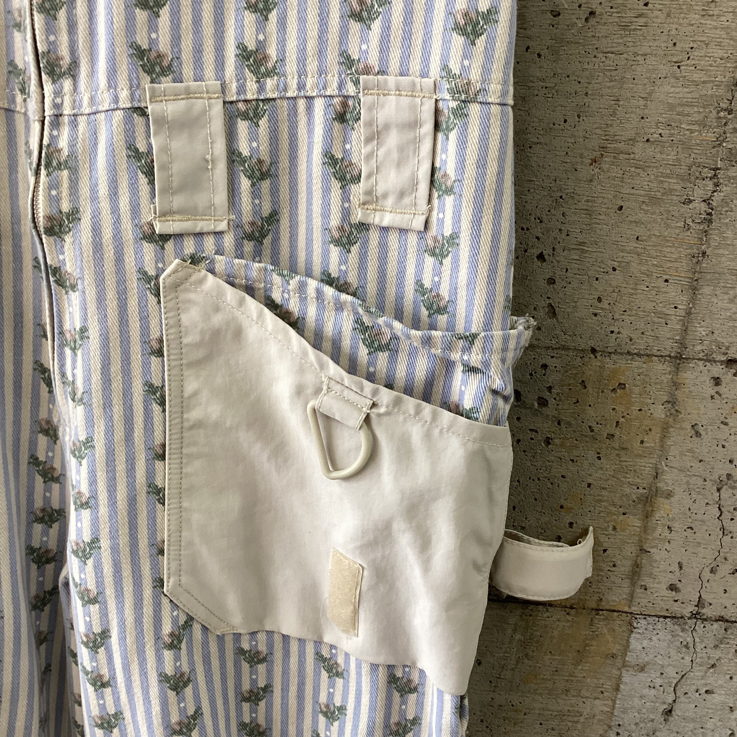 水色のストライプに花柄のプリントがされているオーバーオールです。