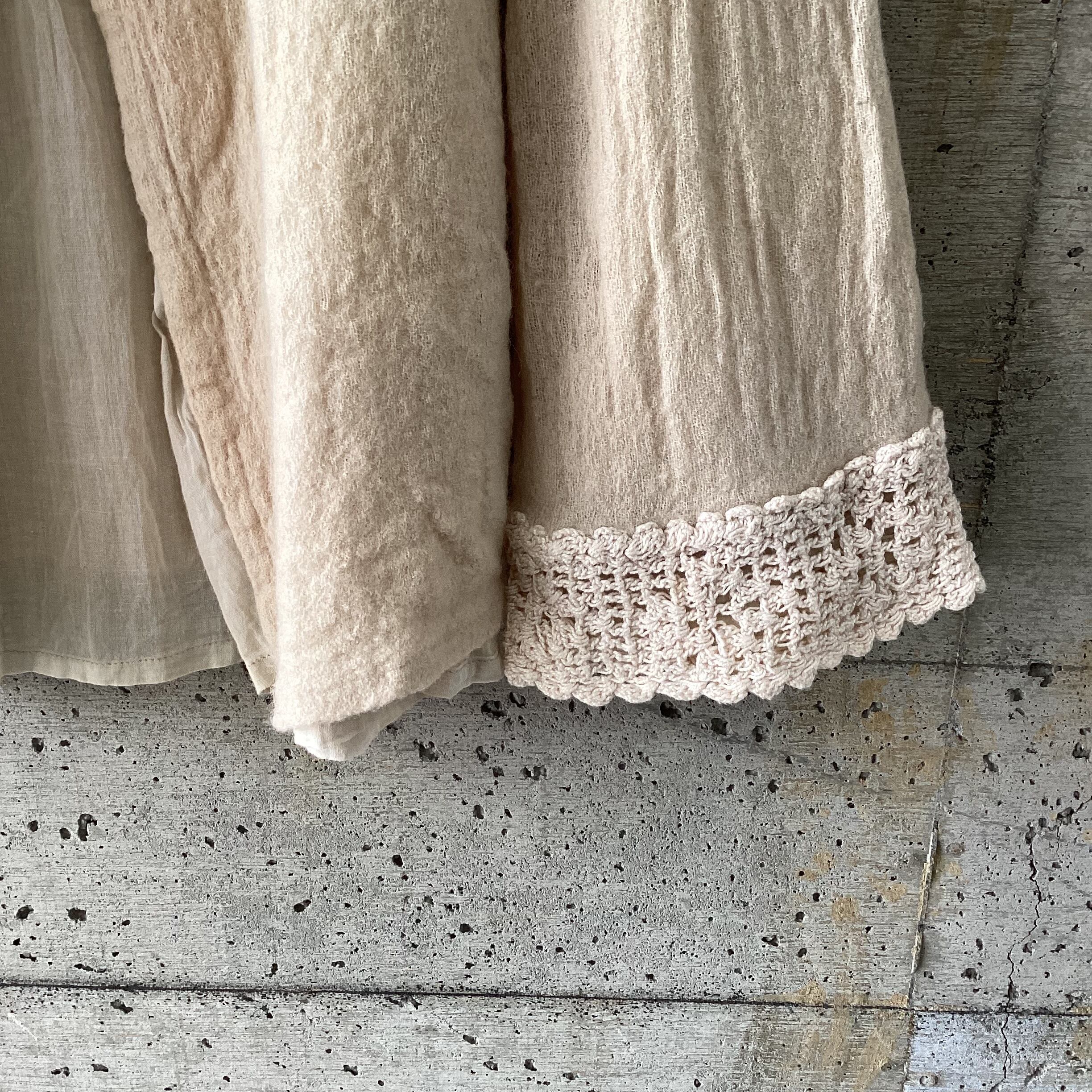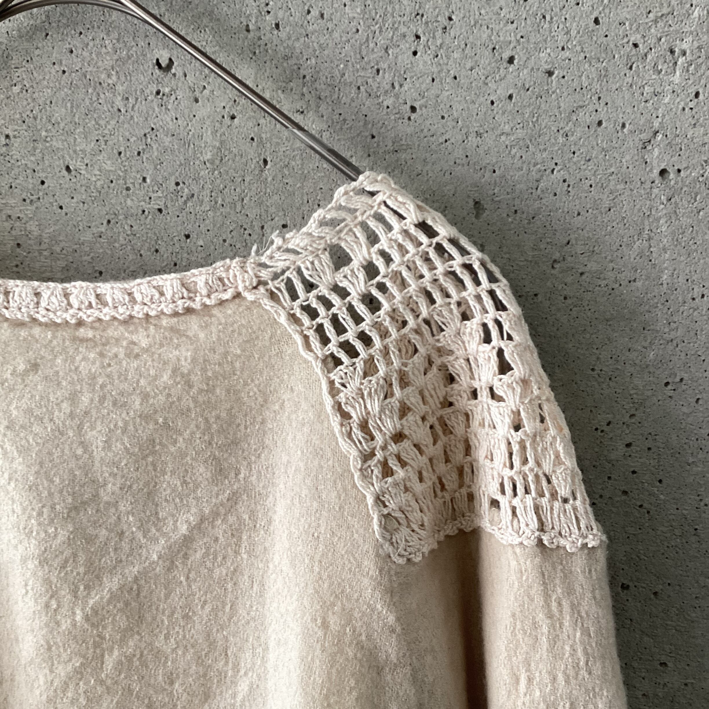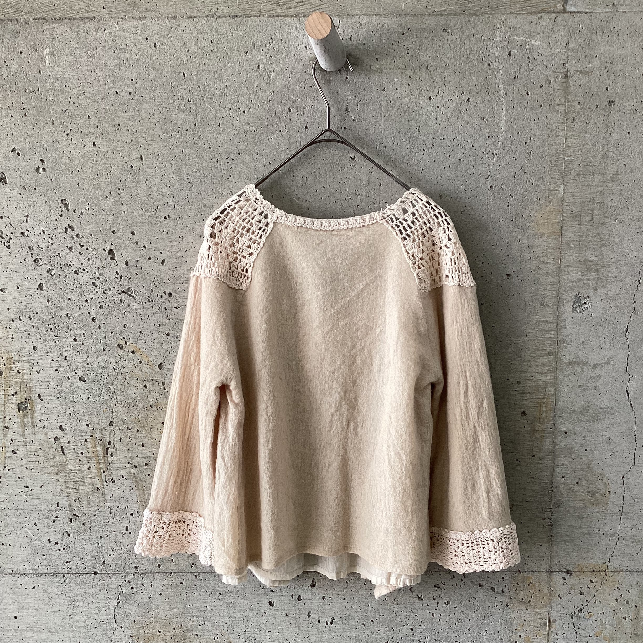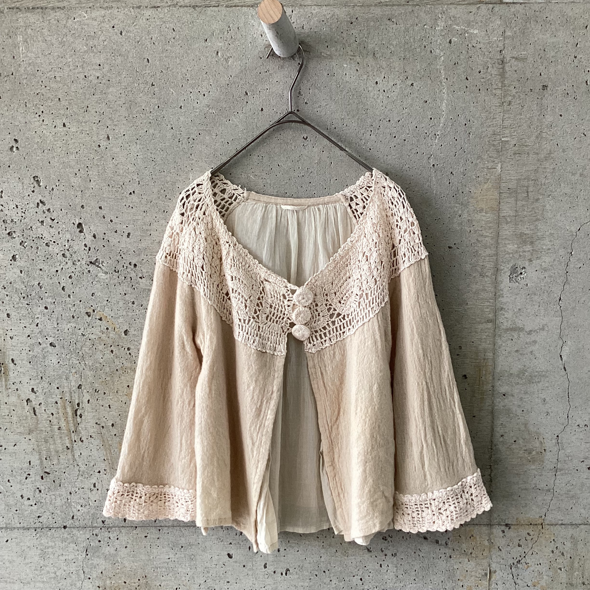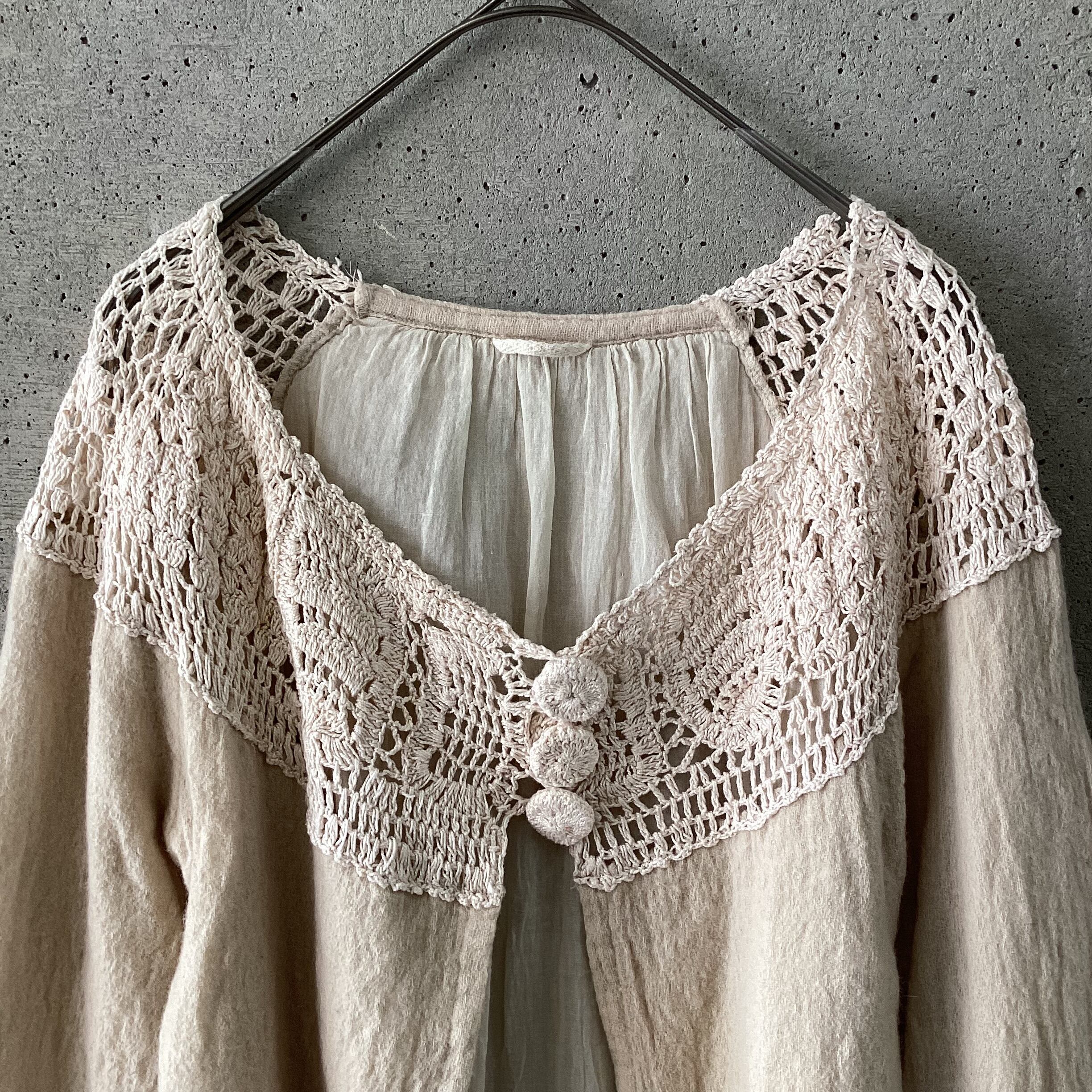 ウールの織り生地とクロッシェを切り替えた、優しい雰囲気のカーディガンです。