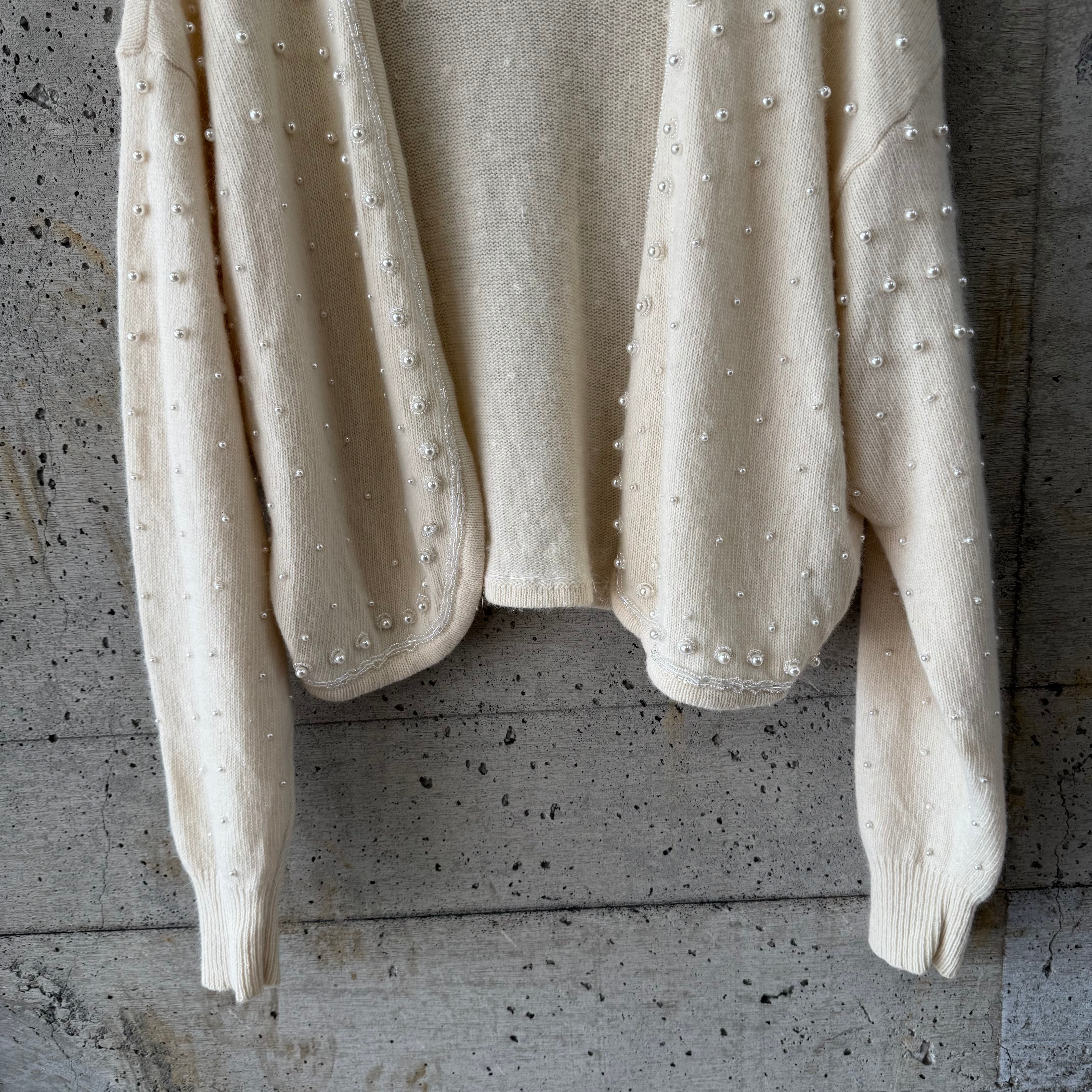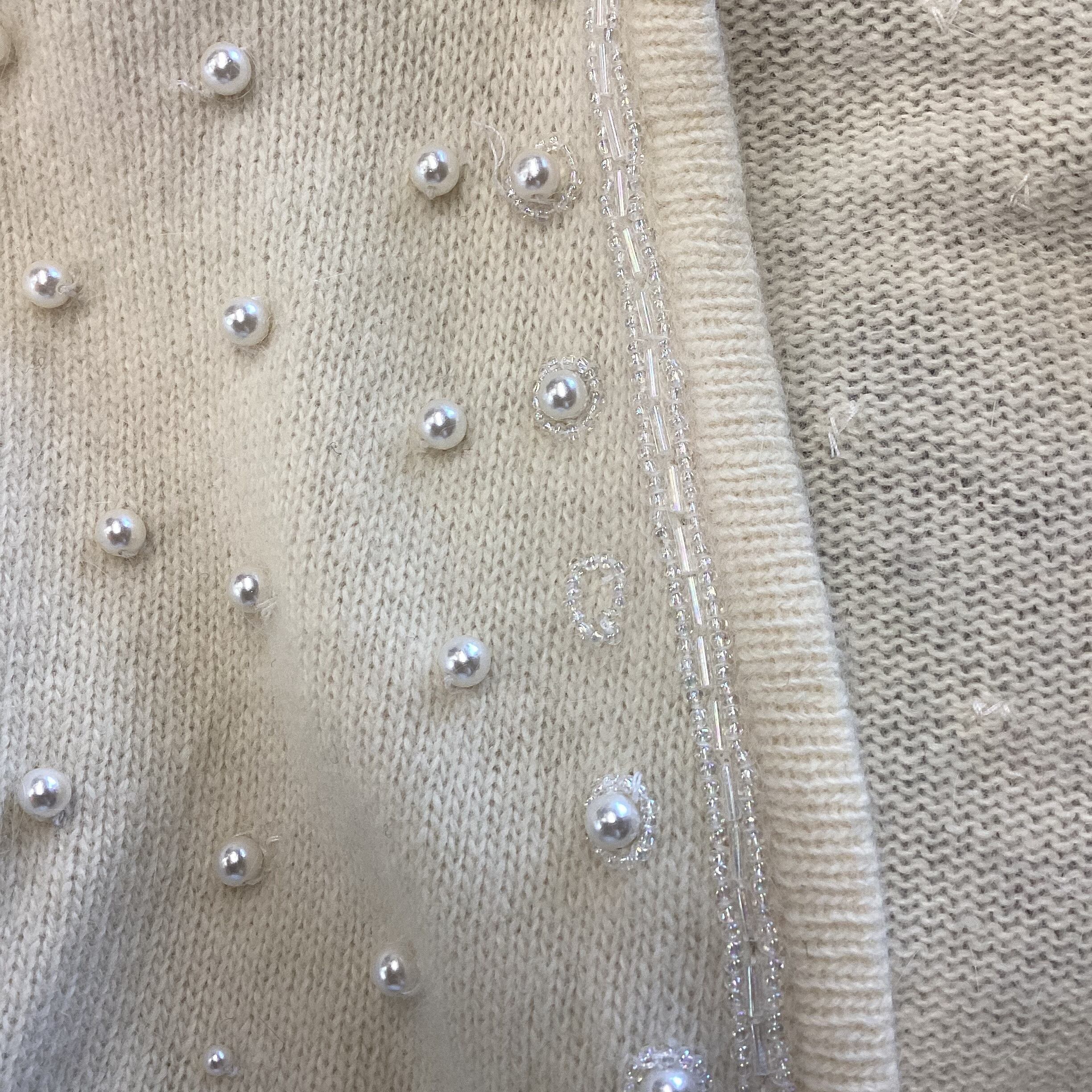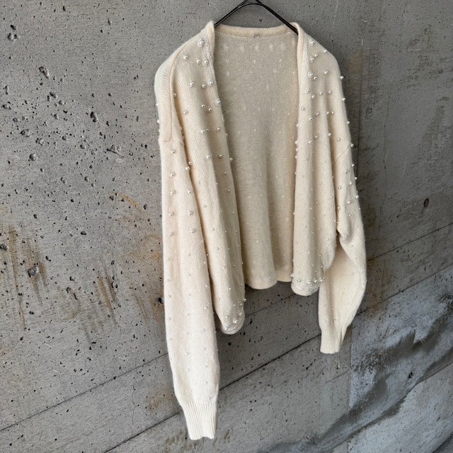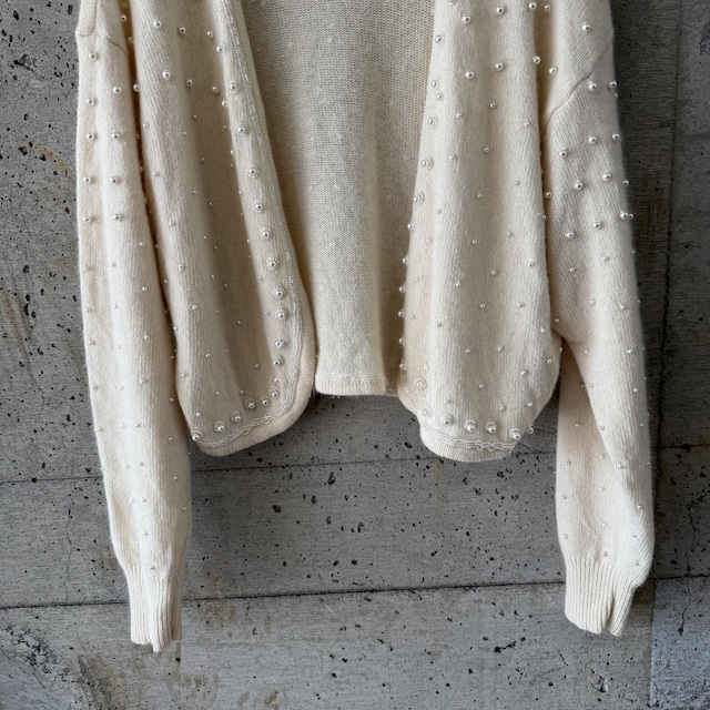 パールボタンが印象的な、ボレロタイプのニットカーディガン。