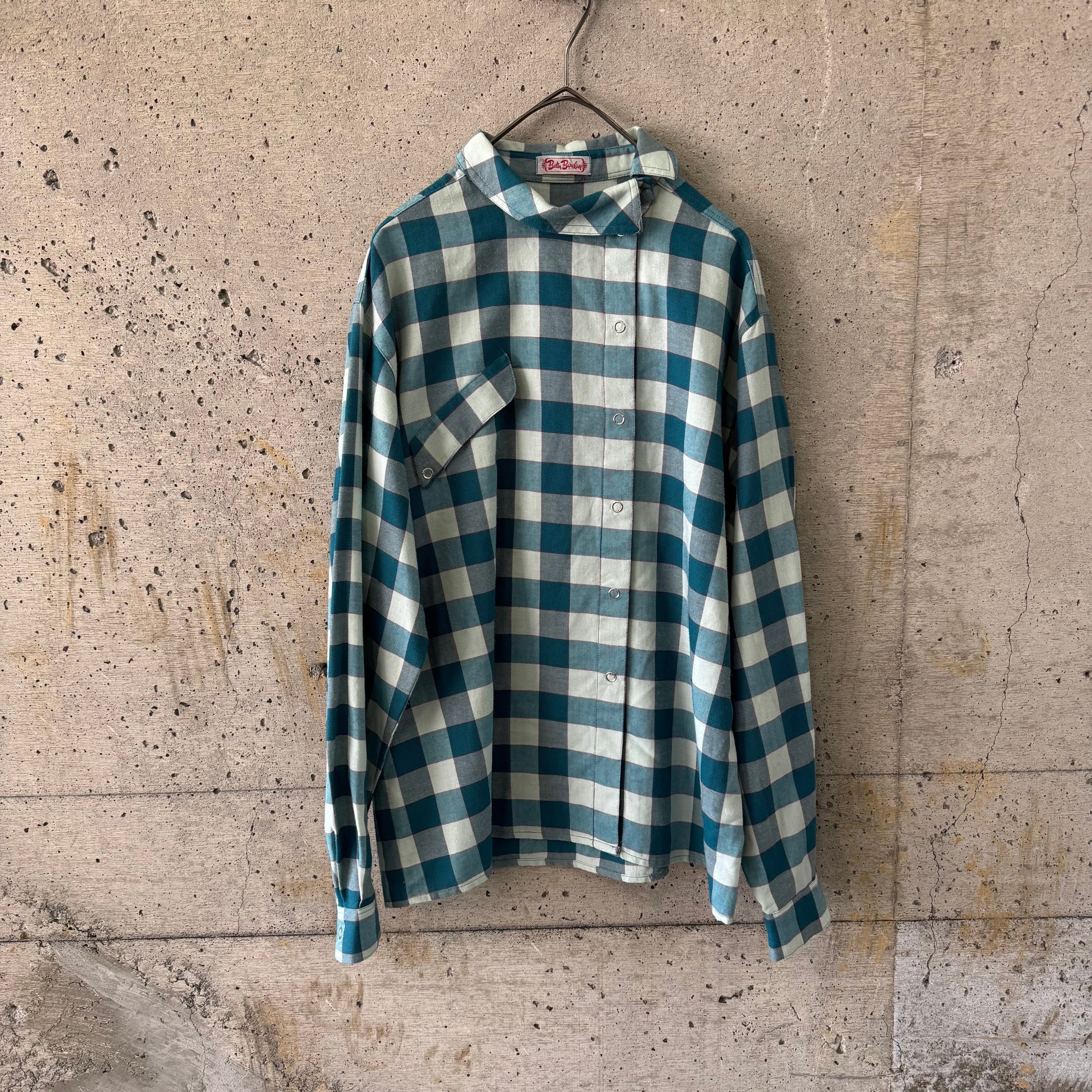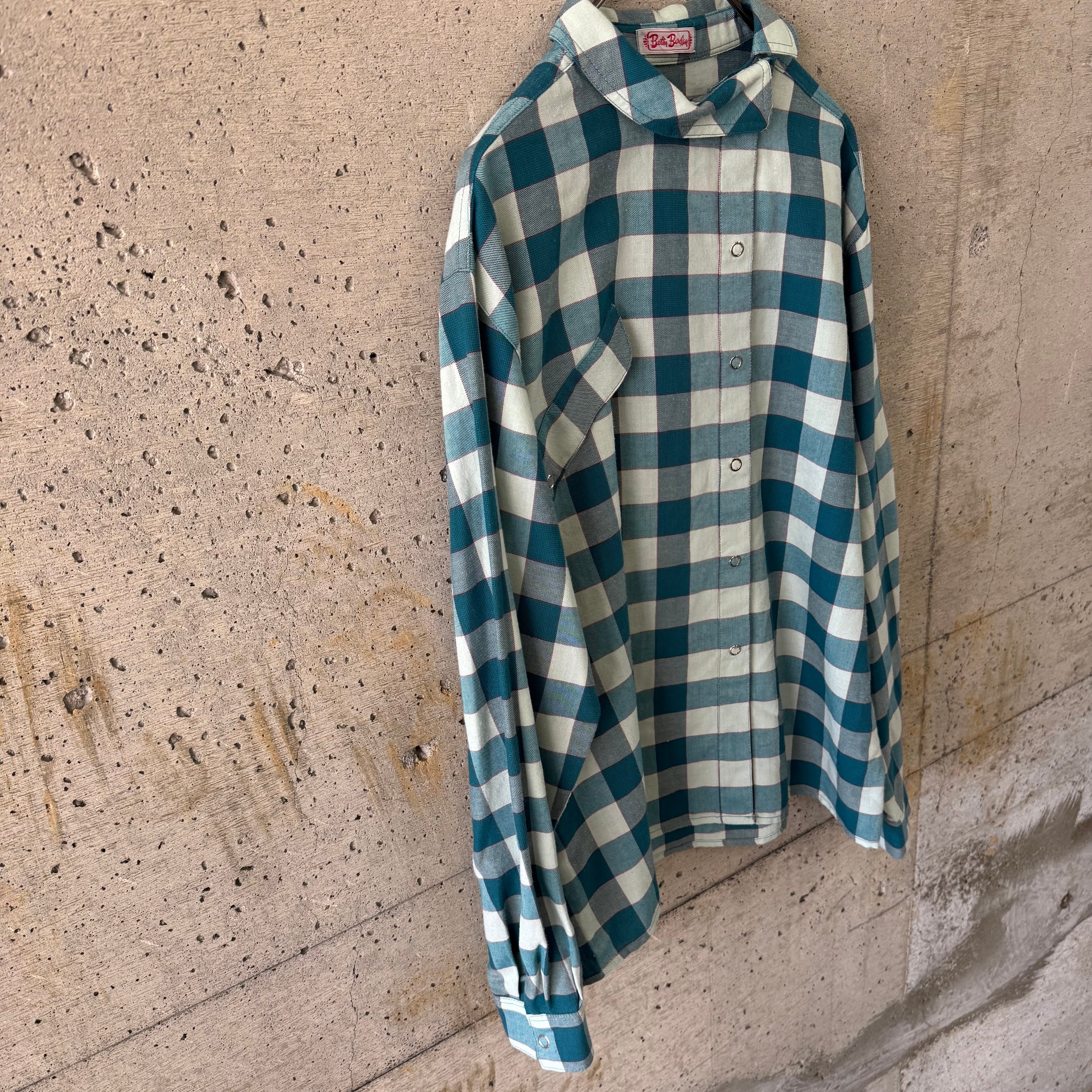 ブルーグリーンのチェック柄ブラウスです。