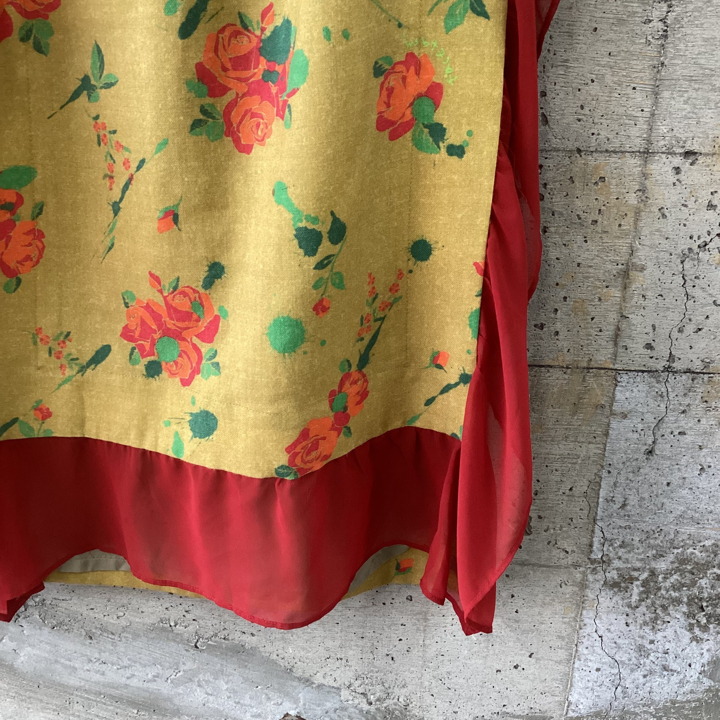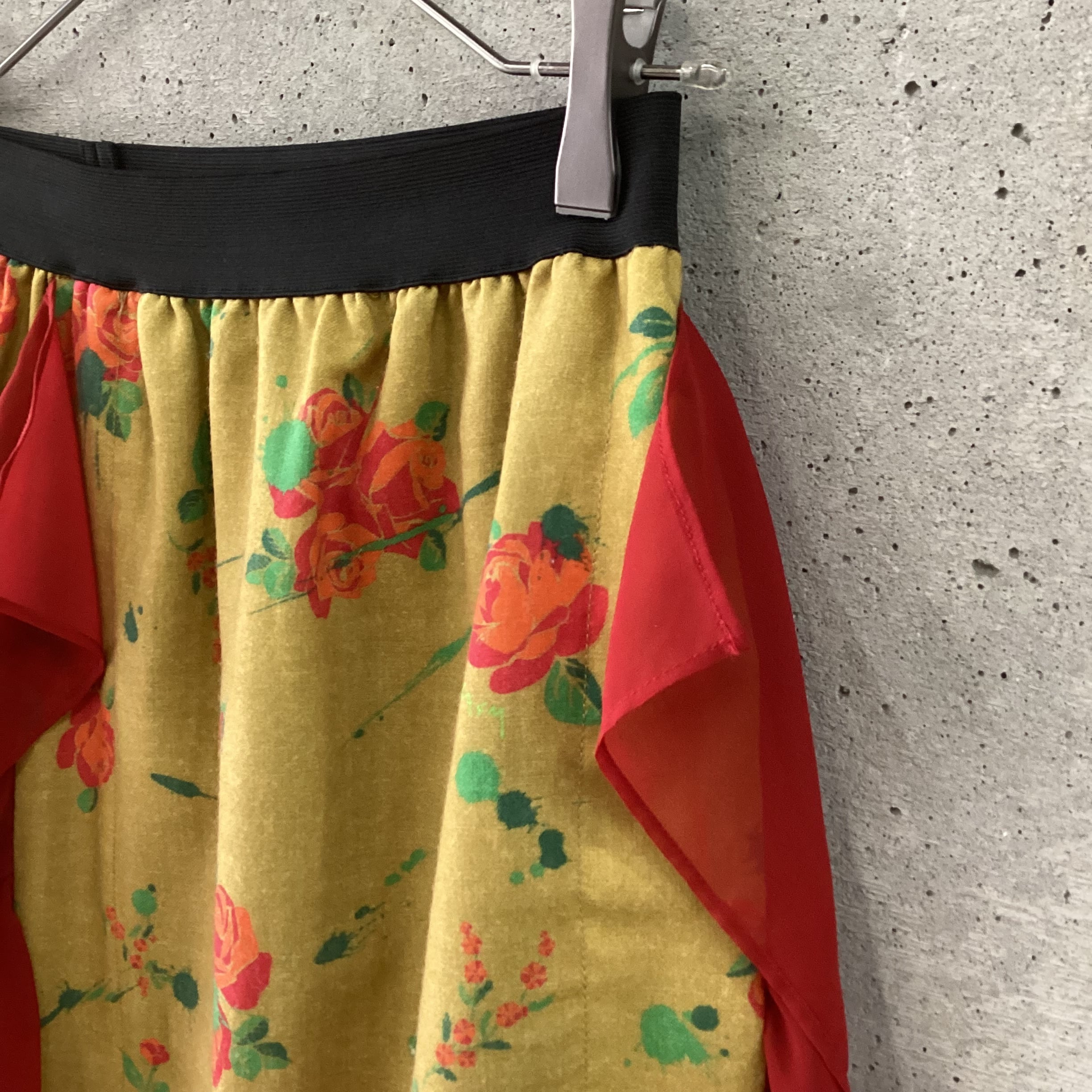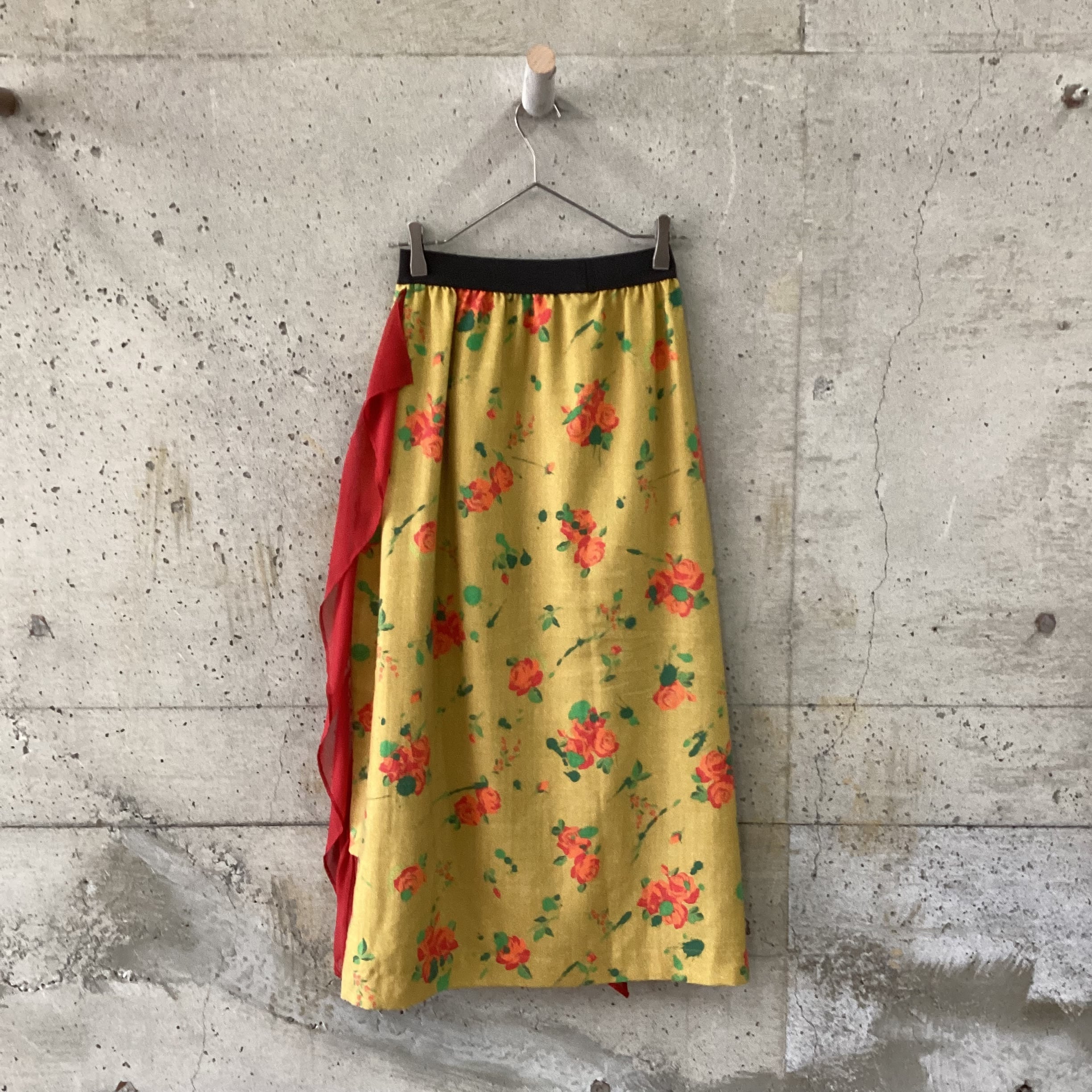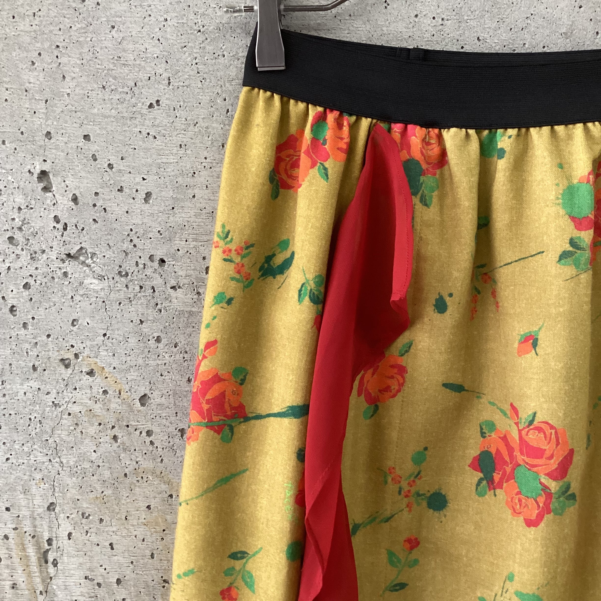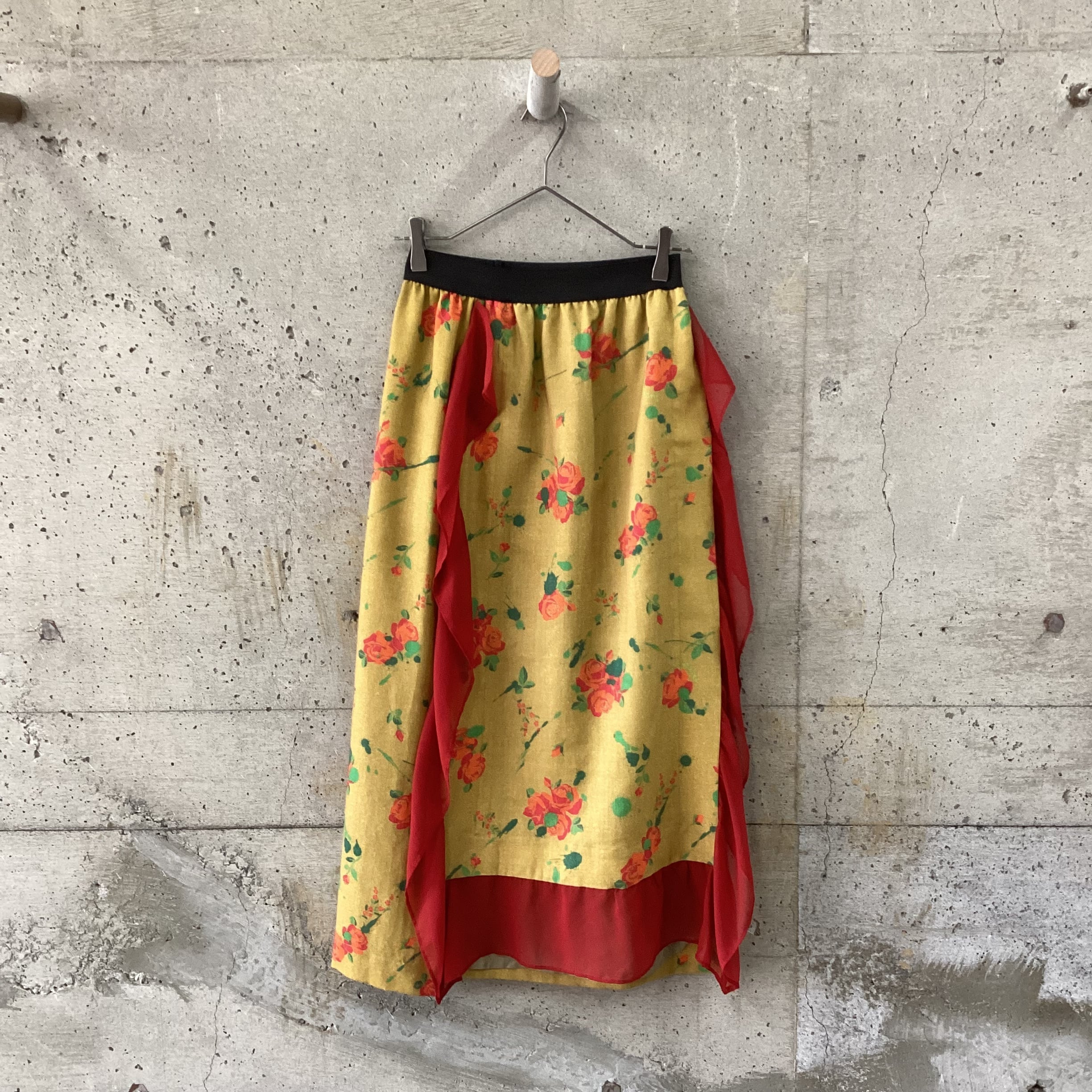 マスタードカラーの生地に赤のシフォンのフリルがつけられたロングスカートです。