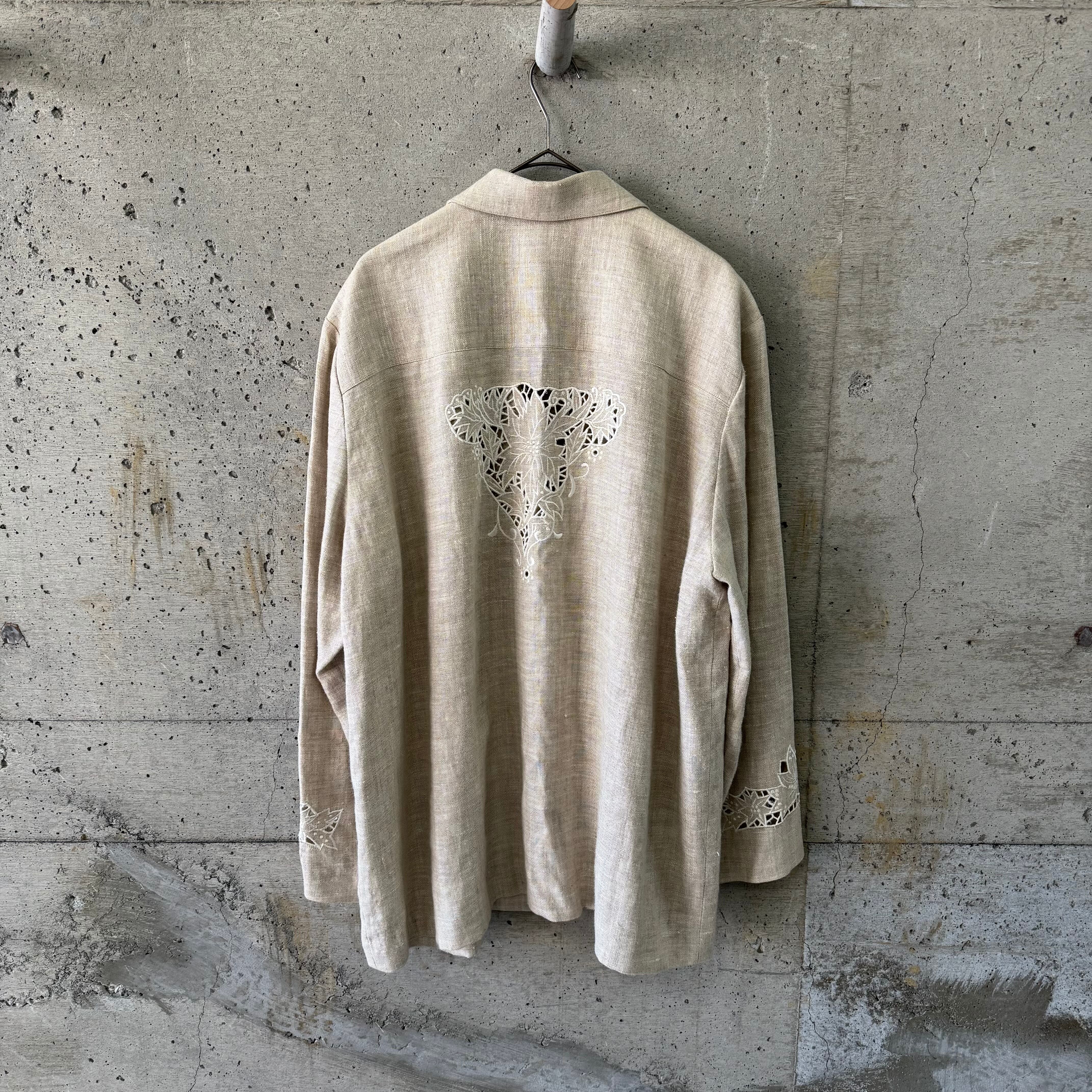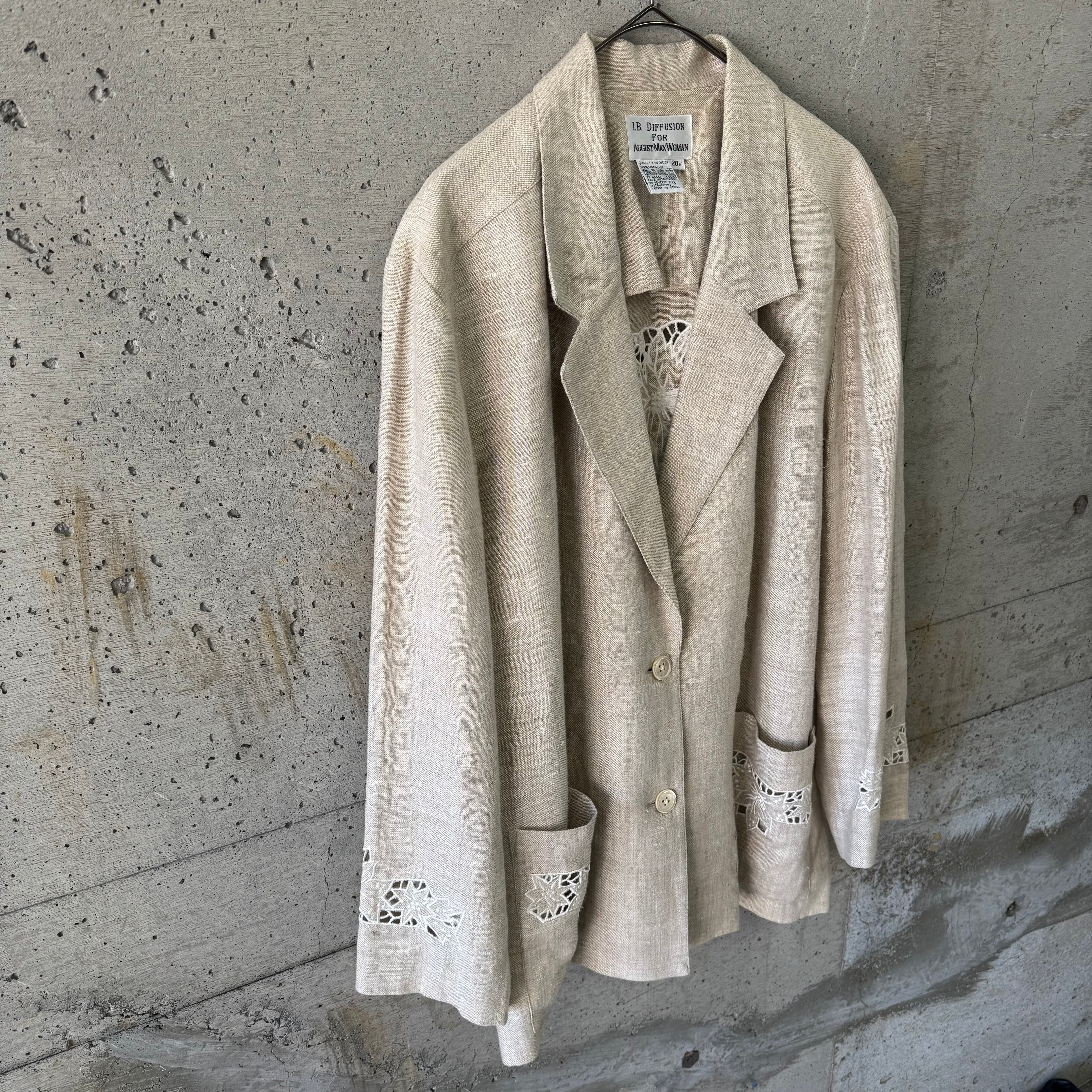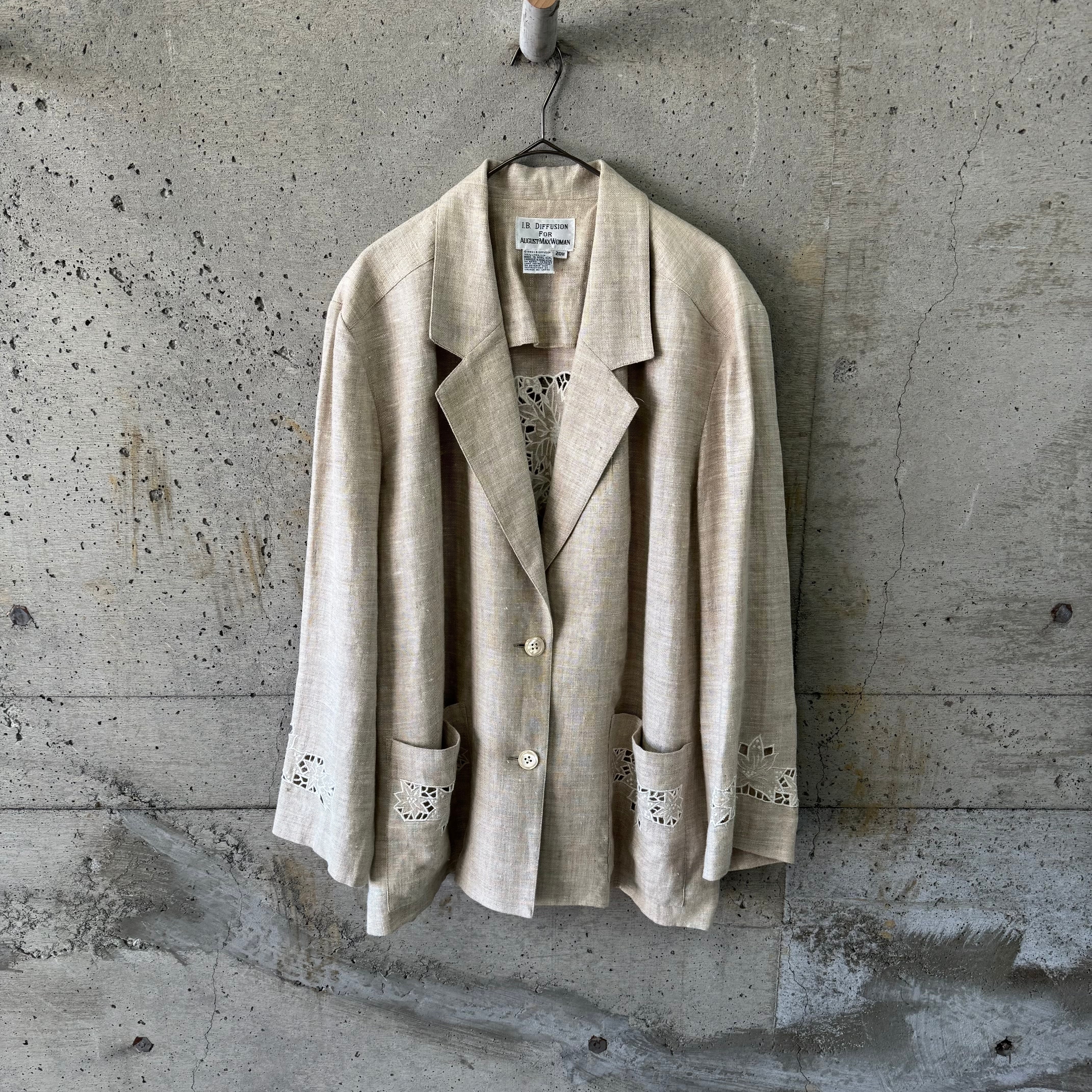 レースカットが特徴的なリネンジャケットです。