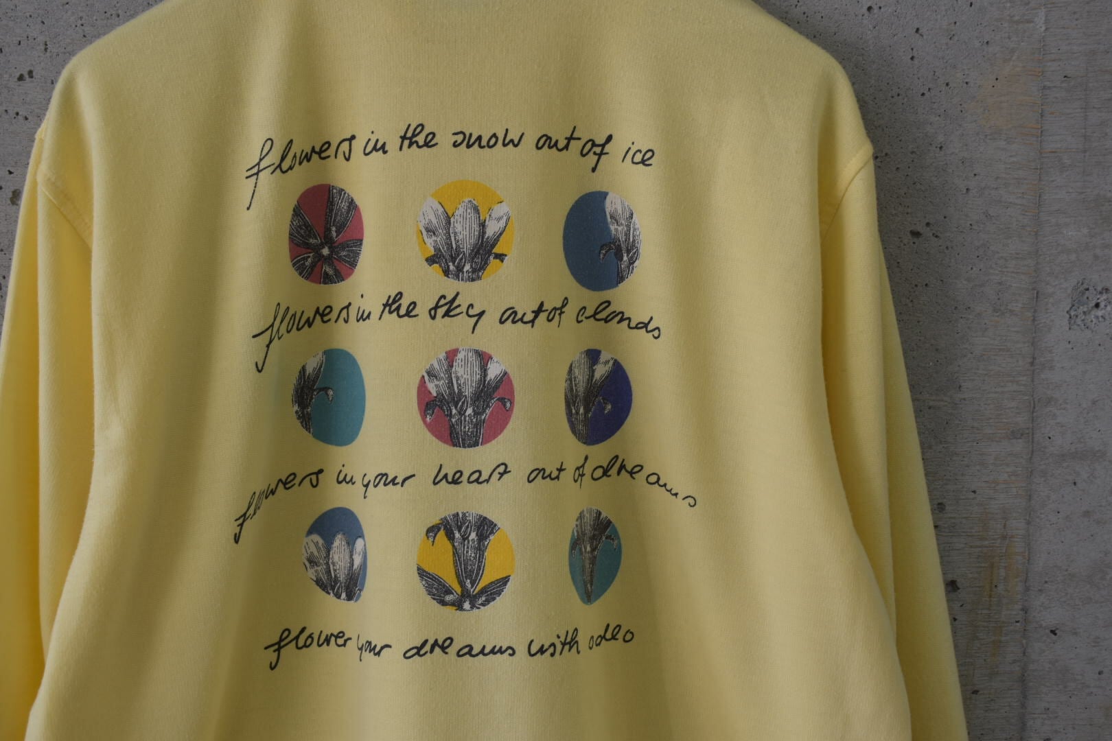 フロントには控えめなお花のワンポイントプリントが施されており、バックには同じようなプリントが規則的に並んでいます。