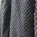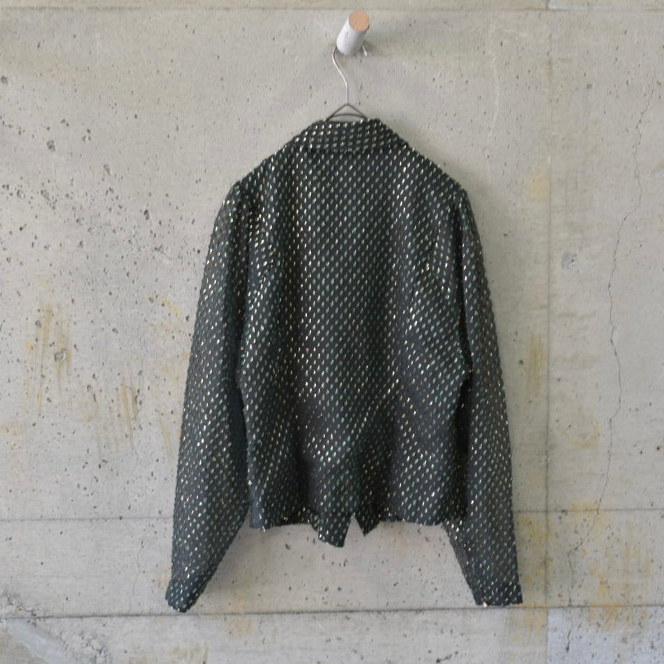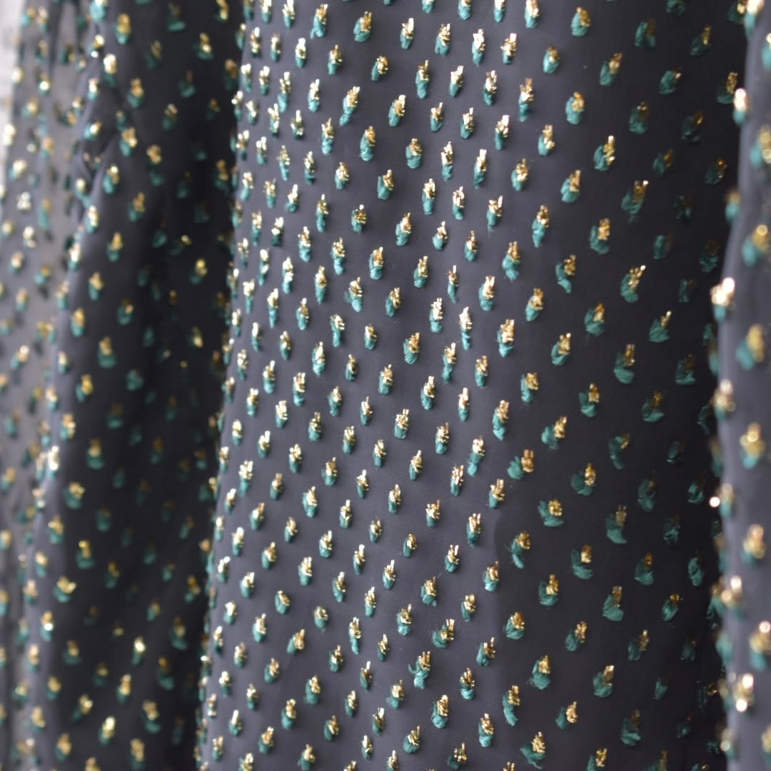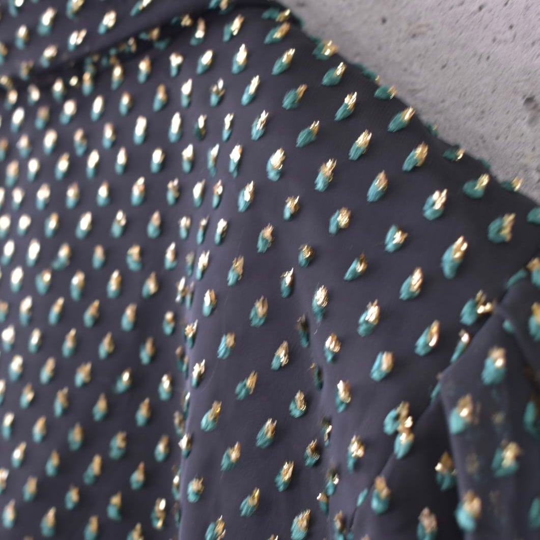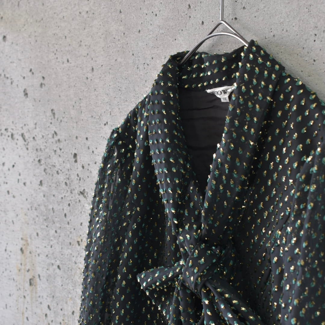 キラキラとしたゴールドとグリーンの起毛素材が、シアー生地に重なった珍しい生地のボウタイブラウスです。