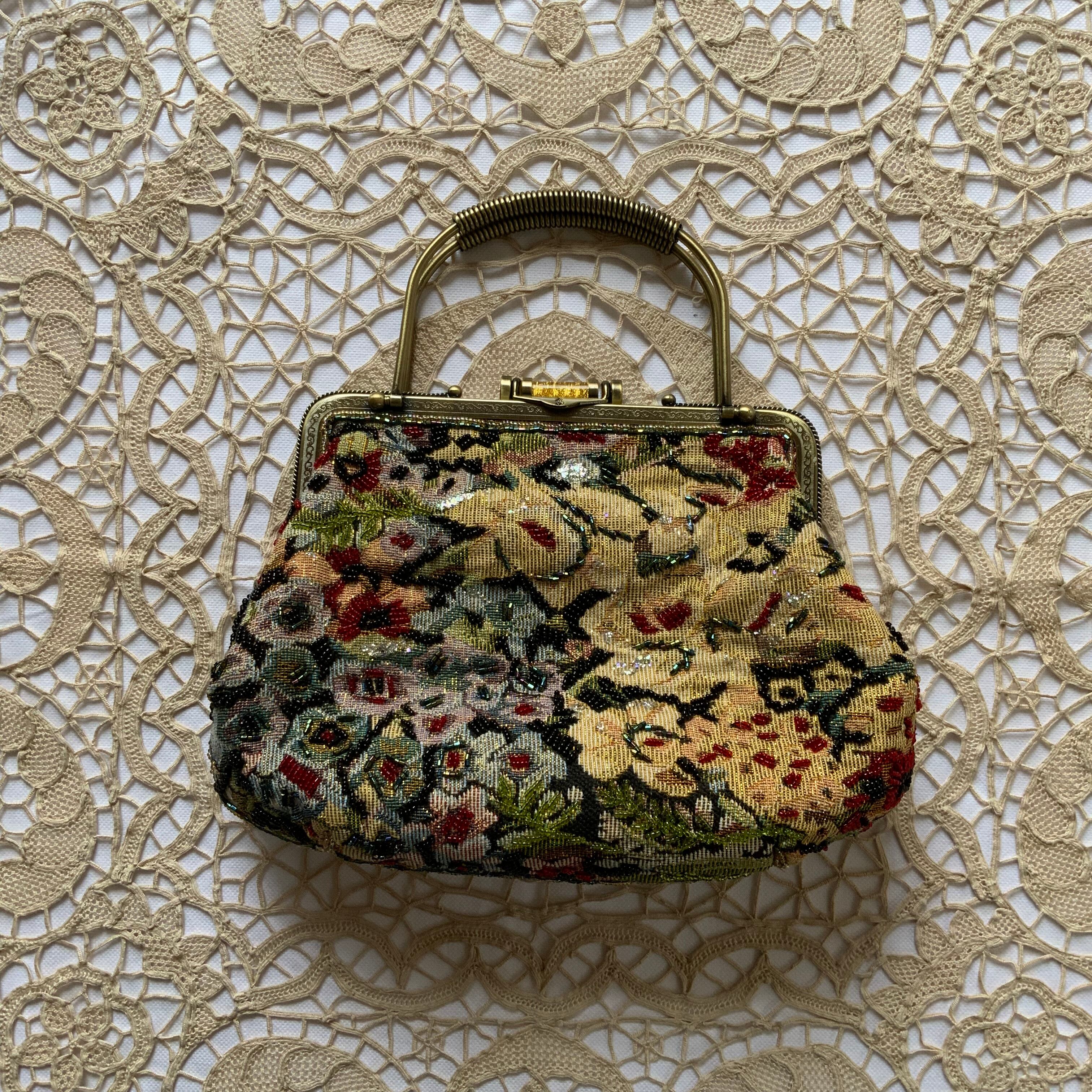 金属の持ち手やビーズ、開け口のクリアな金具部分などとてもステキなバッグです