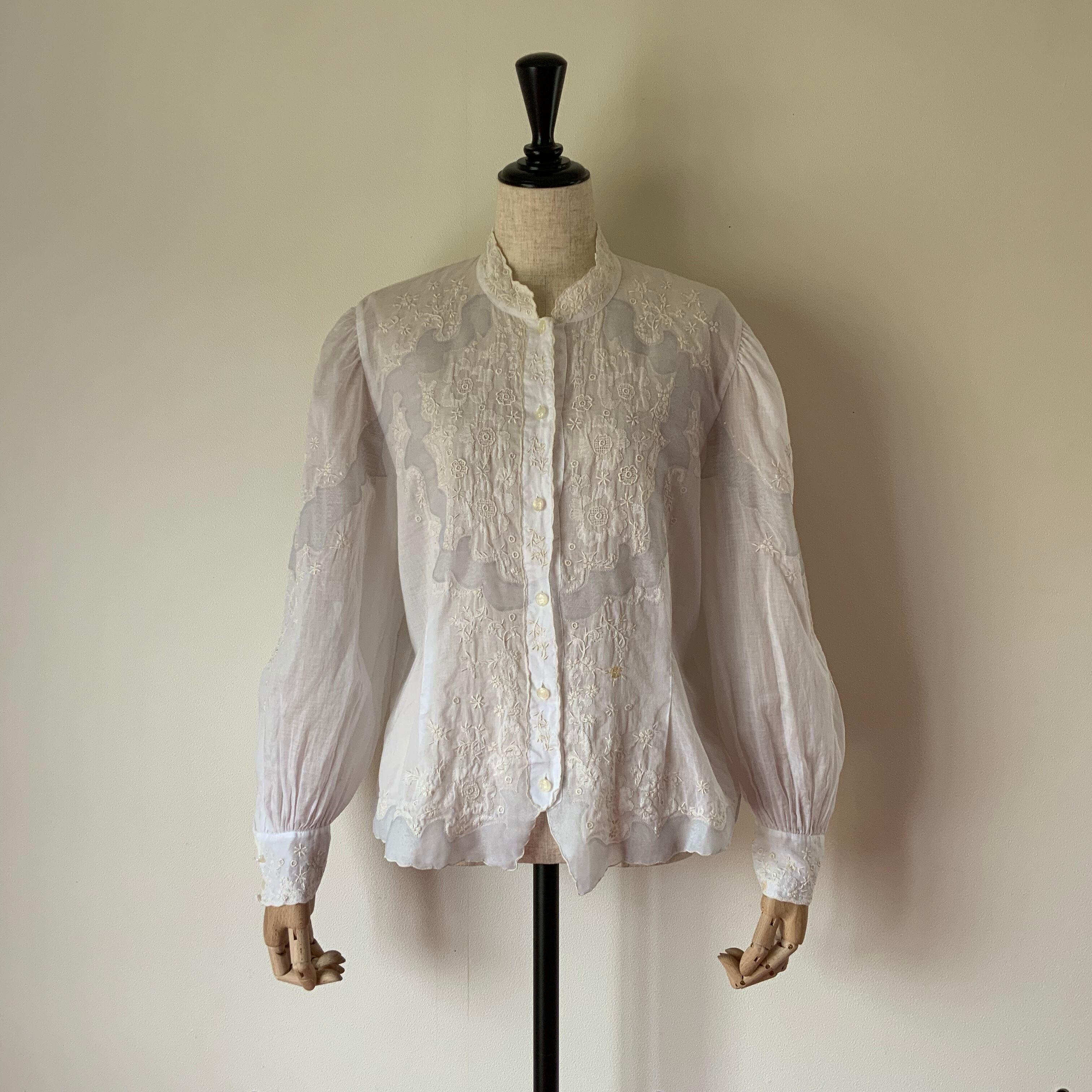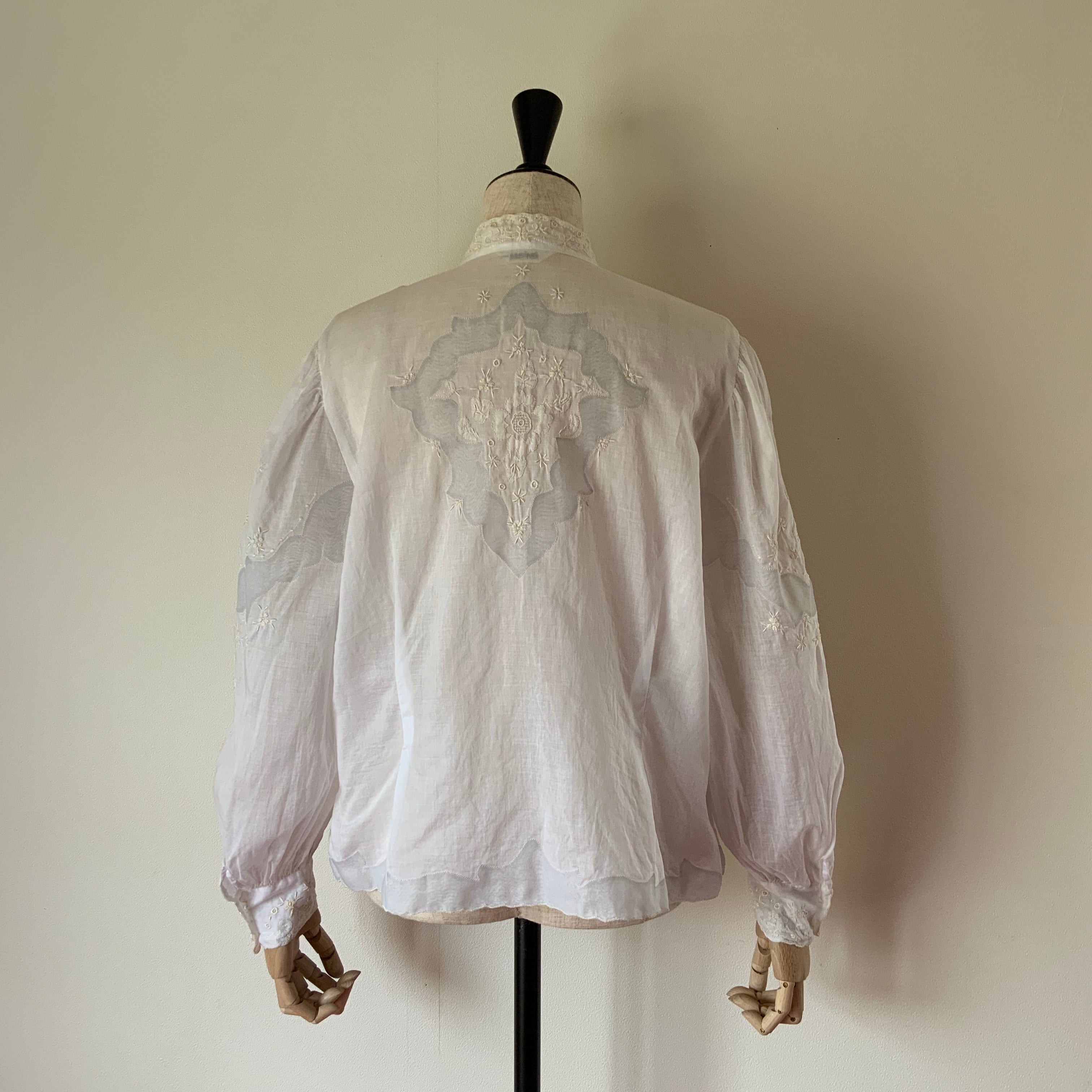 袖のボリューム感も薄い水色の生地の切り替えも、とてもステキなブラウスです