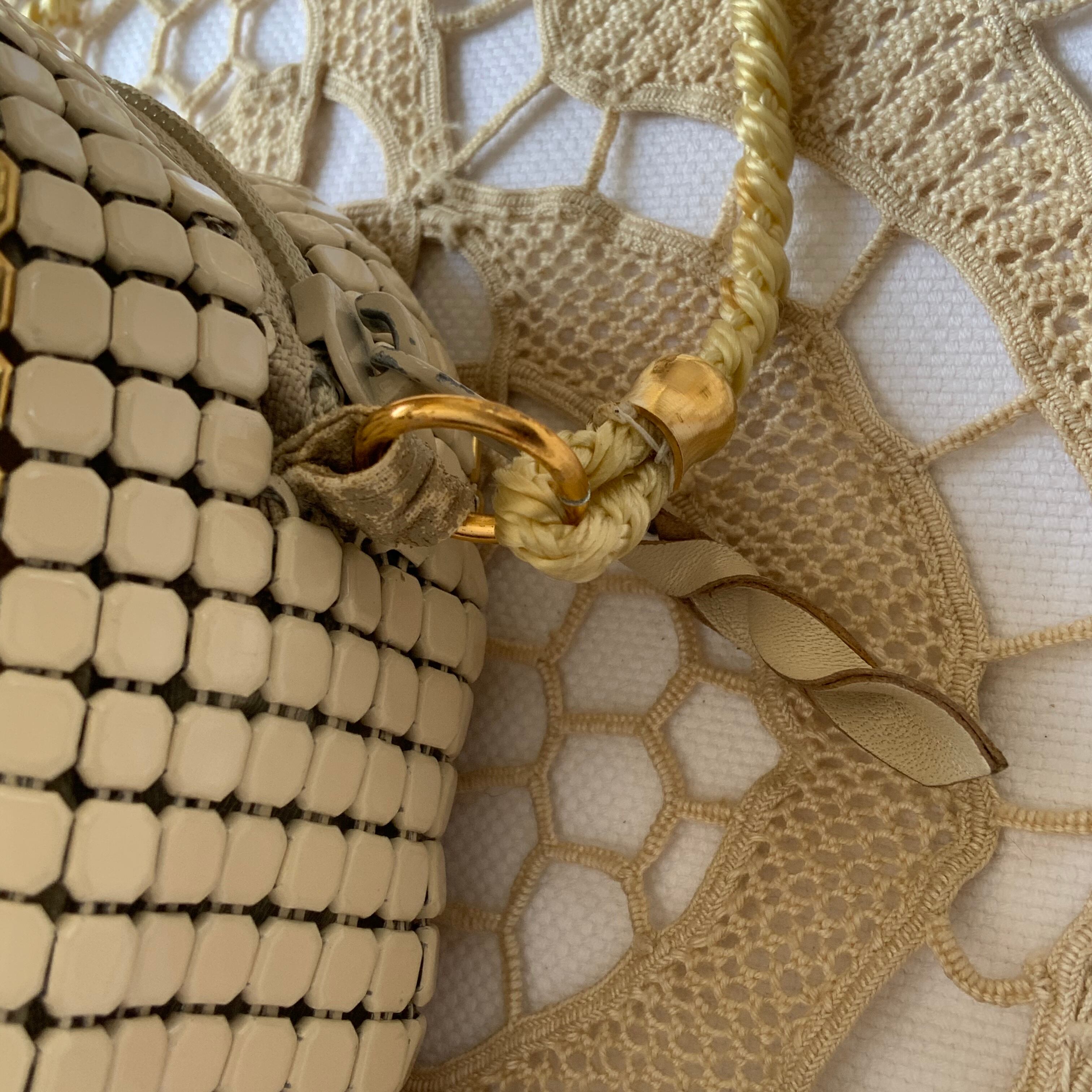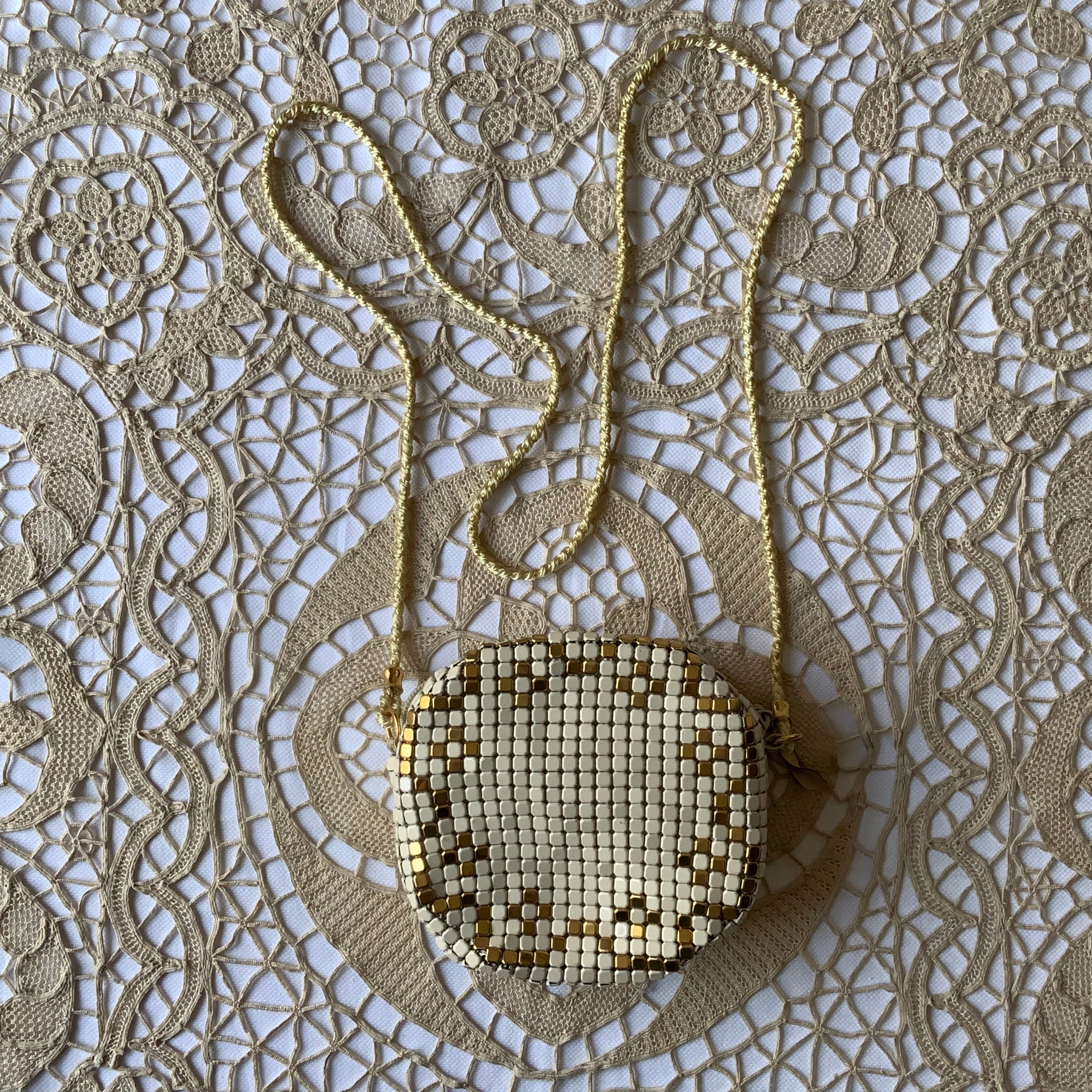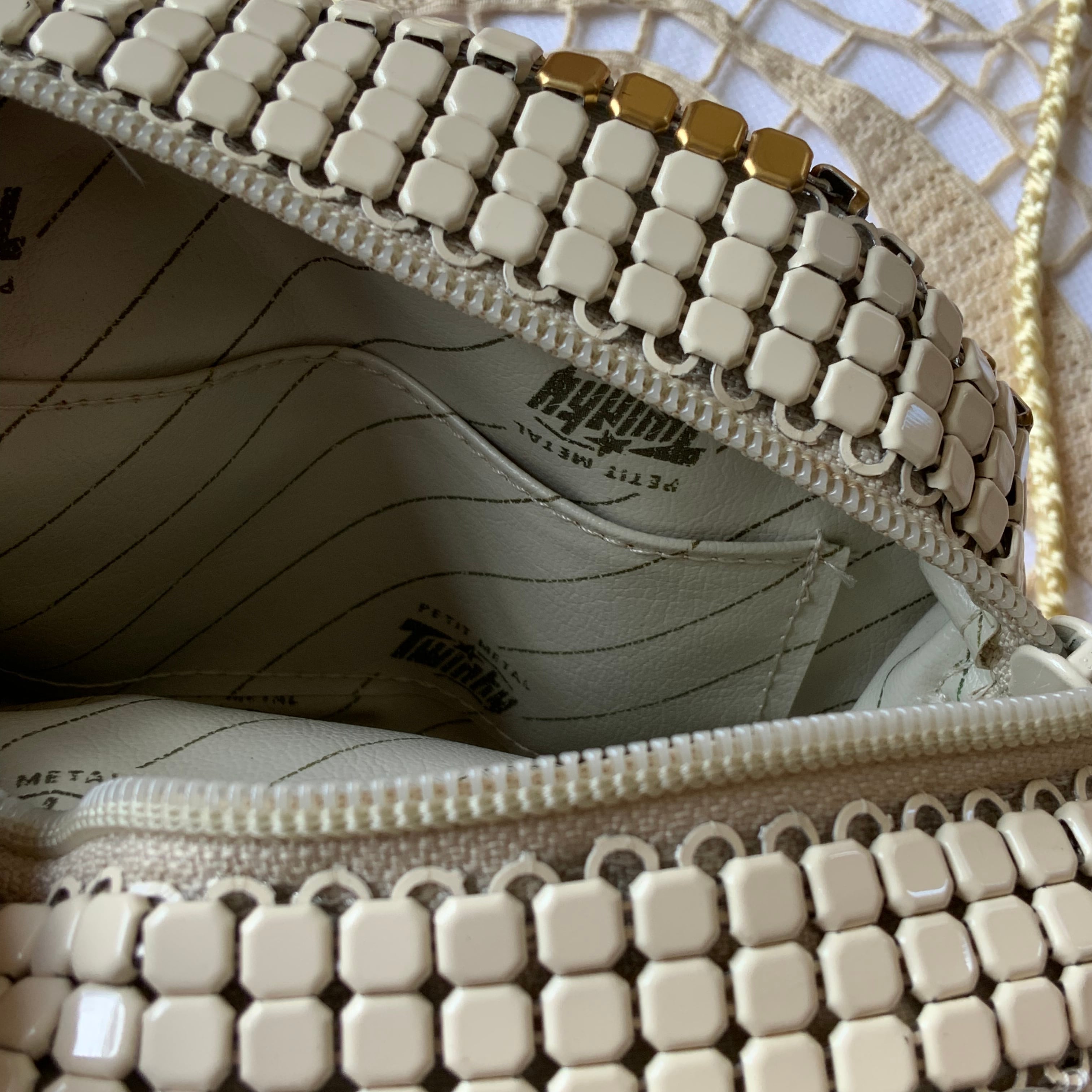 小さなメタルプレートがつながっているミニショルダーバッグ