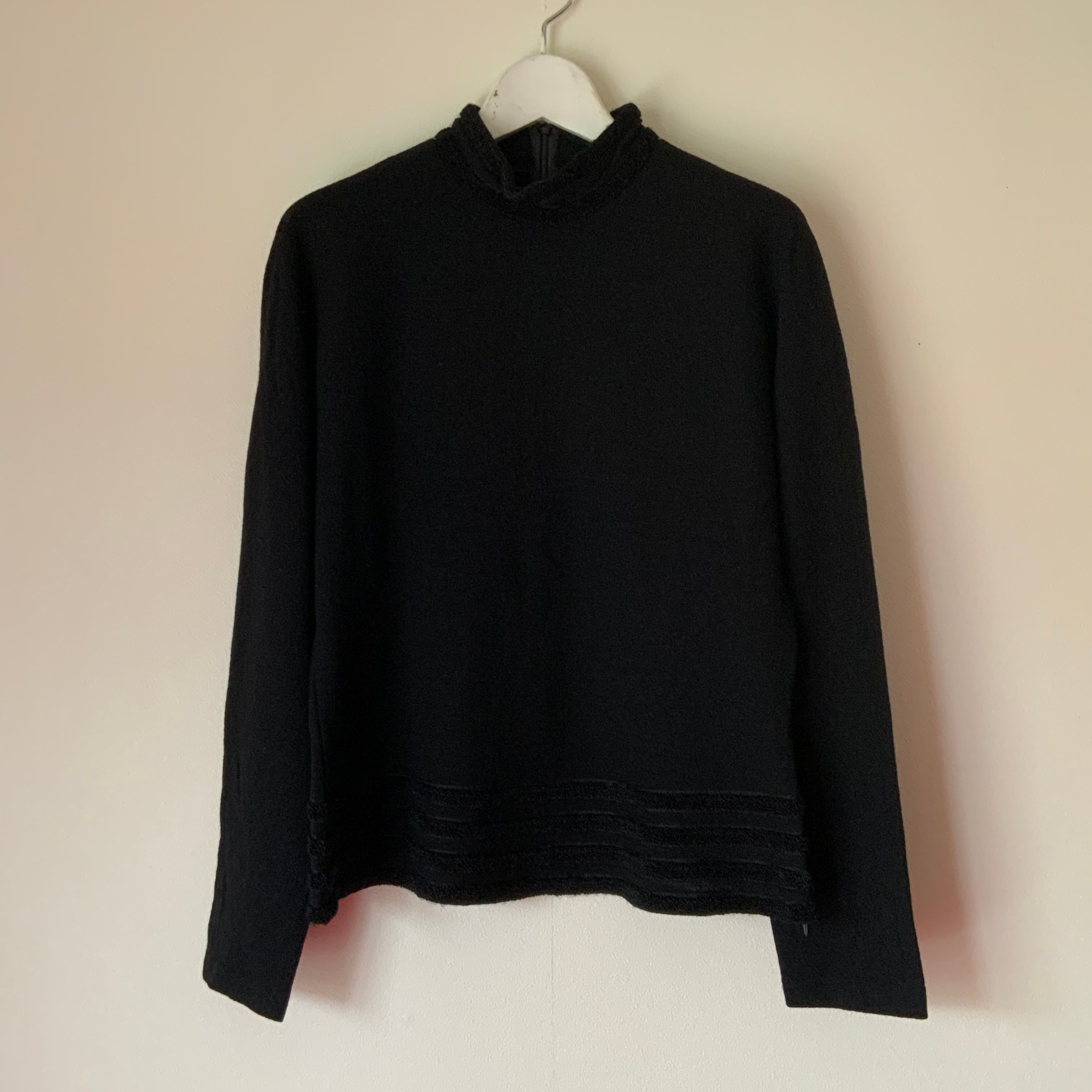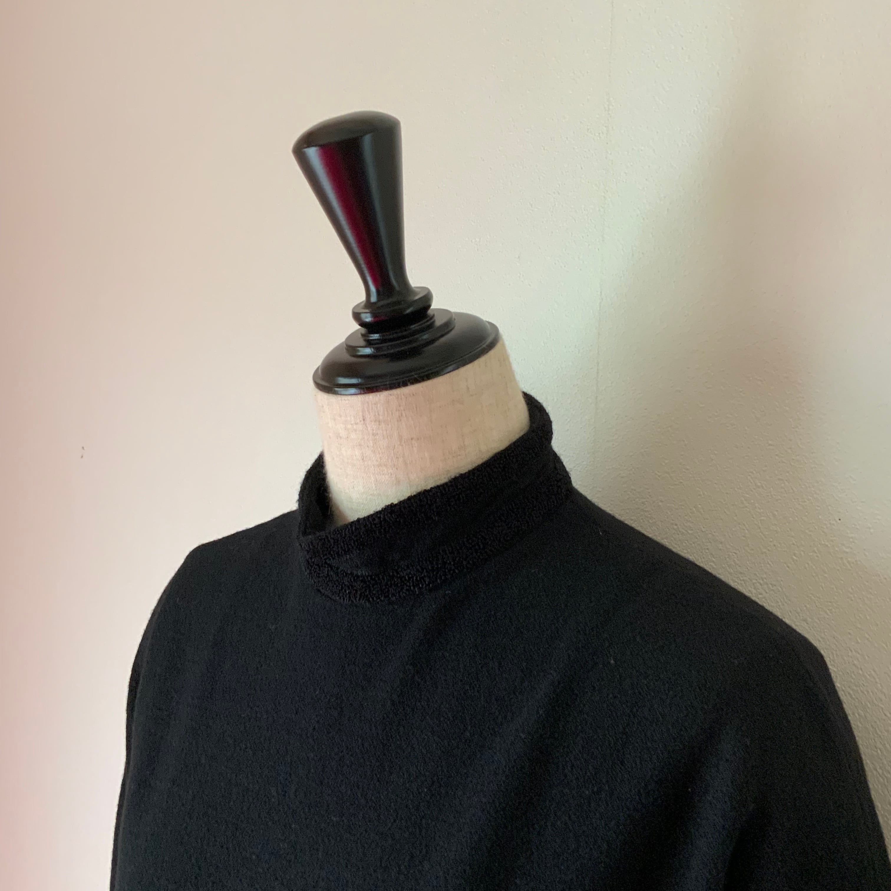 ネックや裾のループ状の細かい刺繍が、オールブラックの中でポイントになっています
