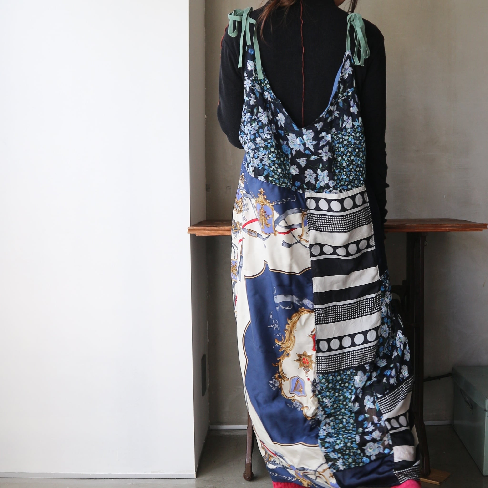 色柄がビビっとくるシルクのスカーフと古着を素材に使用して、