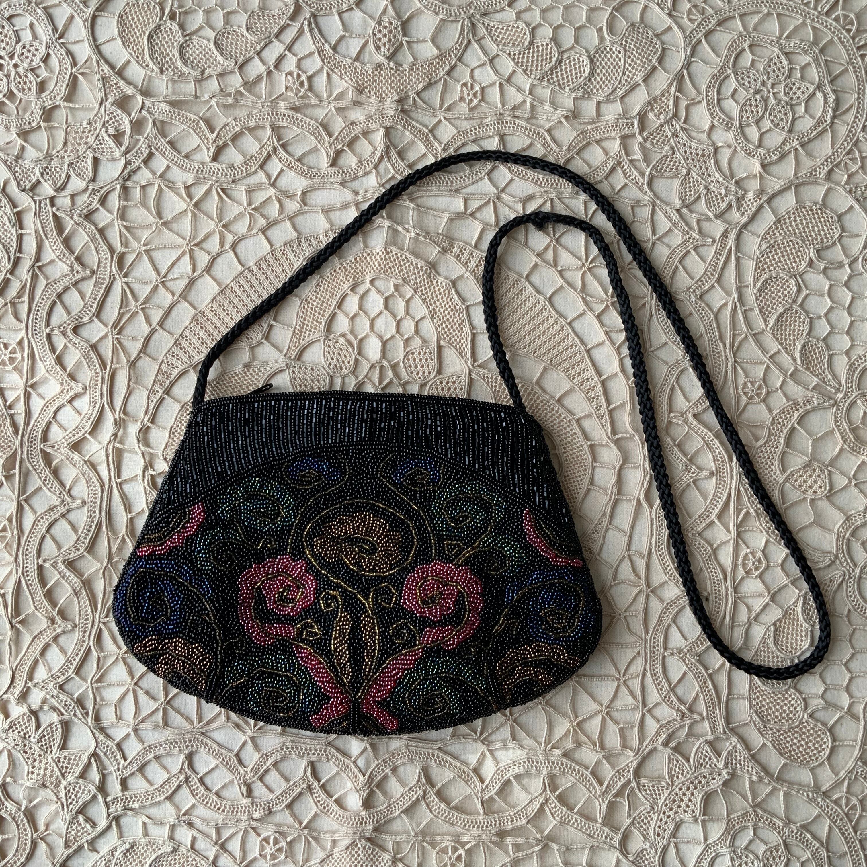カラフルな色でありながら、暗めの落ち着いたトーンなので合わせやすいビーズバッグです