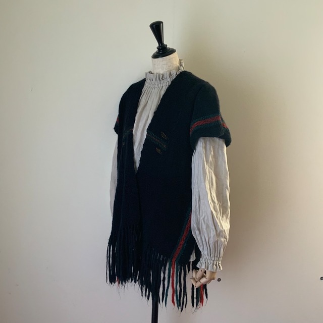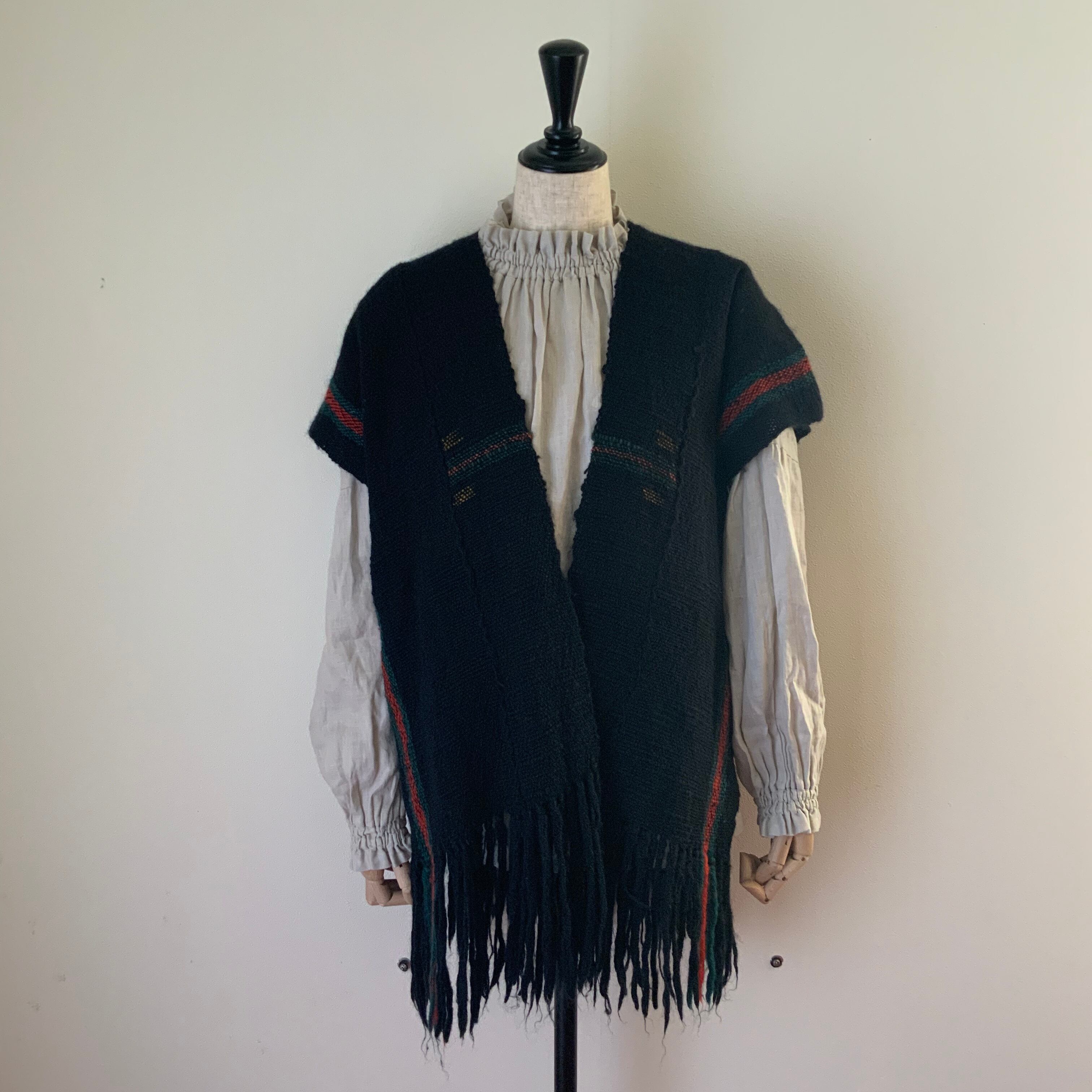 古着らしい織物のベストです [ COLOR ] ブラック レッド × グリーン × イエロー [ SIZE ] 着丈81cm(肩から計測フリンジ含む) [ MATERIAL] 品質表示タグ無し不明 [ CONDITION] 使用感はありますが、傷汚れなくキレイです ※記載の無いわずかなダメージがある場合もあります。予めご了承ください。