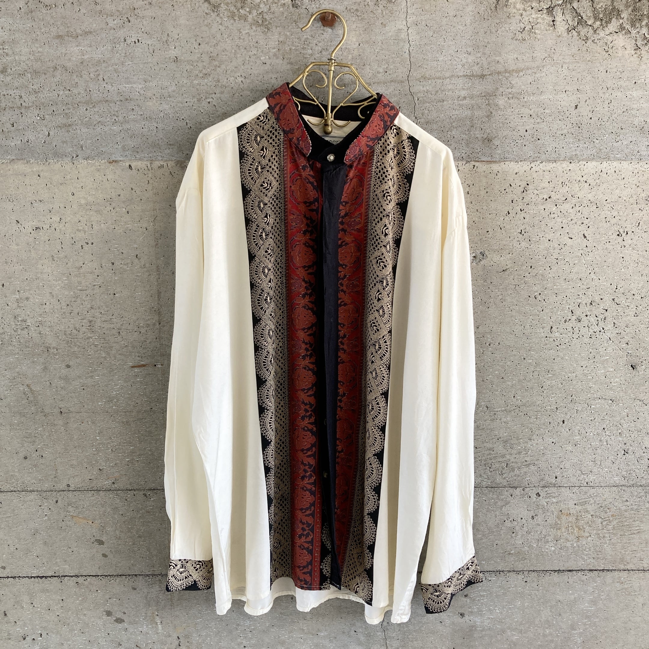 袖裾と服の真ん中に民族柄のような模様がプリントされたシャツです。