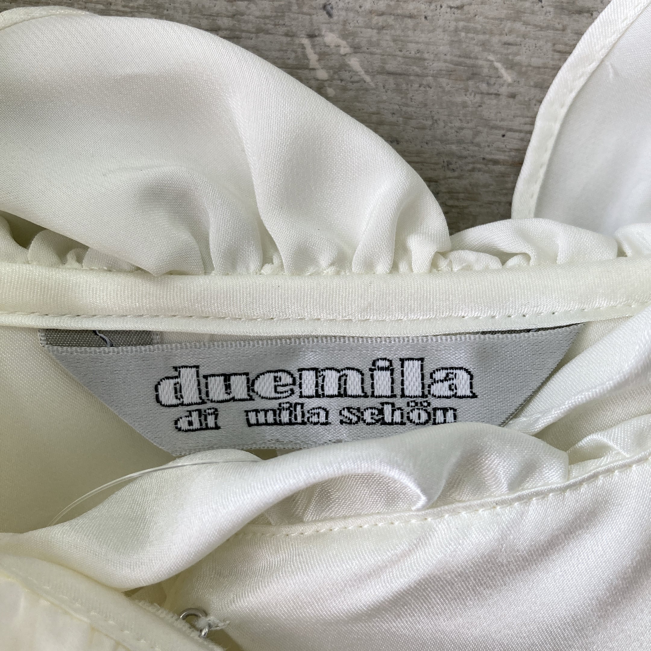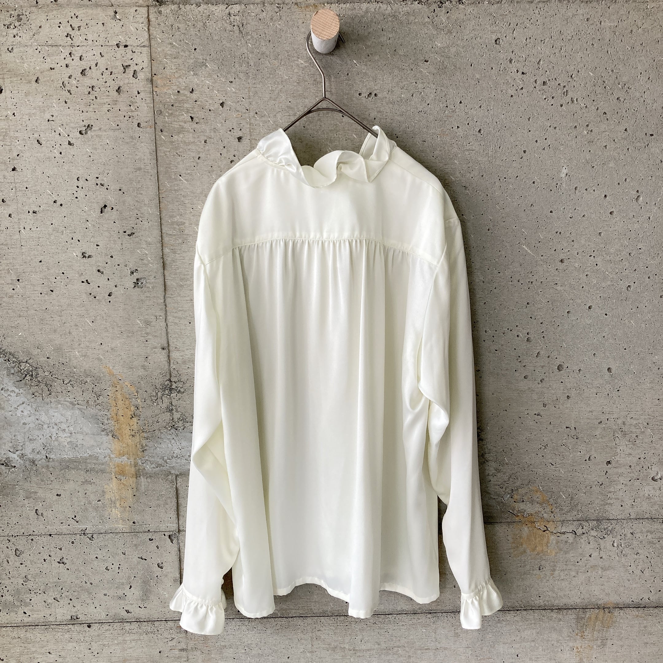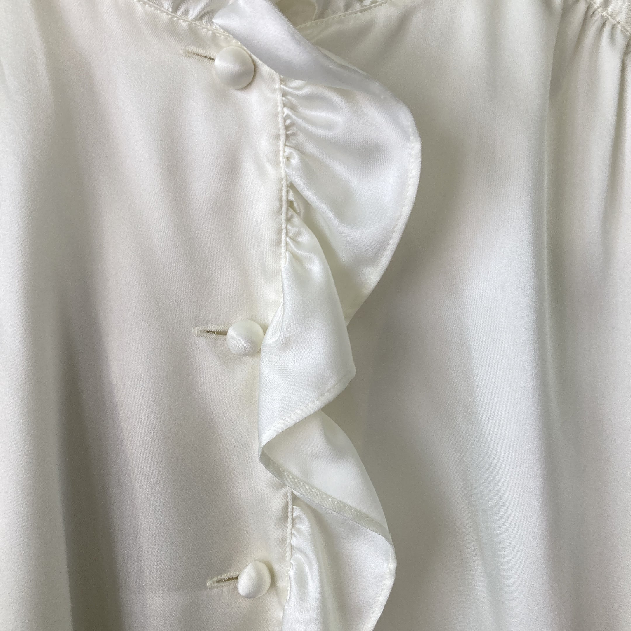 襟や袖がレースになっている白のツルツルした素材のブラウスで肩にタックが入っているのが特徴です。