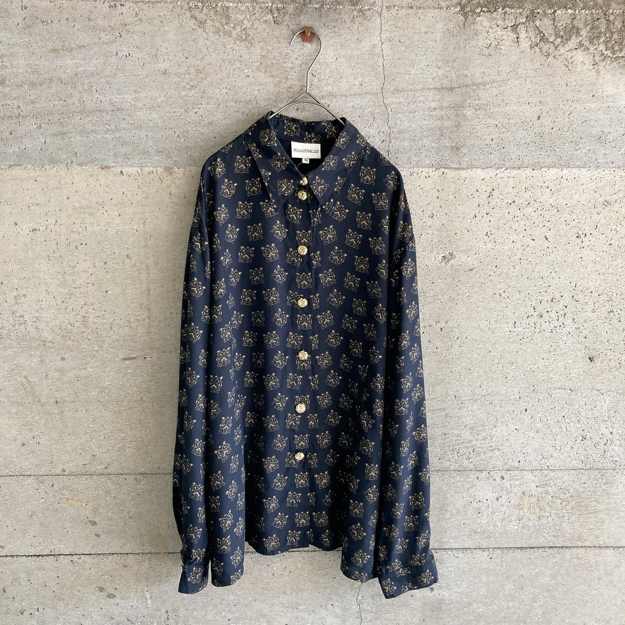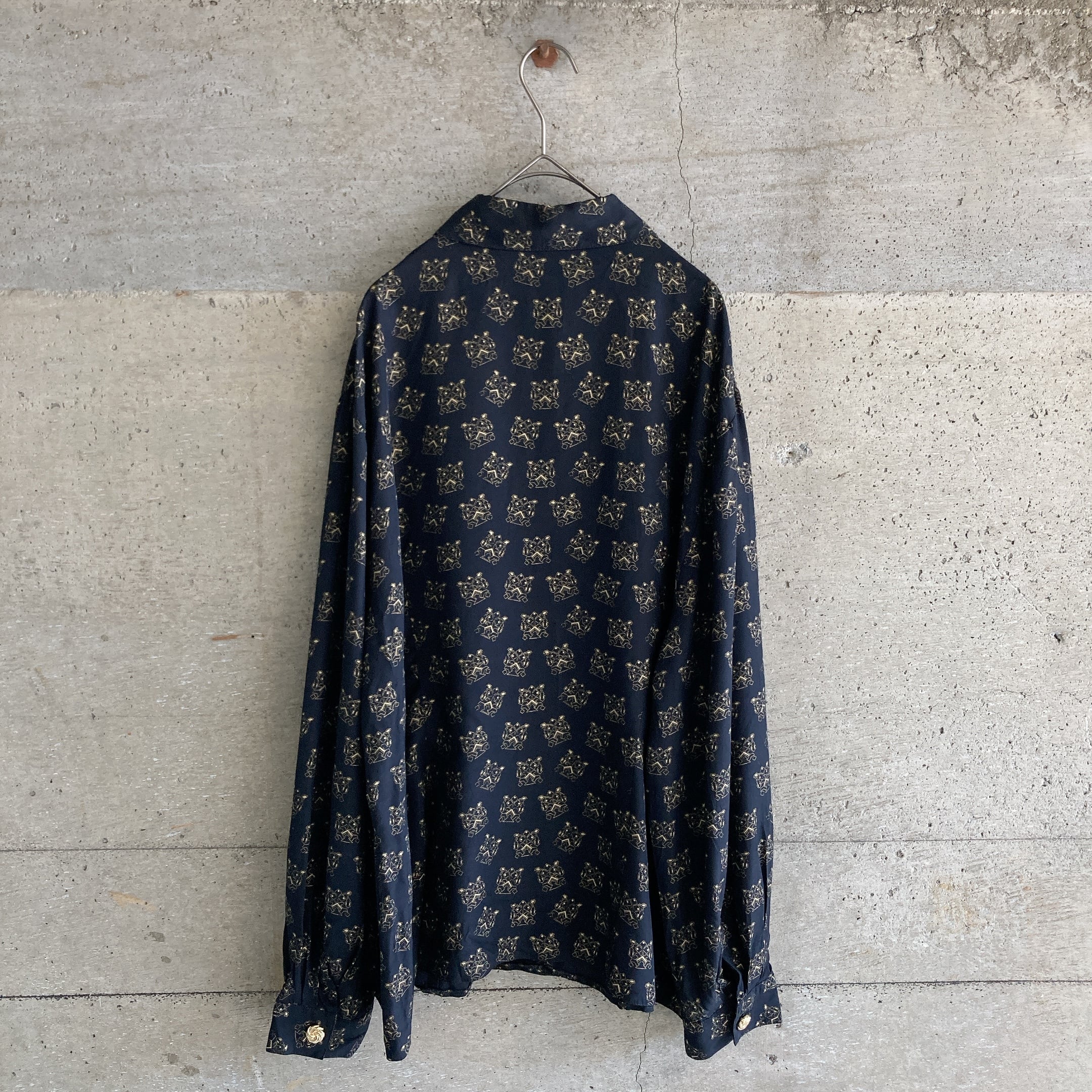 金のボタンと金のプリントにベースの黒が高級感を引き立てているのが特徴のシャツで、透け感のある素材が涼しげなのがポイントです。