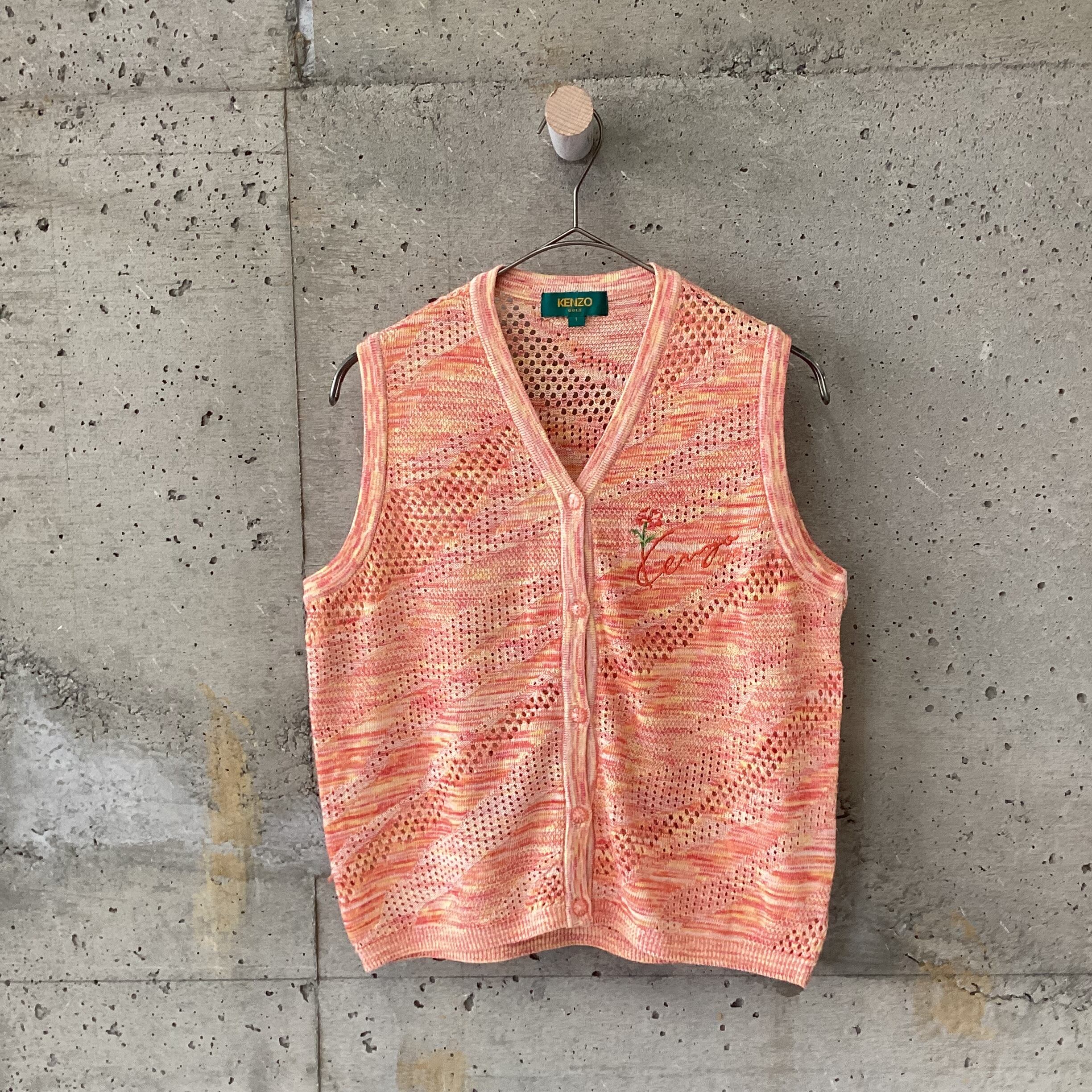 花の刺繍と透かし編みの模様が春らしいニットベストです。