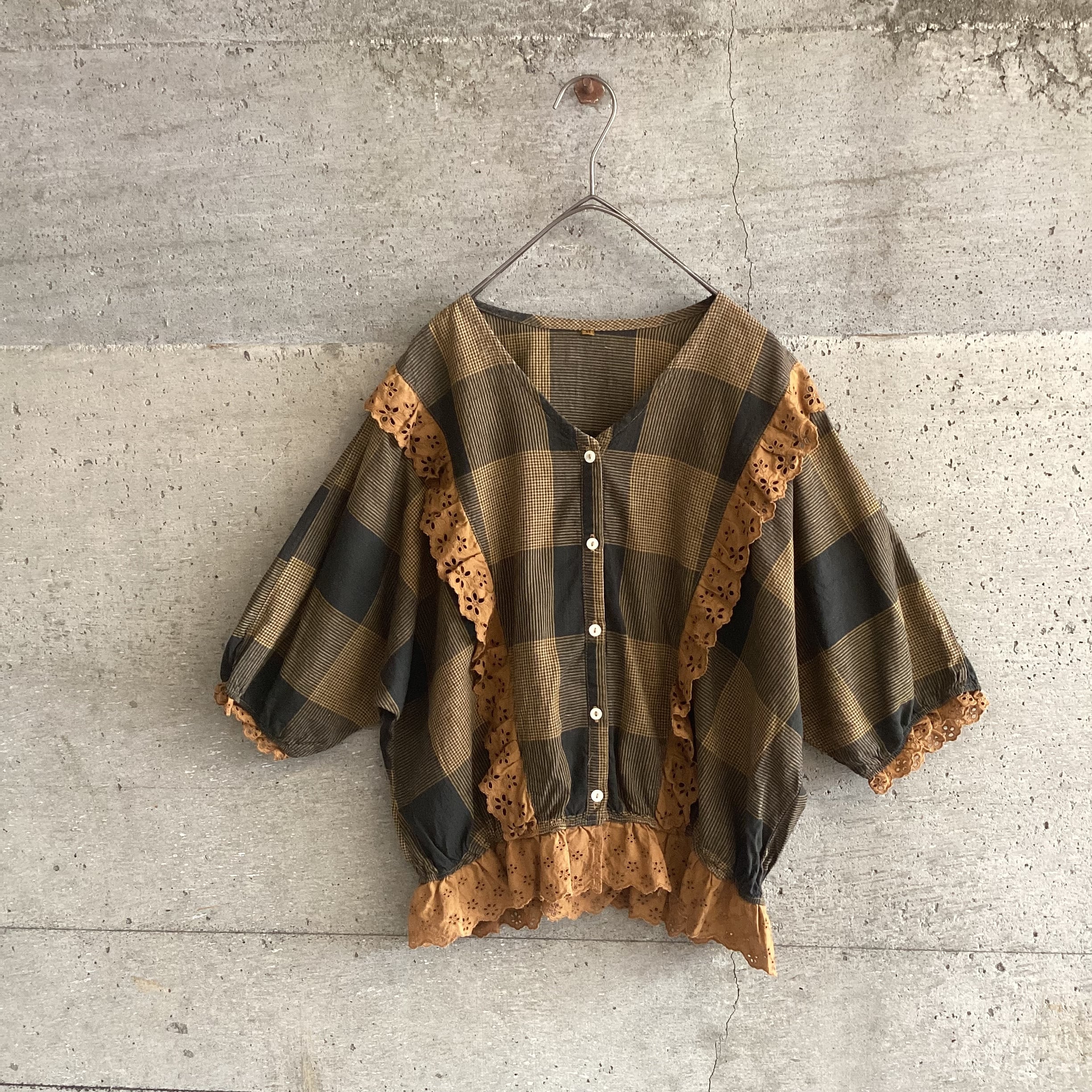 レースリボンとチェックの掛け合わせが可愛いブラウス