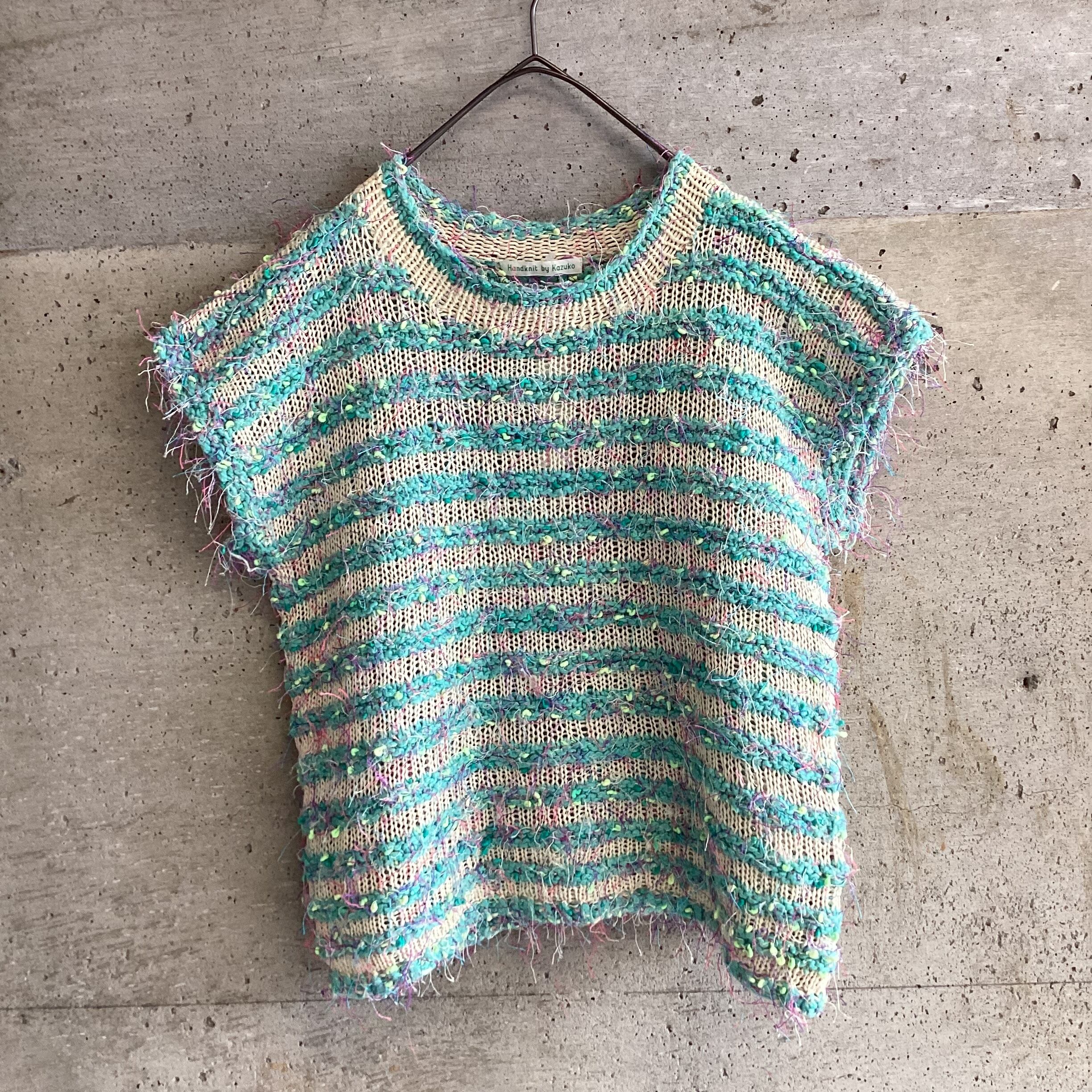 爽やかなボーダーの掛け合わせのニットに糸が出ているのがポイントです