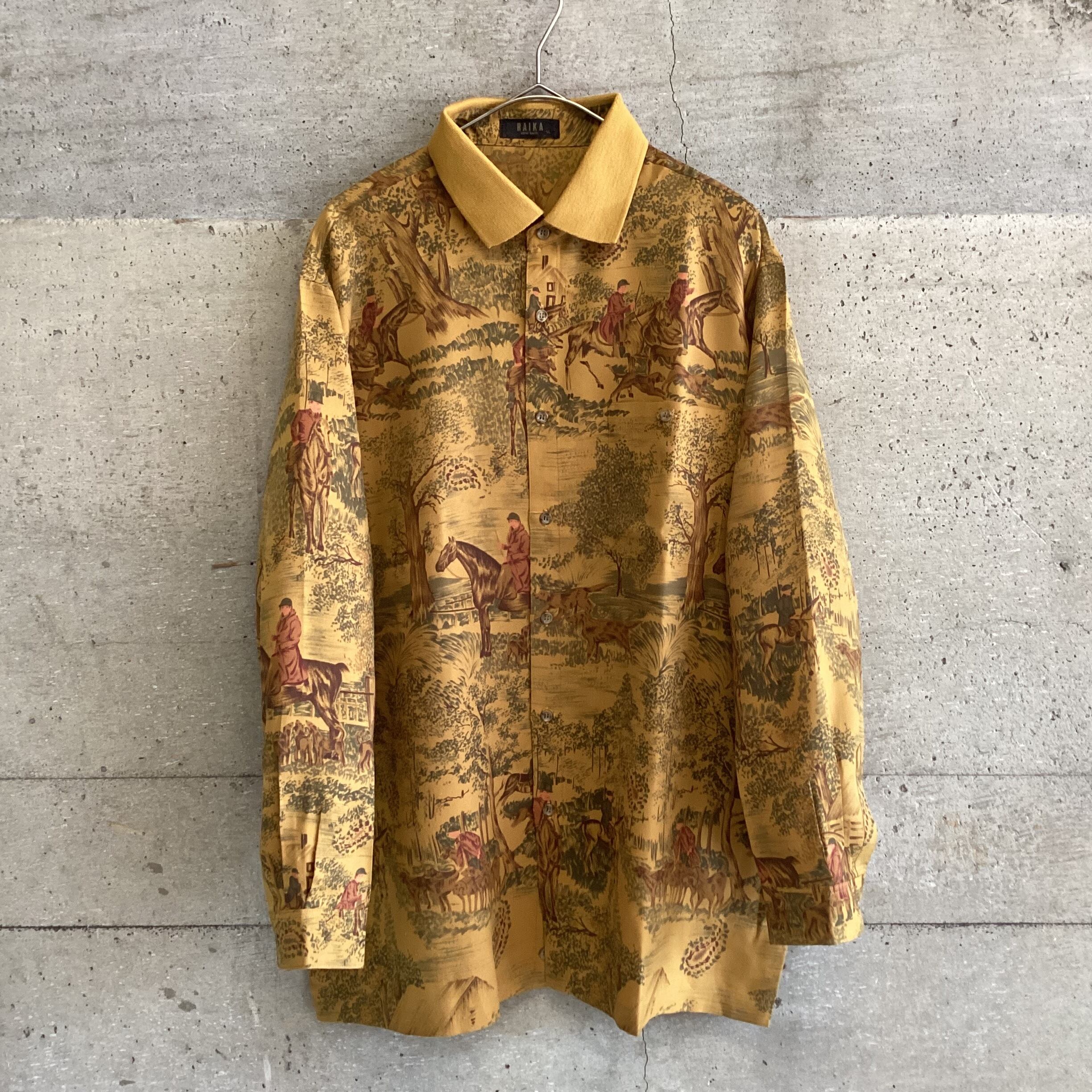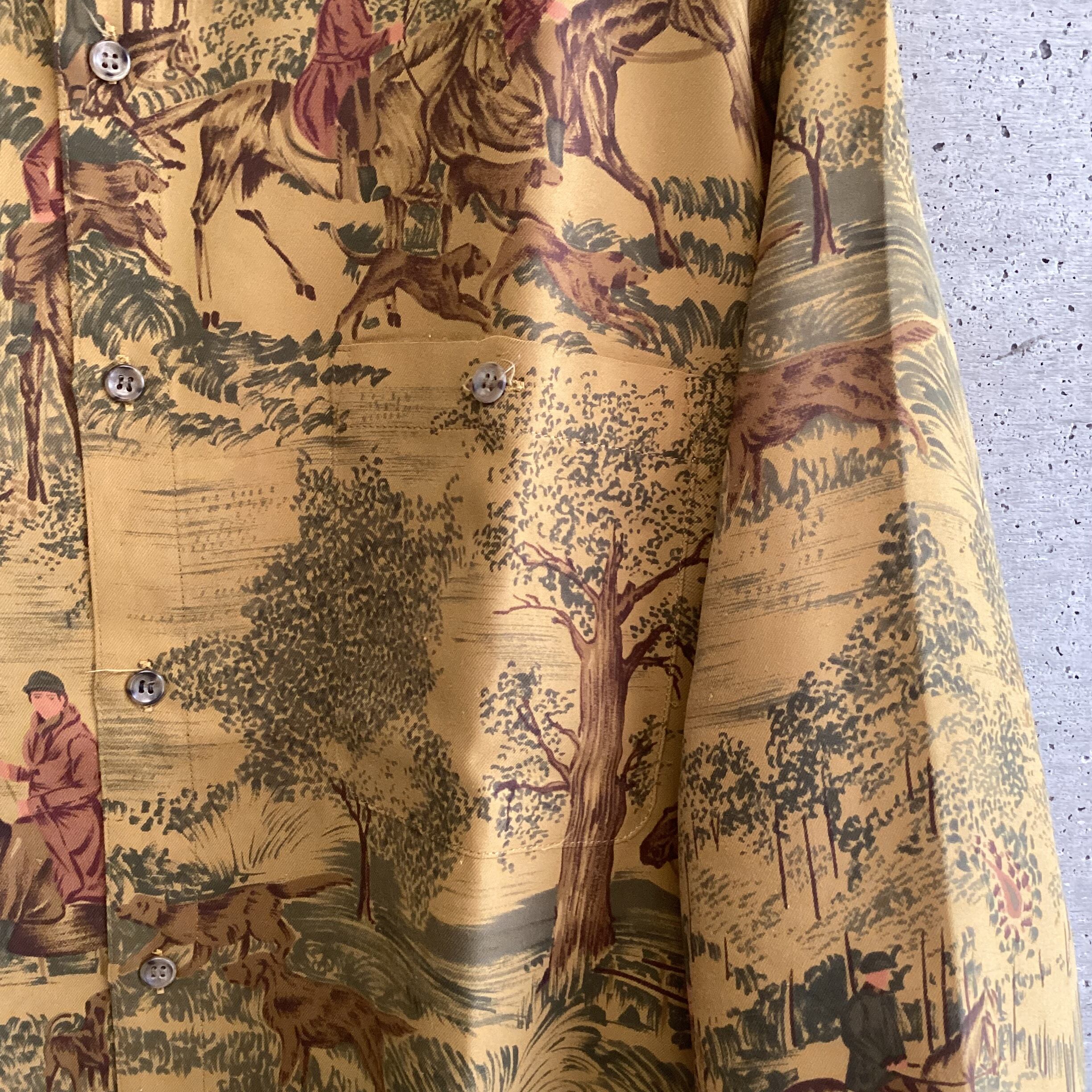 馬に乗って狩をしている様子が描かれたシャツです。