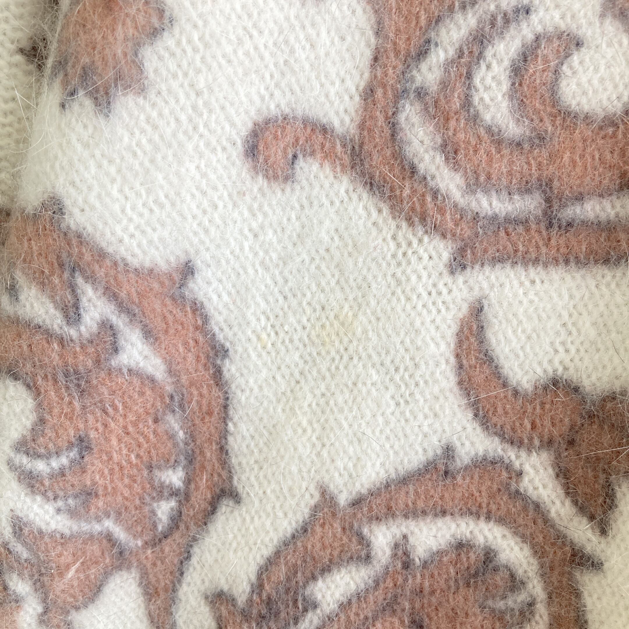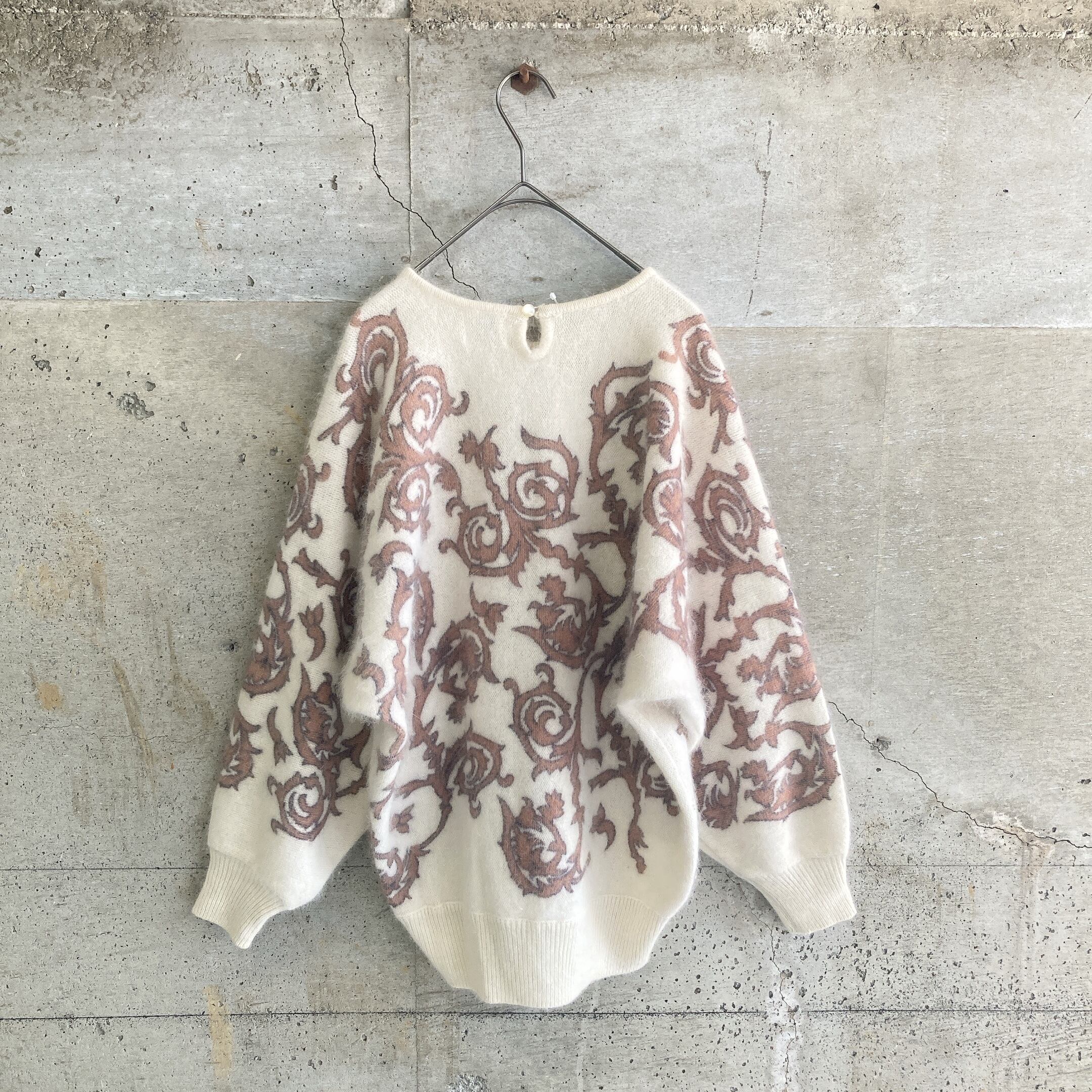 毛足の長いモヘヤは女性らしいイメージになりがちですが、個性的な柄やドルマンスリーブなのが強い印象です