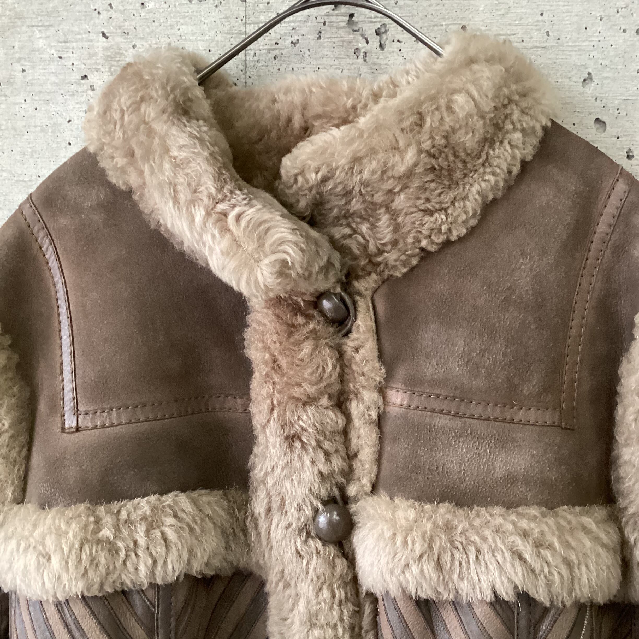 細かいパッチワークになった凝ったデザインのムートンジャケットです