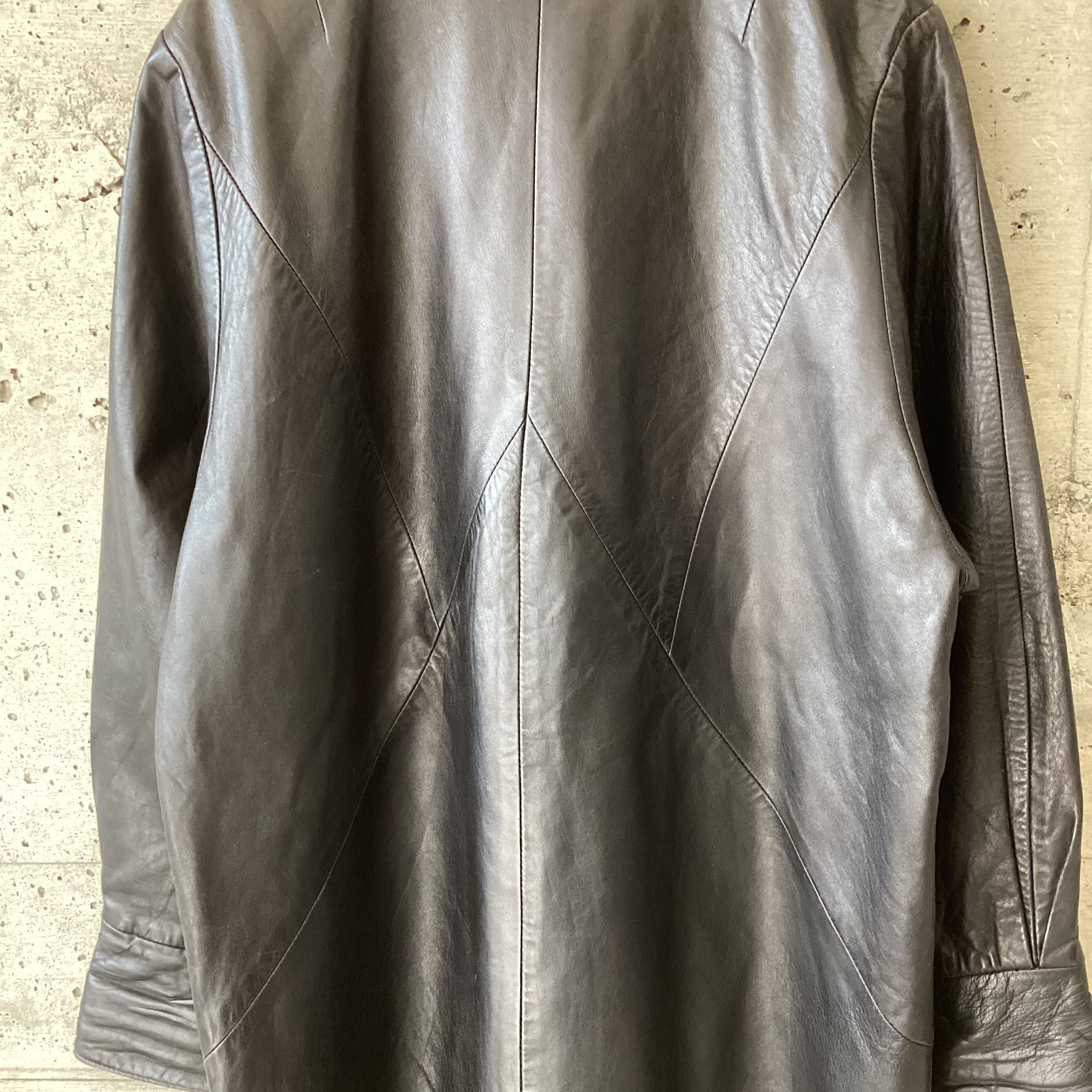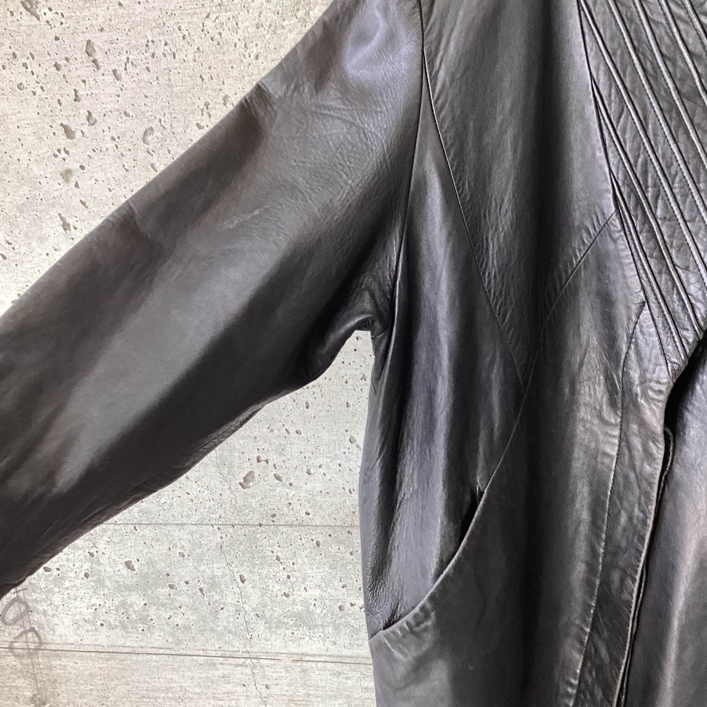 襟の切り替えが細かく、全体にも切り替えが入った凝ったデザインのレザーコートです