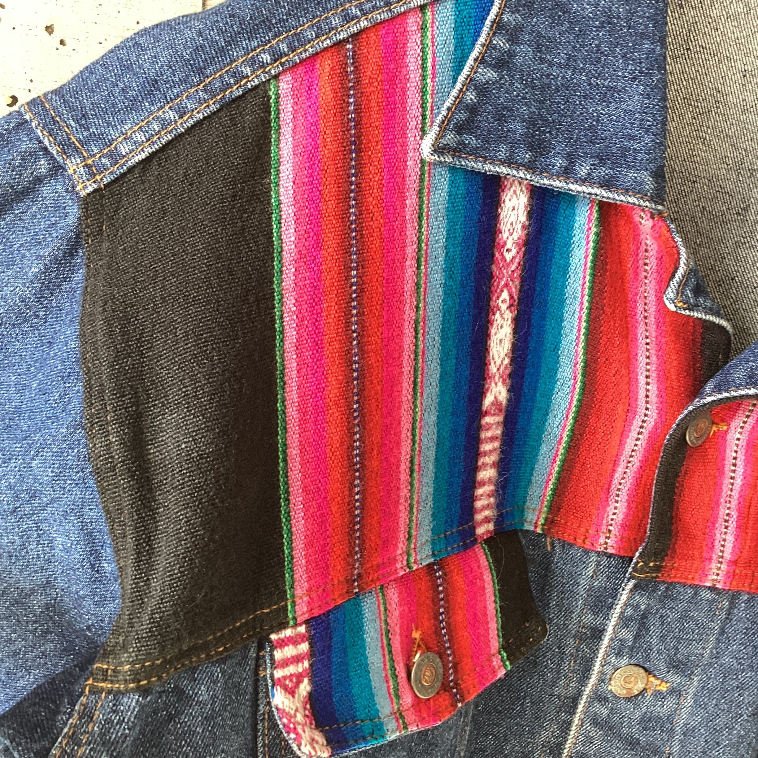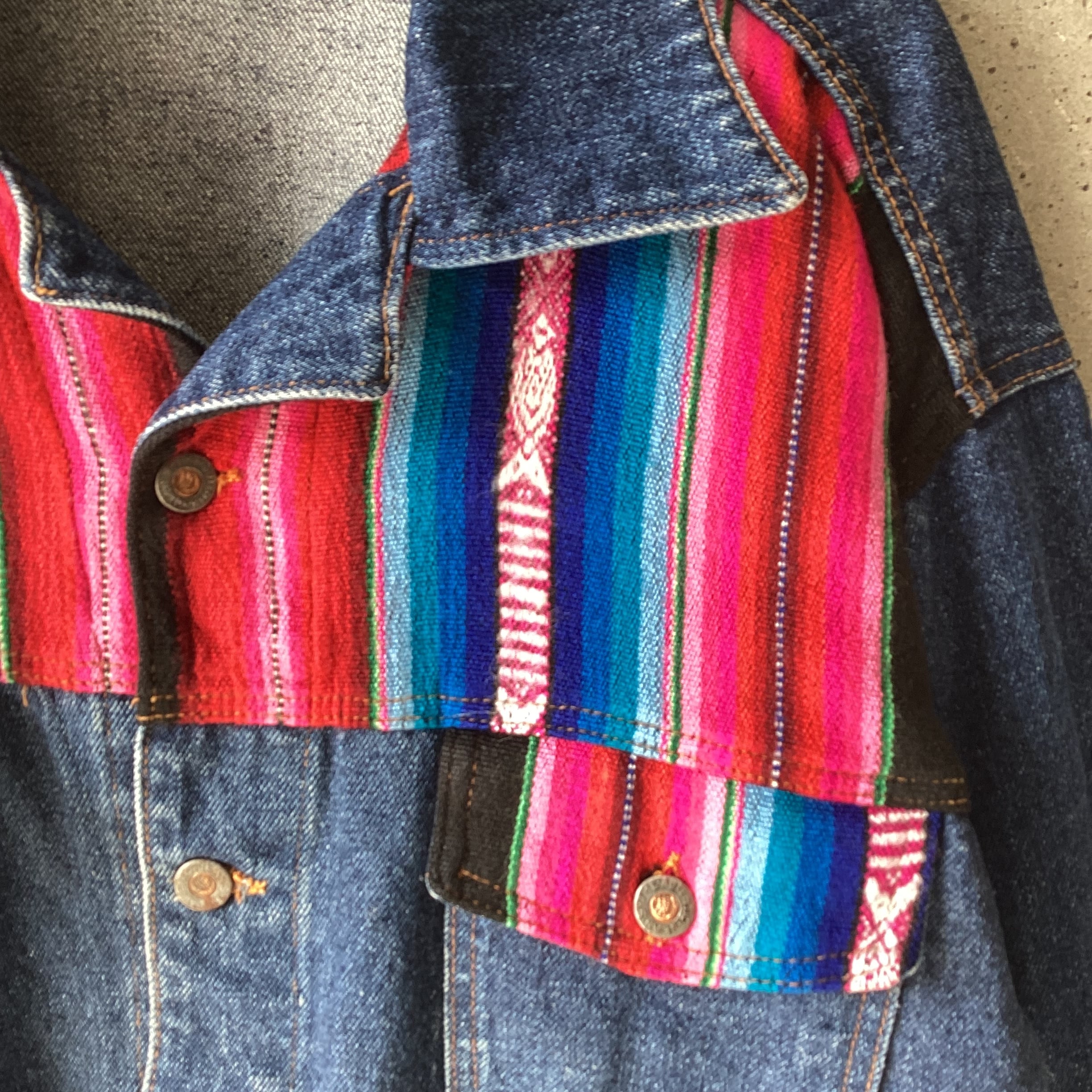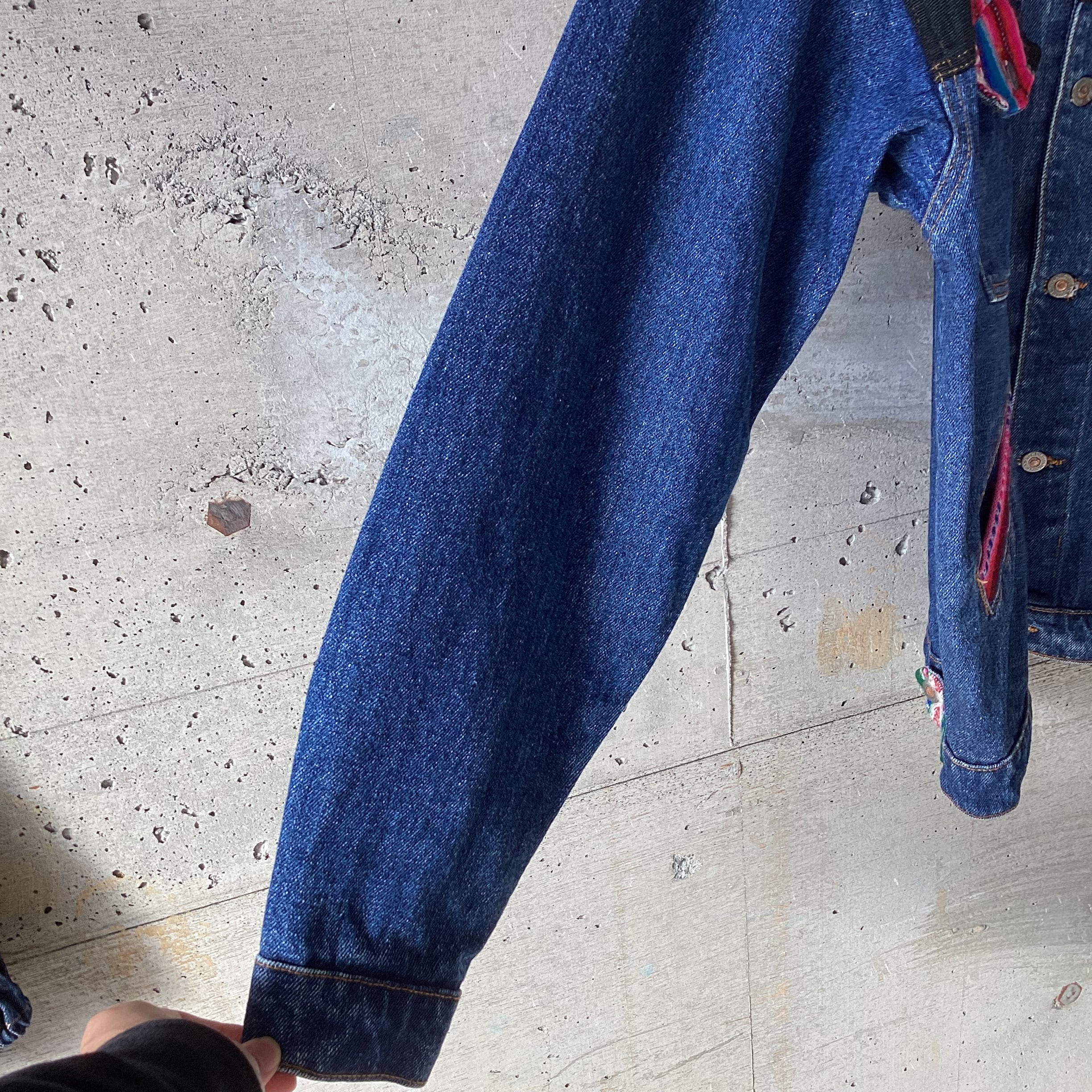 ネイティブアメリカンのタペストリーの生地と切り替えになったようなデニムジャケットです