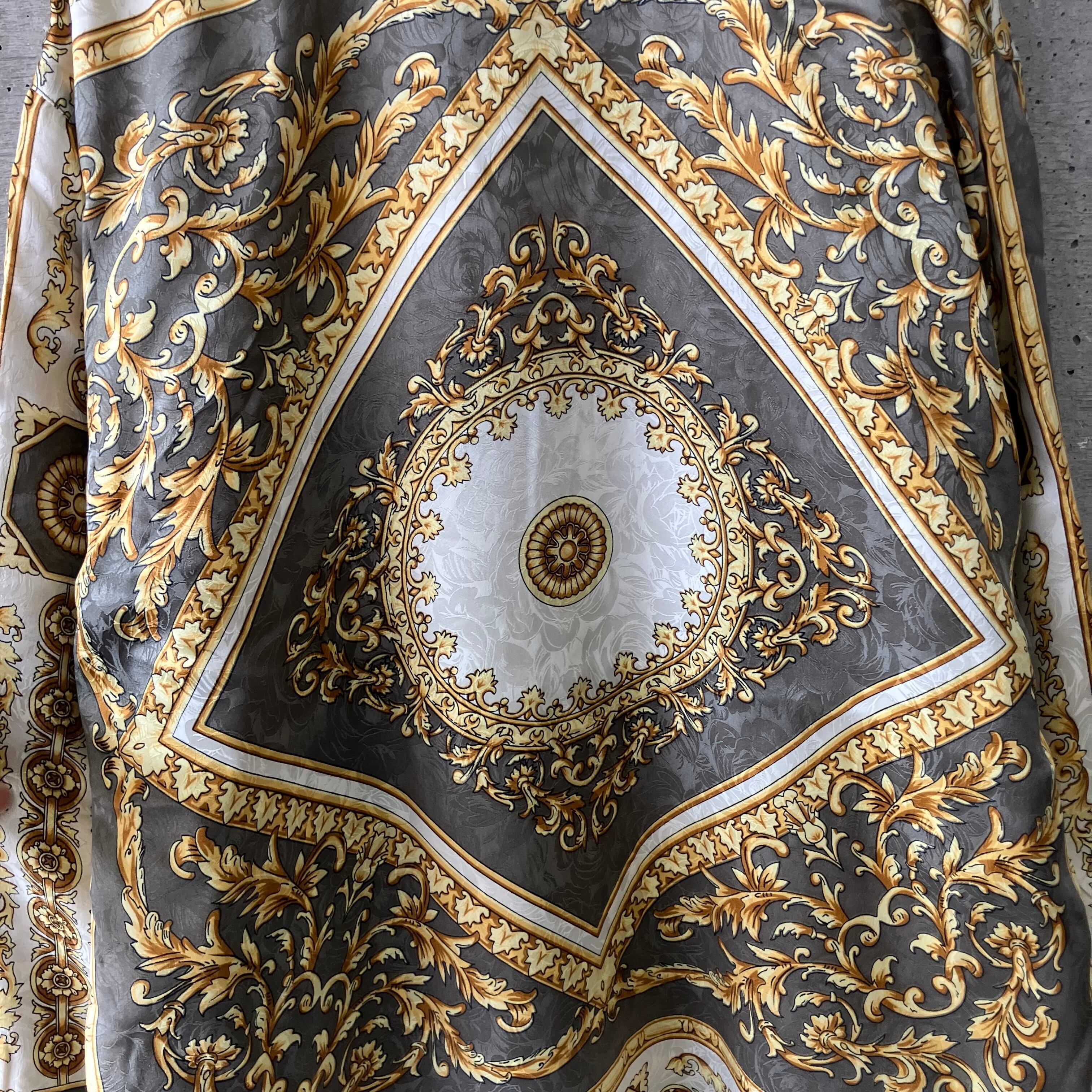 スカーフにあしらわれるような綺麗で派手目な柄がプリントされたシルクのジャケット。