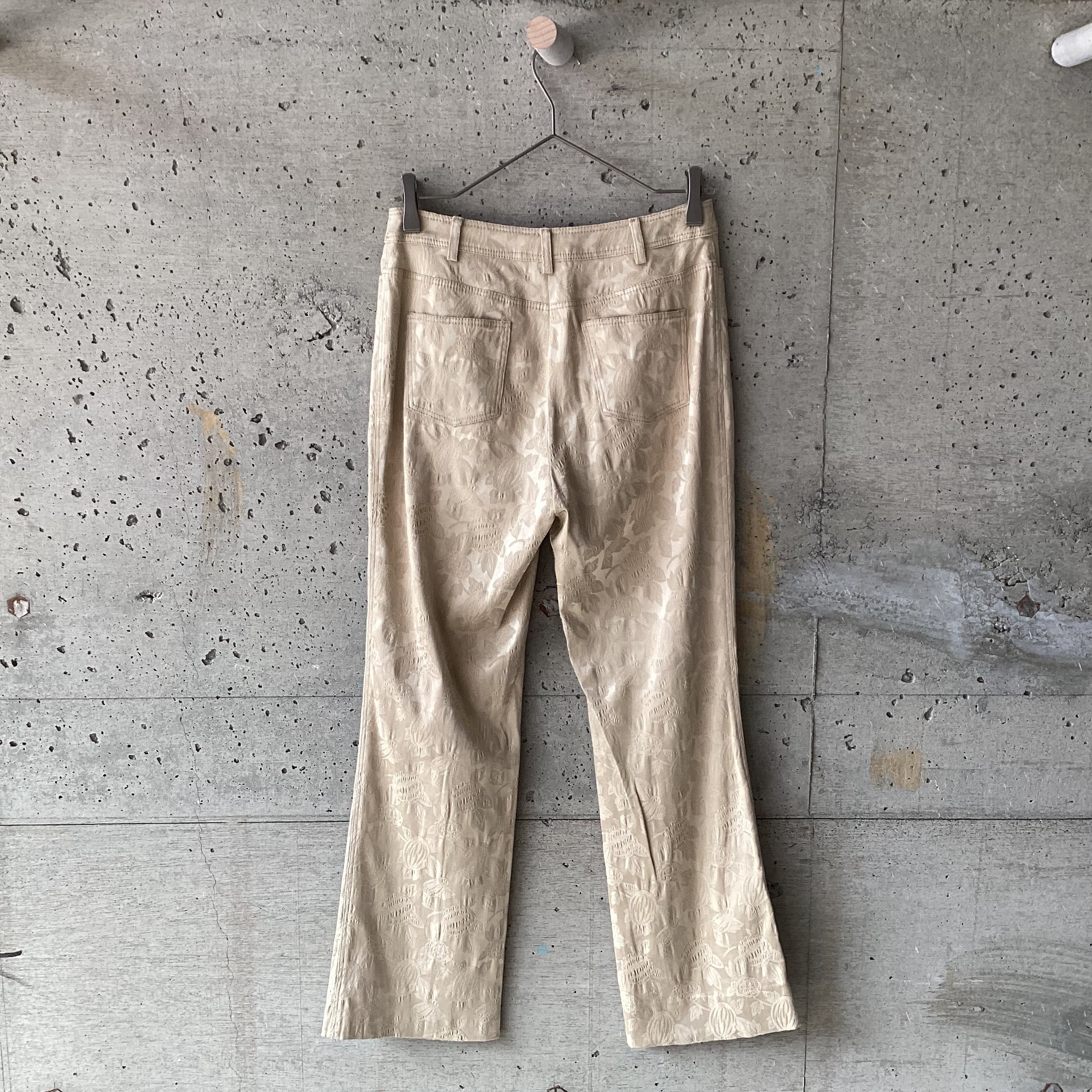 ボタニカルな柄の織りがされた薄手の生地のパンツです