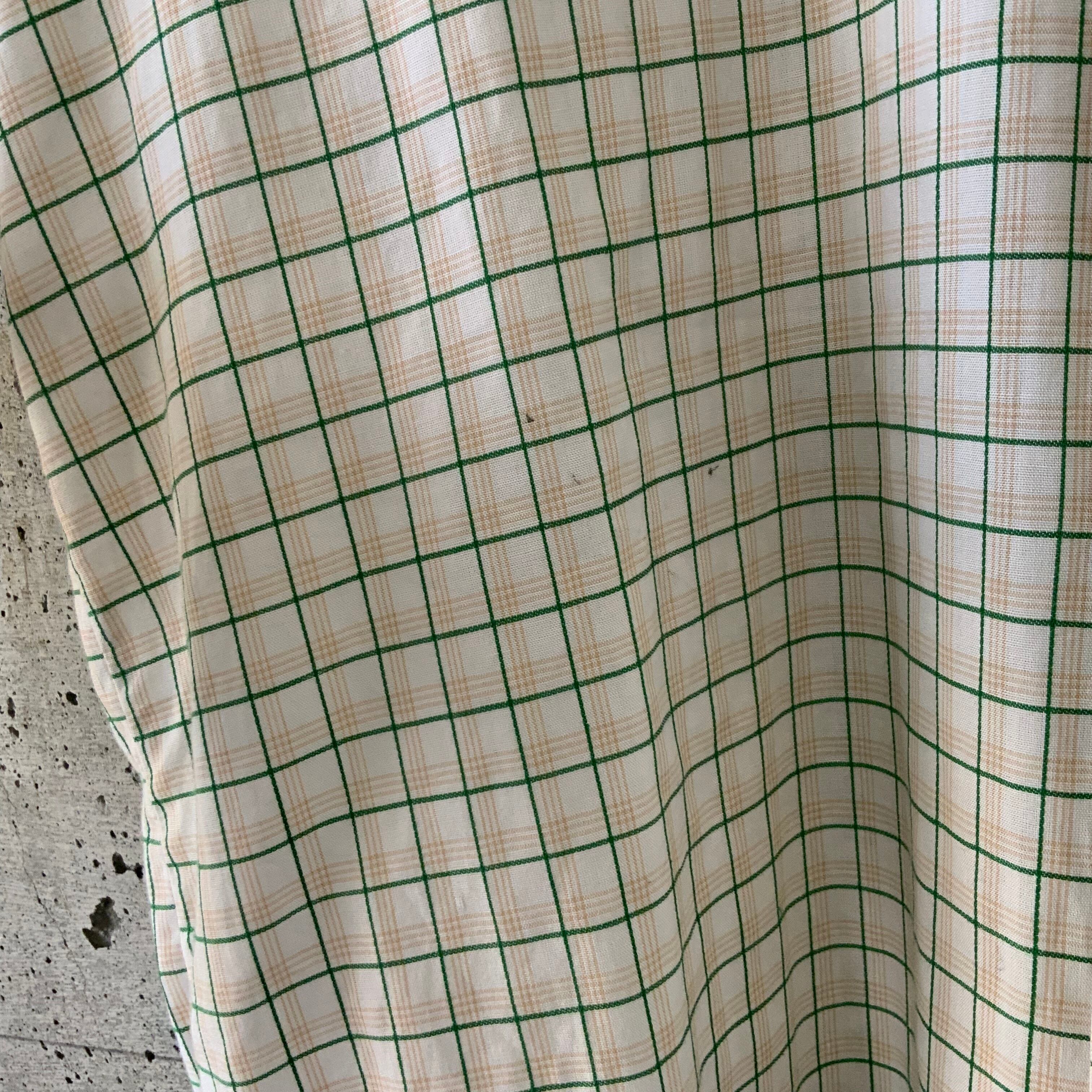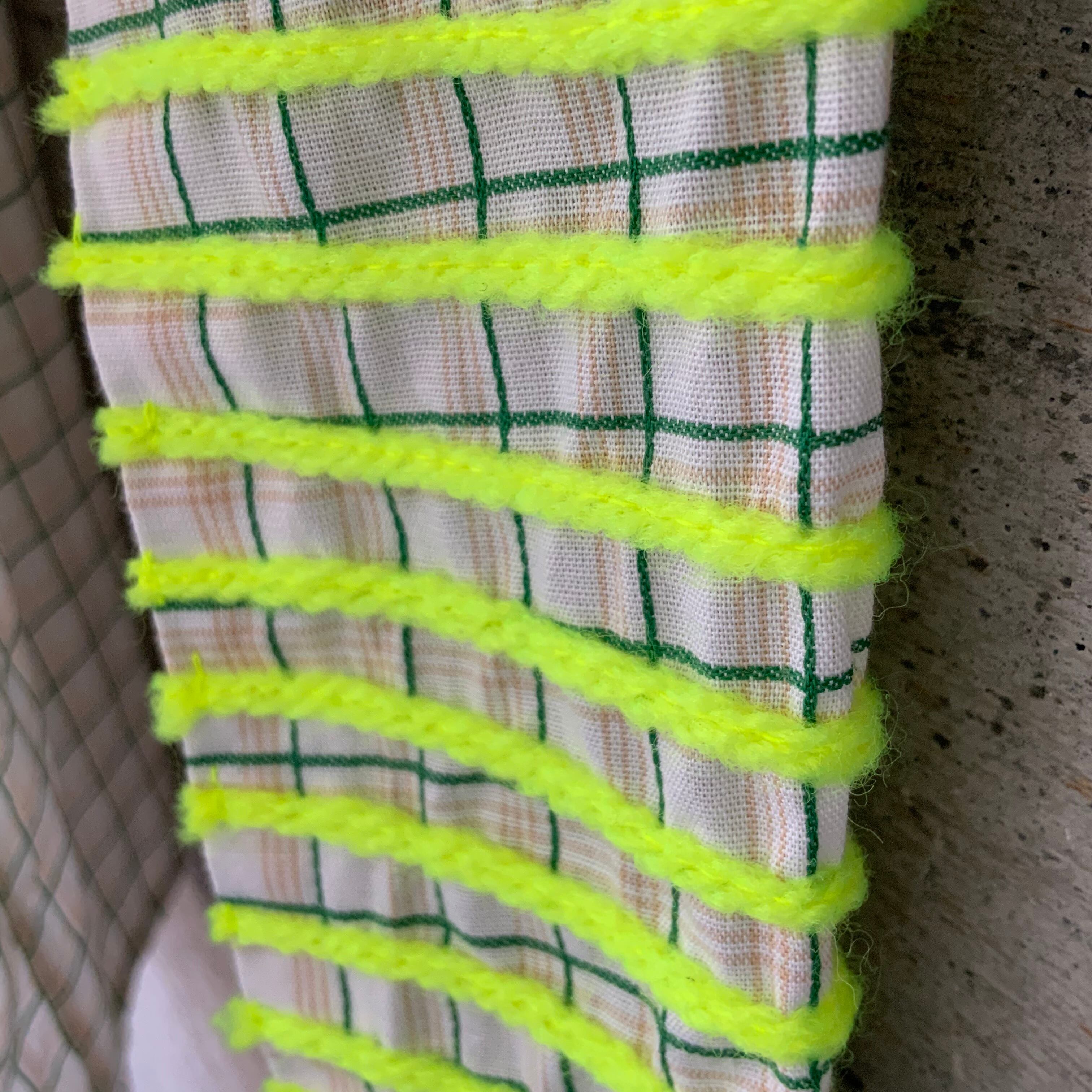 緑とベージュのチェックに蛍光の黄色の毛糸が明るく映えます。