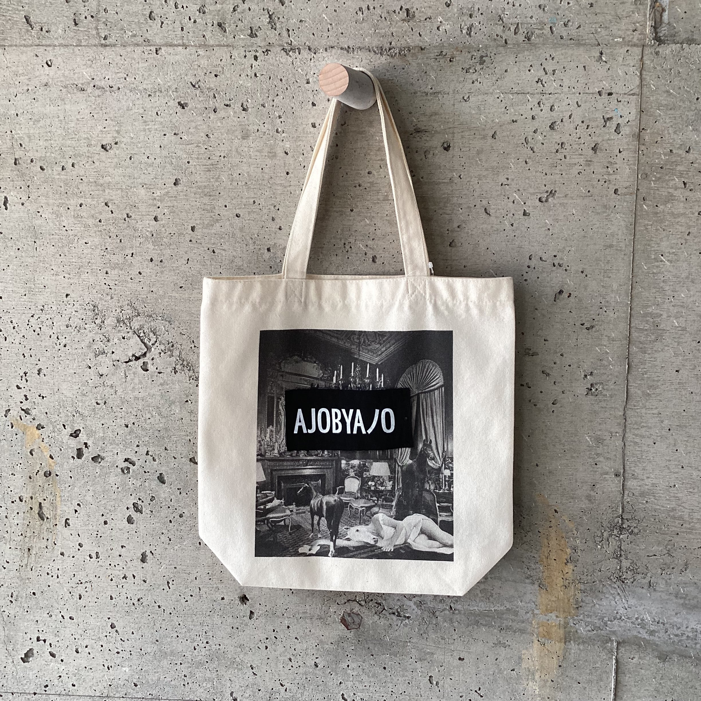 岡山淑子の企画展トートバッグに、ブランドAJOBYAJOのタグを上から付けたトートバッグ