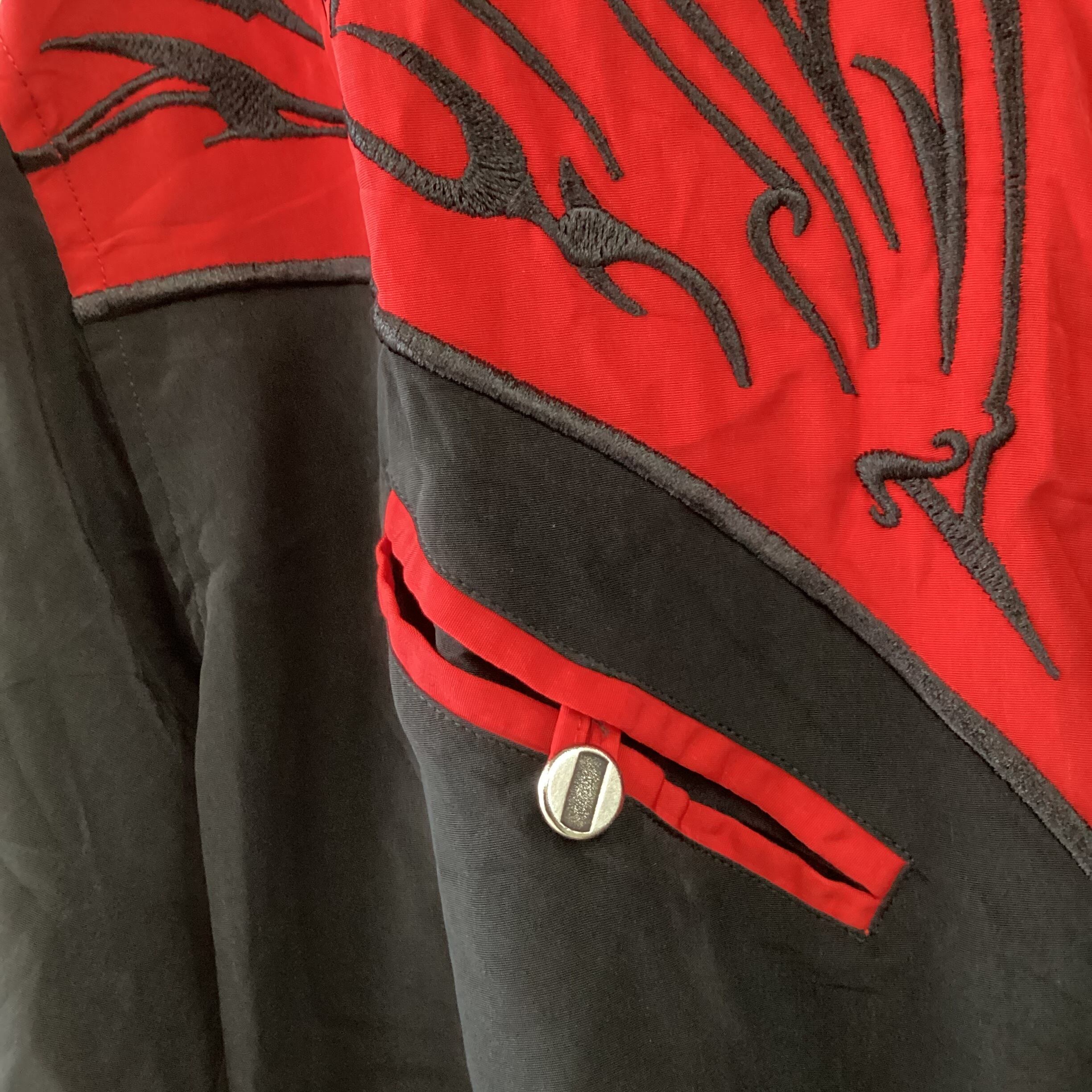 黒と赤の強い組み合わせの配色に、ファイヤーパターンのような刺繍が入っています