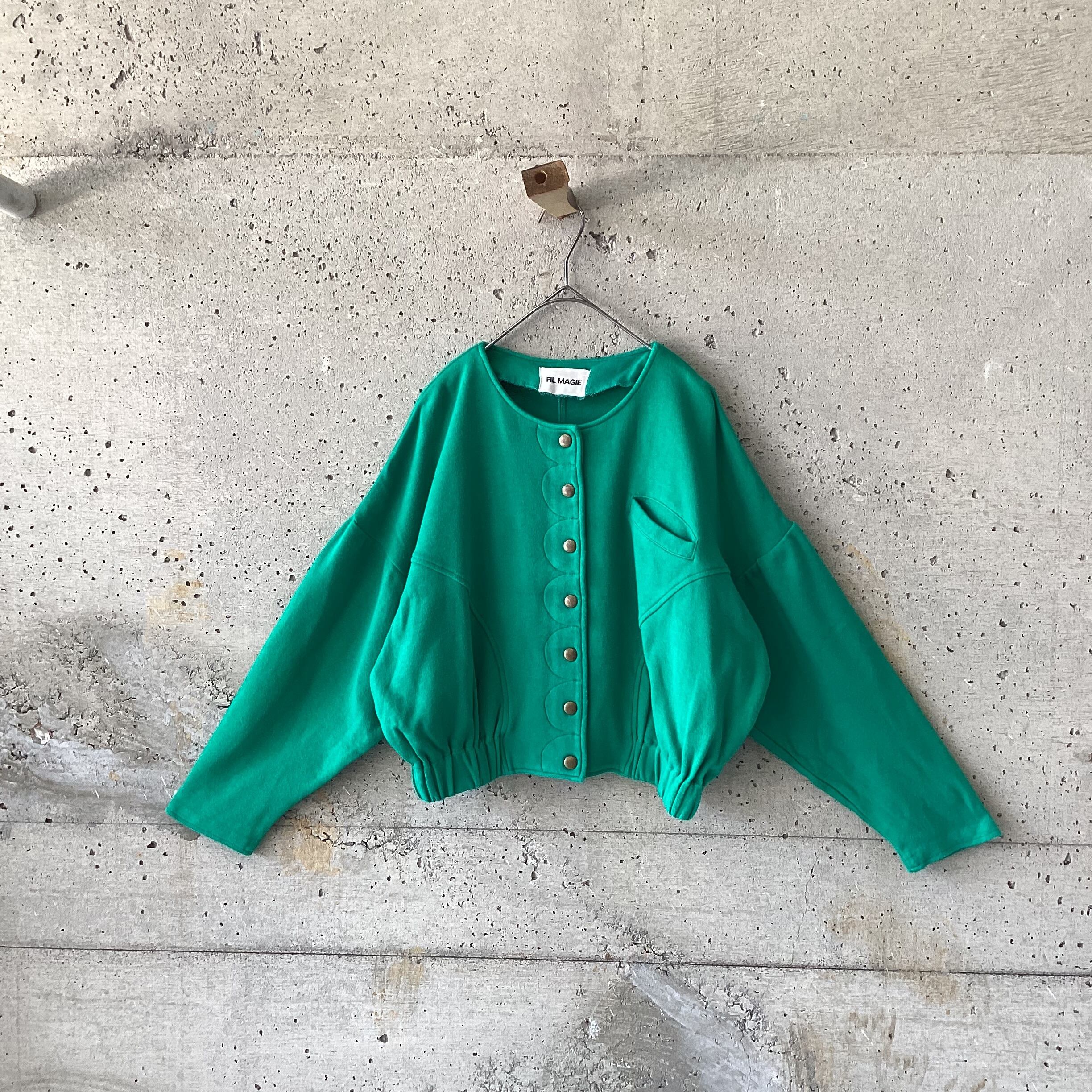 大きめのスナップボタンと、その周りのステッチが可愛らしいスウェット生地のカーディガンです。