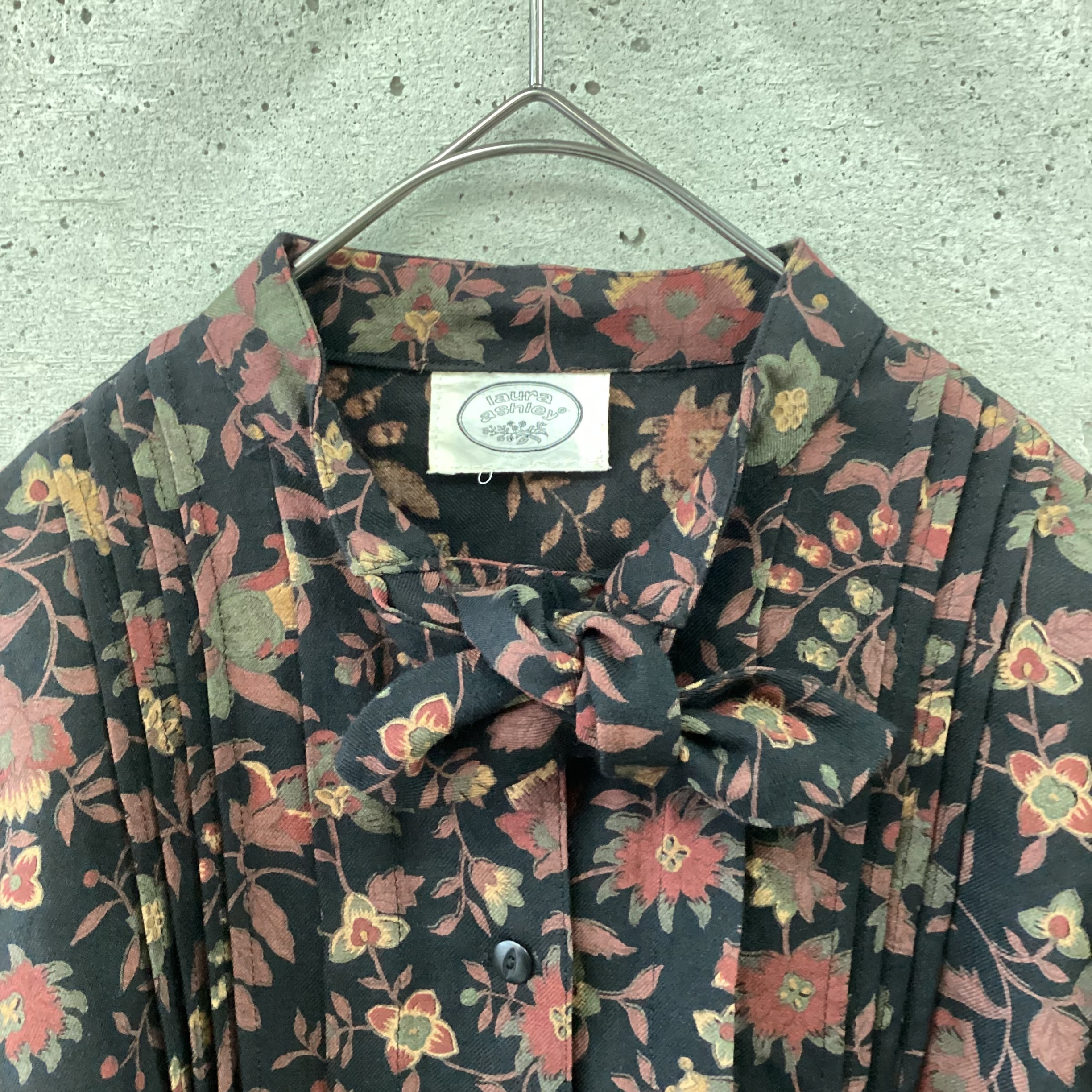 トップスには綺麗なピンタックのラインがあしらわれ、リボンタイのような飾りが付いています。結んで着るのも、垂らしておくのも細めの指輪などでくくるのも素敵です。