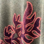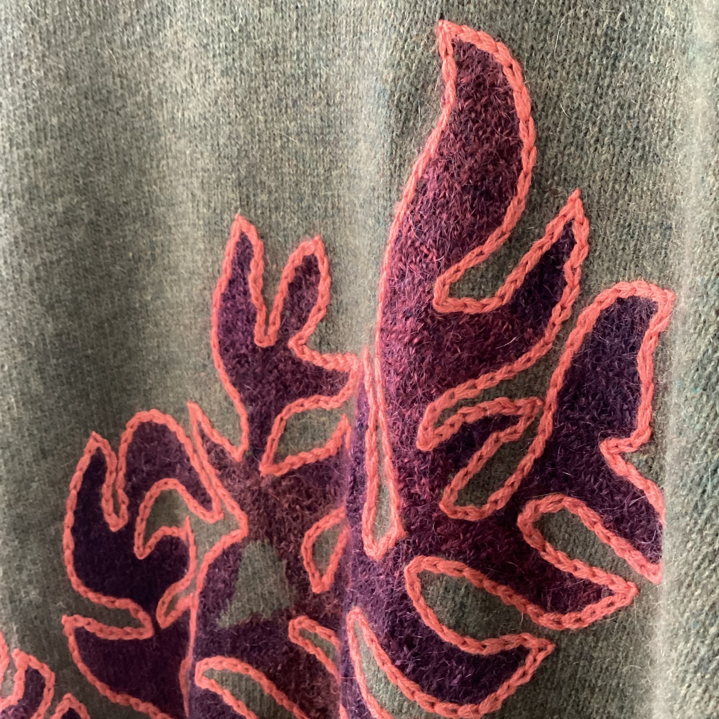 柄はボルドーの毛足の長い糸で編まれていて、その周りをオレンジの糸がチェーンステッチで囲んでいます。
