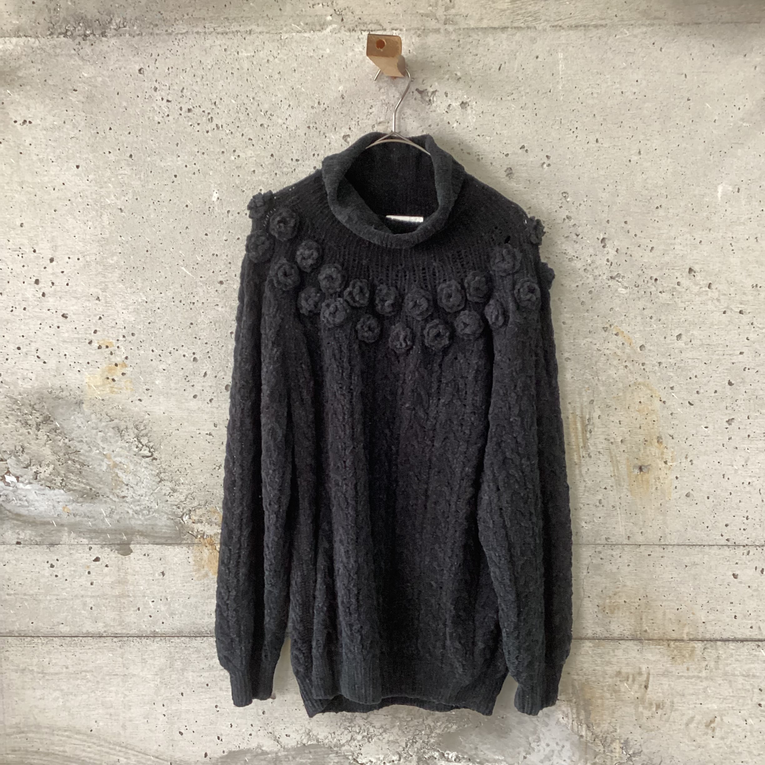 タートルネックで暖かく、、襟もとには立体の花があしらわれています。