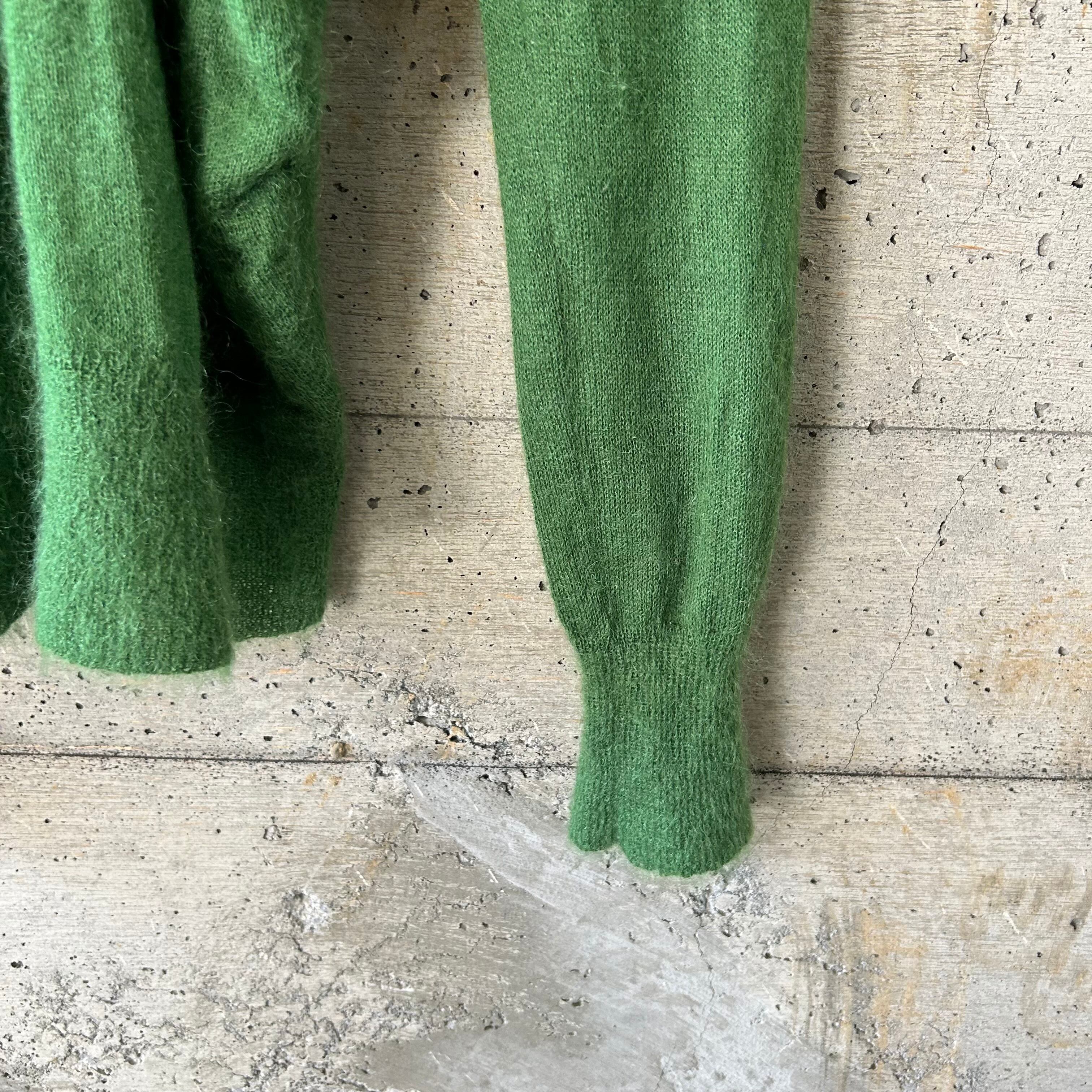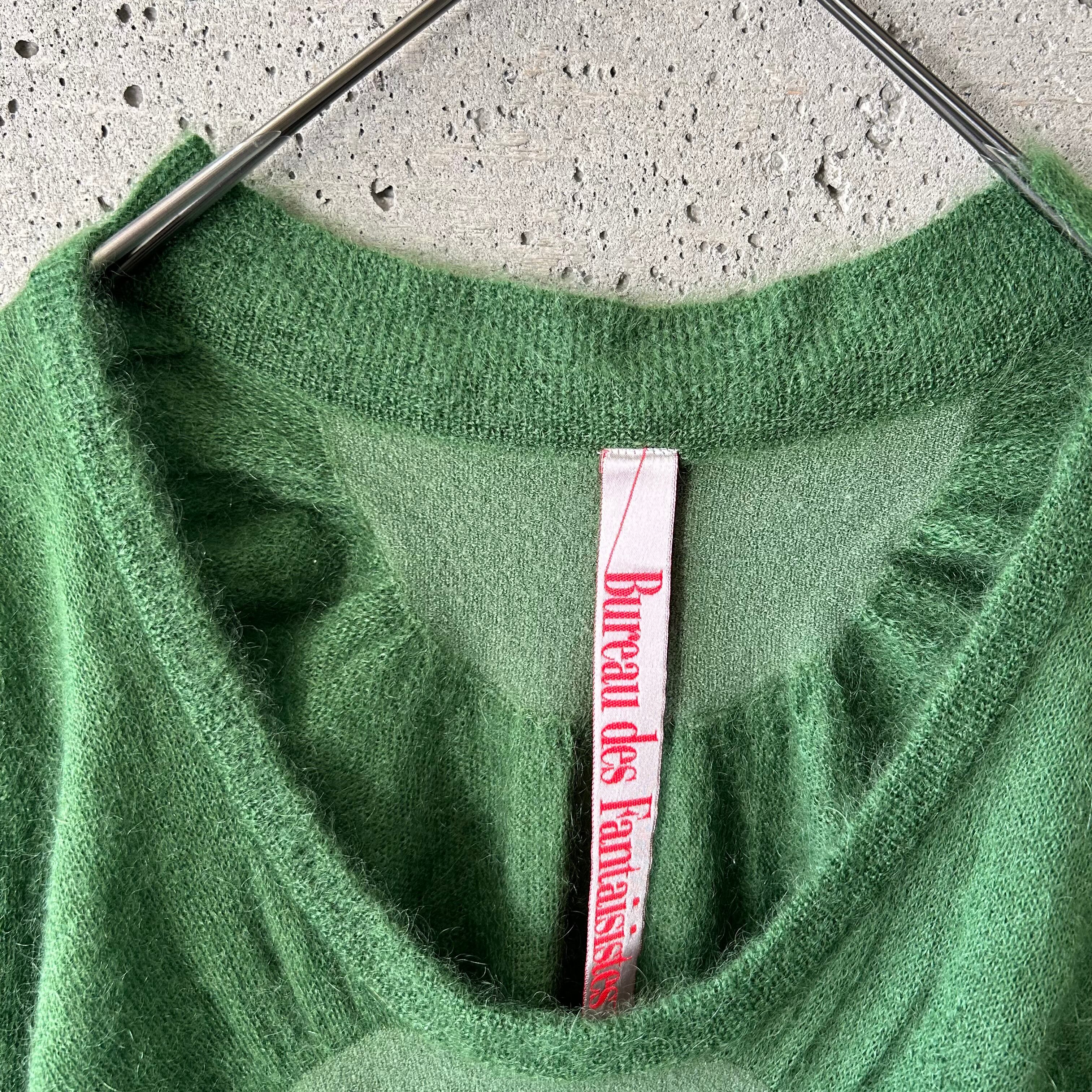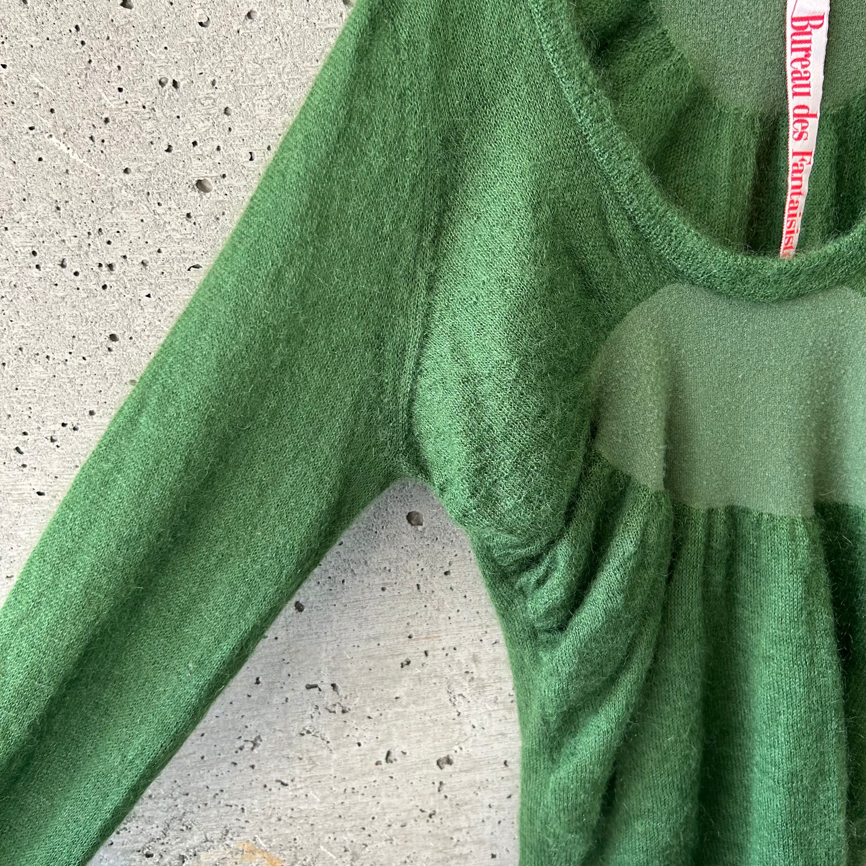 フロントとバックに1箇所ずつ、編み地の切り替えがあります。ベースの色より淡めのグリーンで、ゴムのように伸縮性の高い糸で編まれているため、ギャザーがより、変形していてとても面白いです。