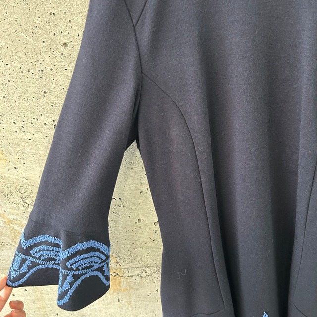 濃紺のボディに薄めの青の刺繍のコントラストが美しく、色々な場面で活躍できそうです。すっきりとした細めの袖先はベルスリーブになっていて、ボディも同様にフレアになっているため統一感があり、とても綺麗です。