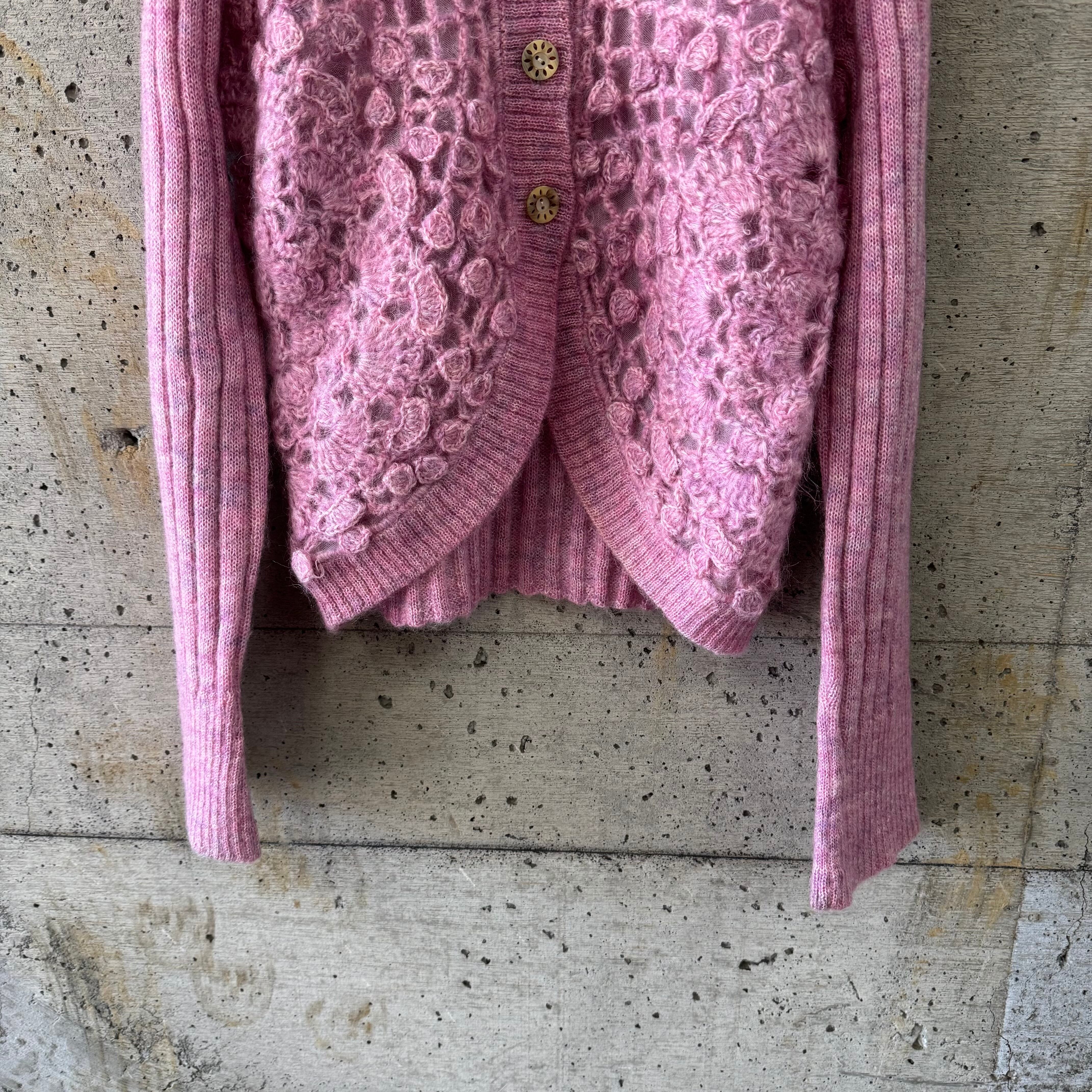 透かし編みのニットの下にシアー素材が縫われていて、透け感が綺麗なニットです。