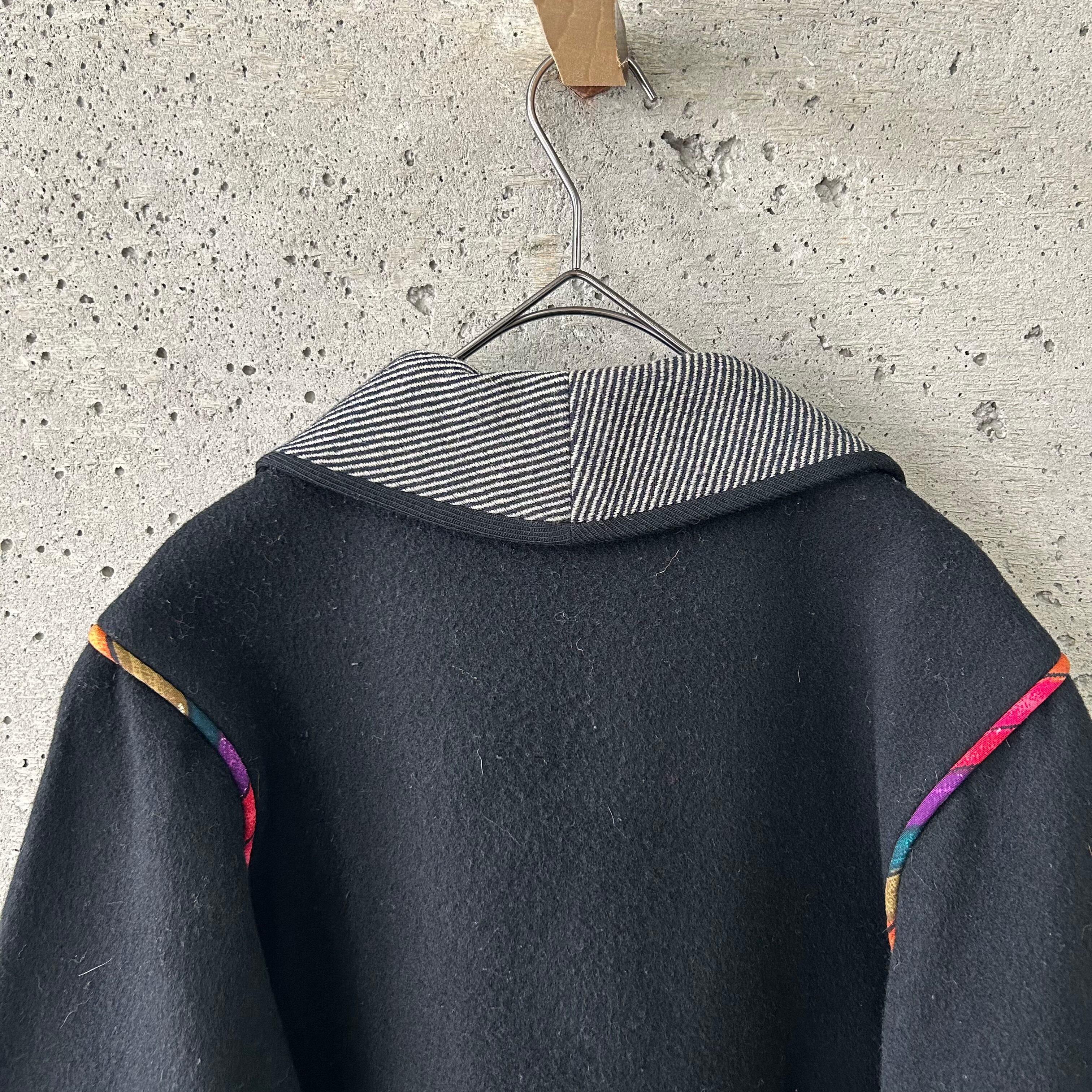 カラフルなパイピングとボタン、縞模様の襟元など、黒いボディですが重くなく、とても気軽に羽織ることができる素敵な1着です。