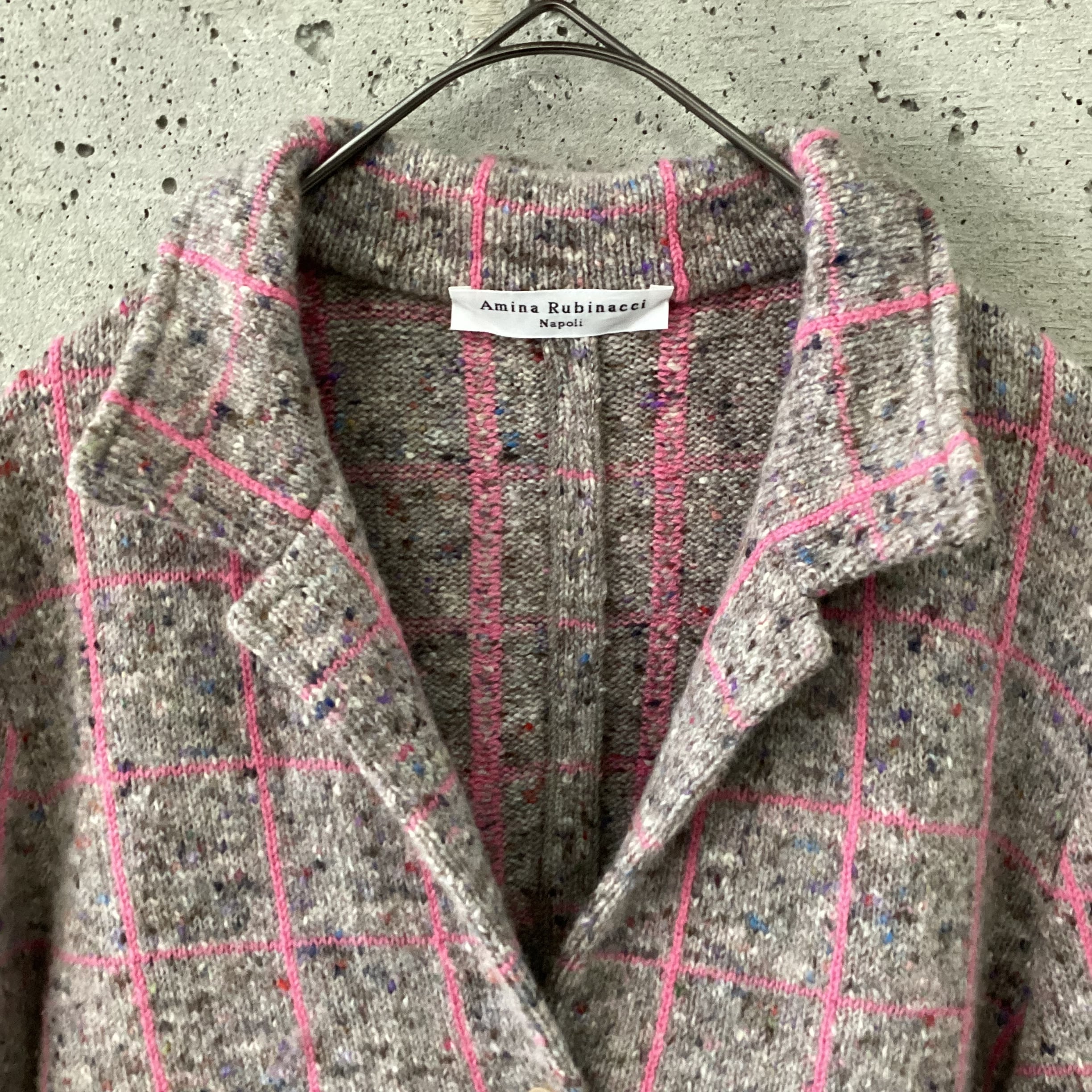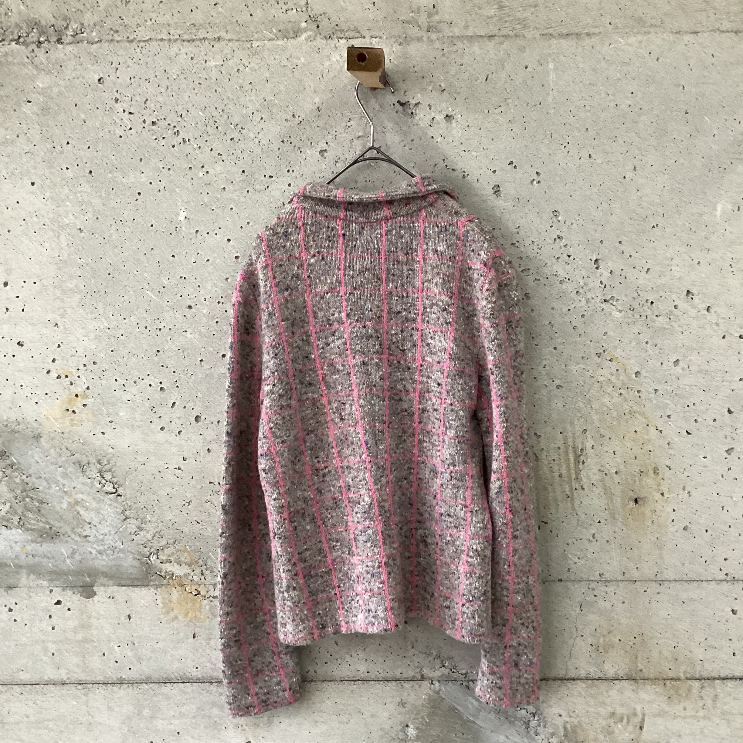 ピンクのチェックラインがポイントになったニットジャケットです