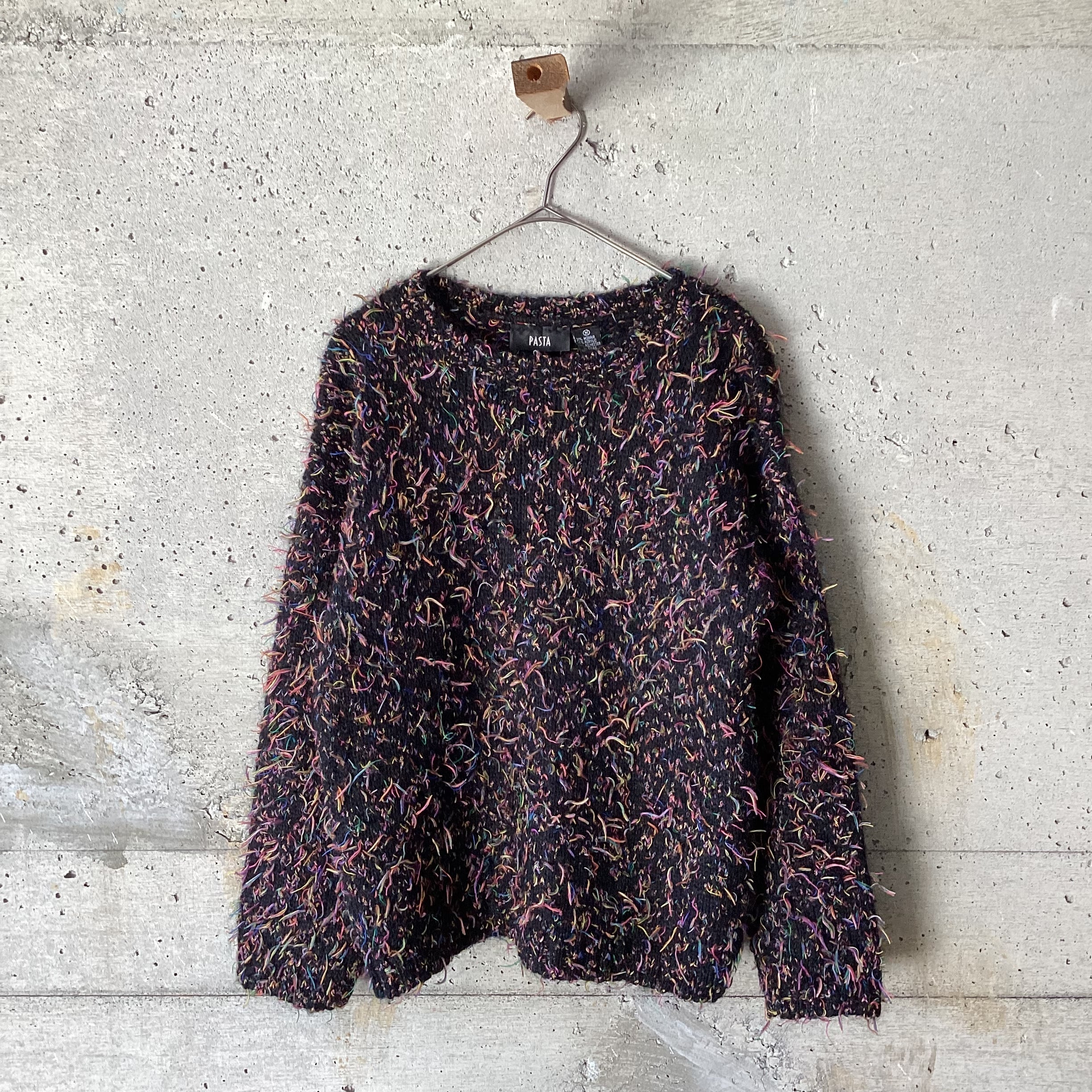 黒のボディのニットからモサモサ出る糸がカラフルで素敵です