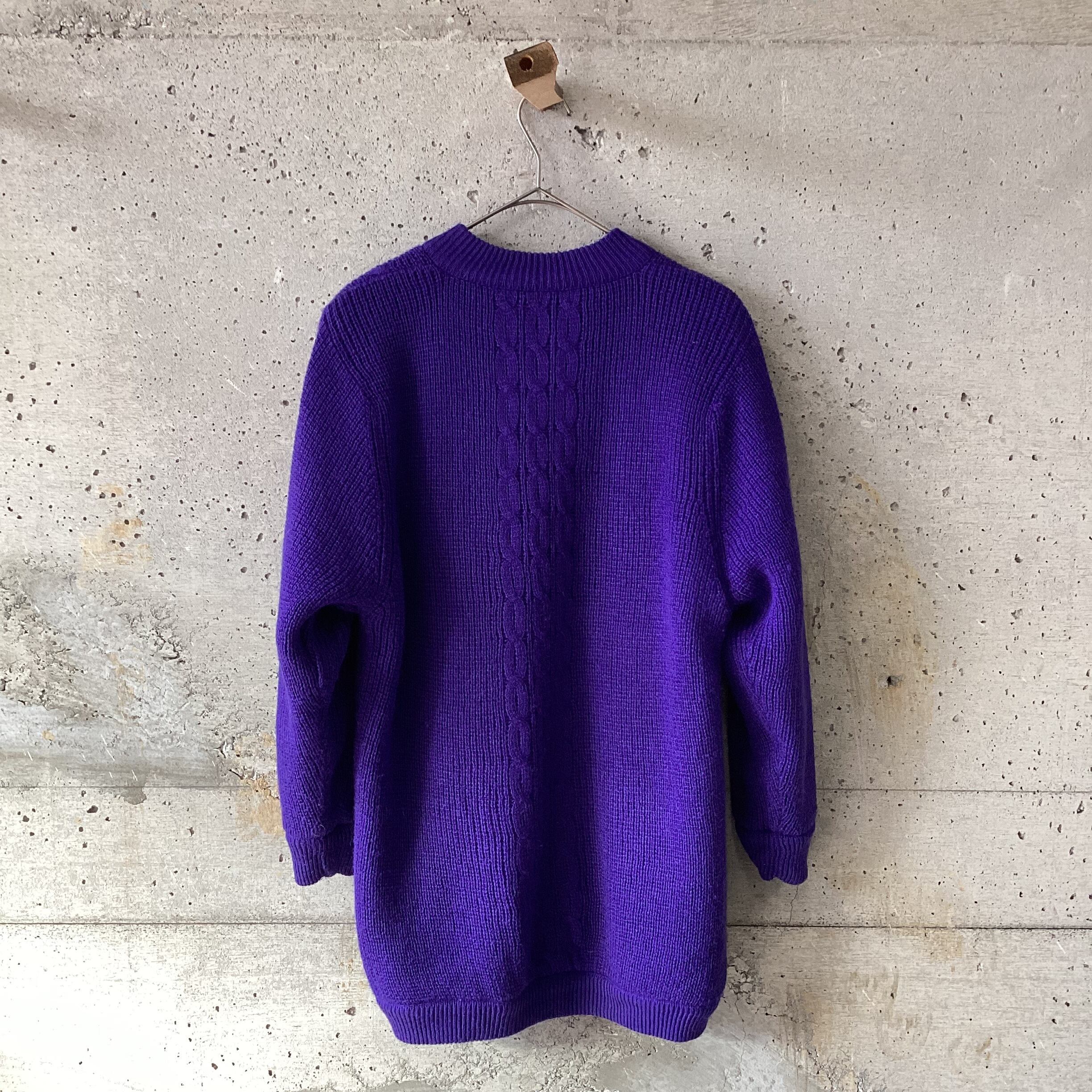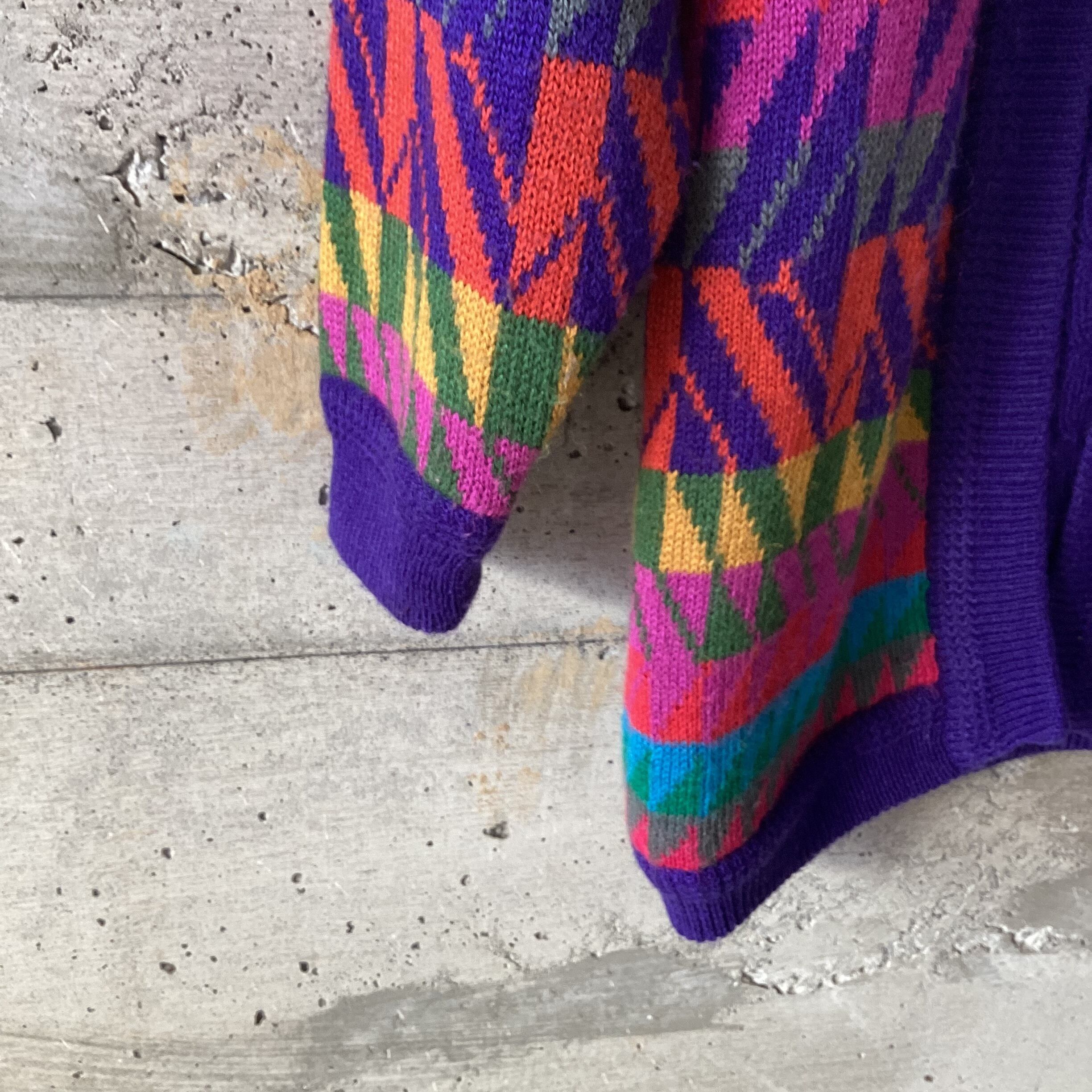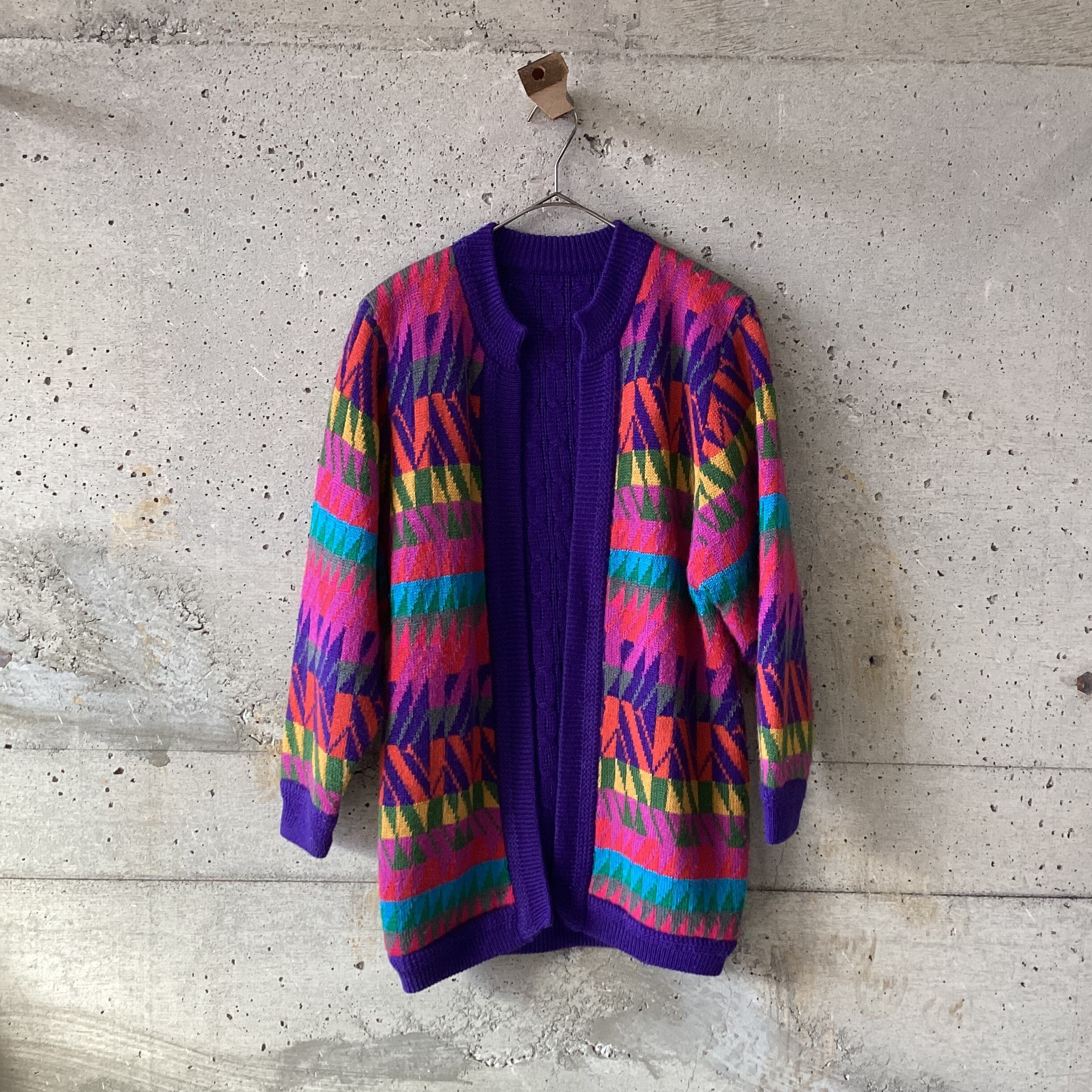 カラフル面と紫の面と楽しめるリバーシブルのニットカーディガンです