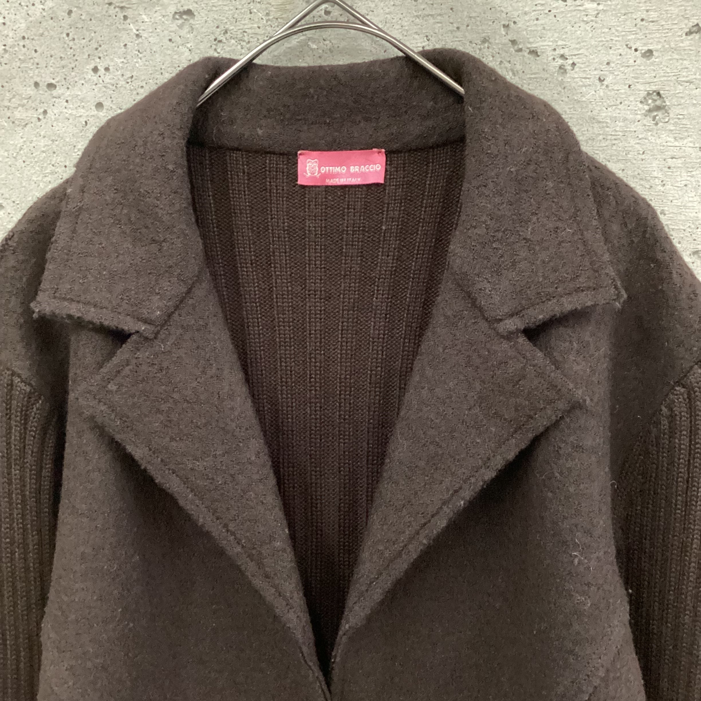 リブ編み部分と圧縮されたウールとの切り替えになった凝ったデザインのカーディガンです