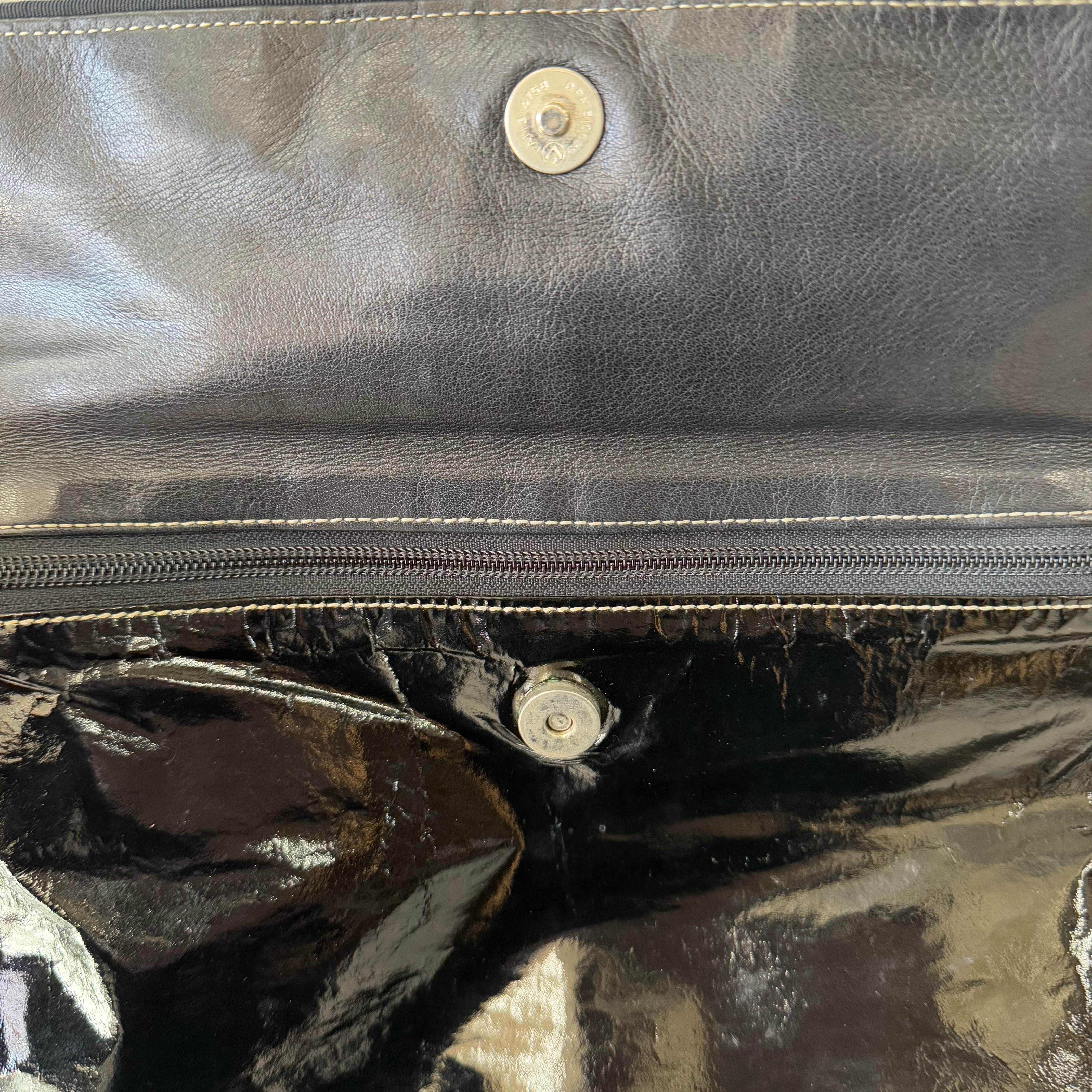 エナメル素材のぺったりとしたフォルムが特徴的なバッグ。