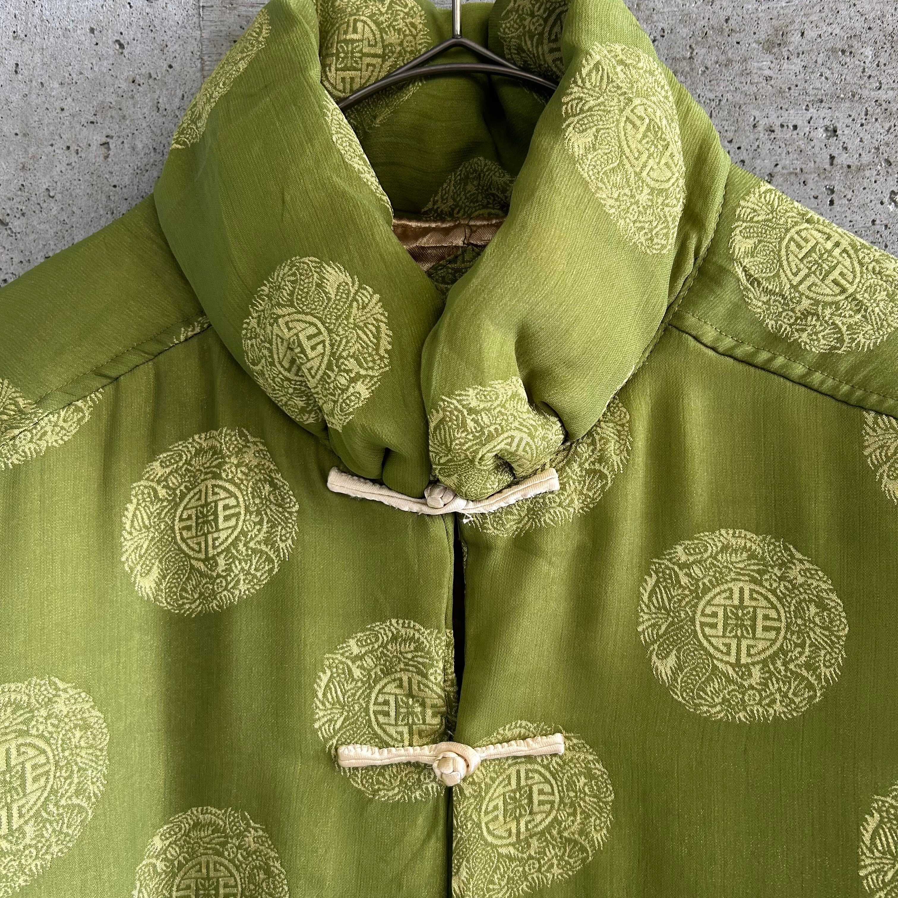 クリーム色のチャイナボタンが可愛く、黄緑のボディによく映えます。